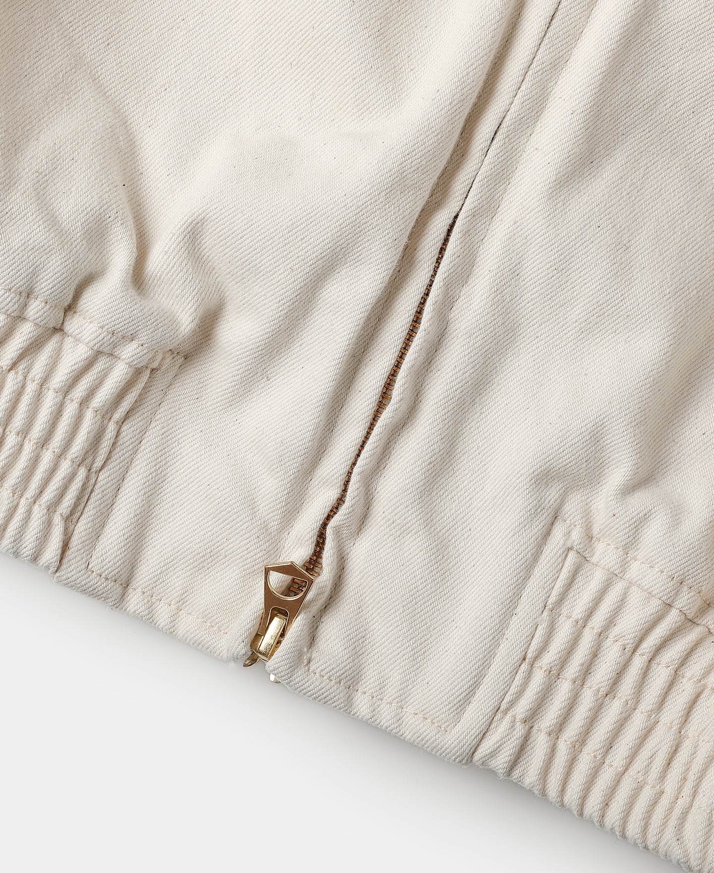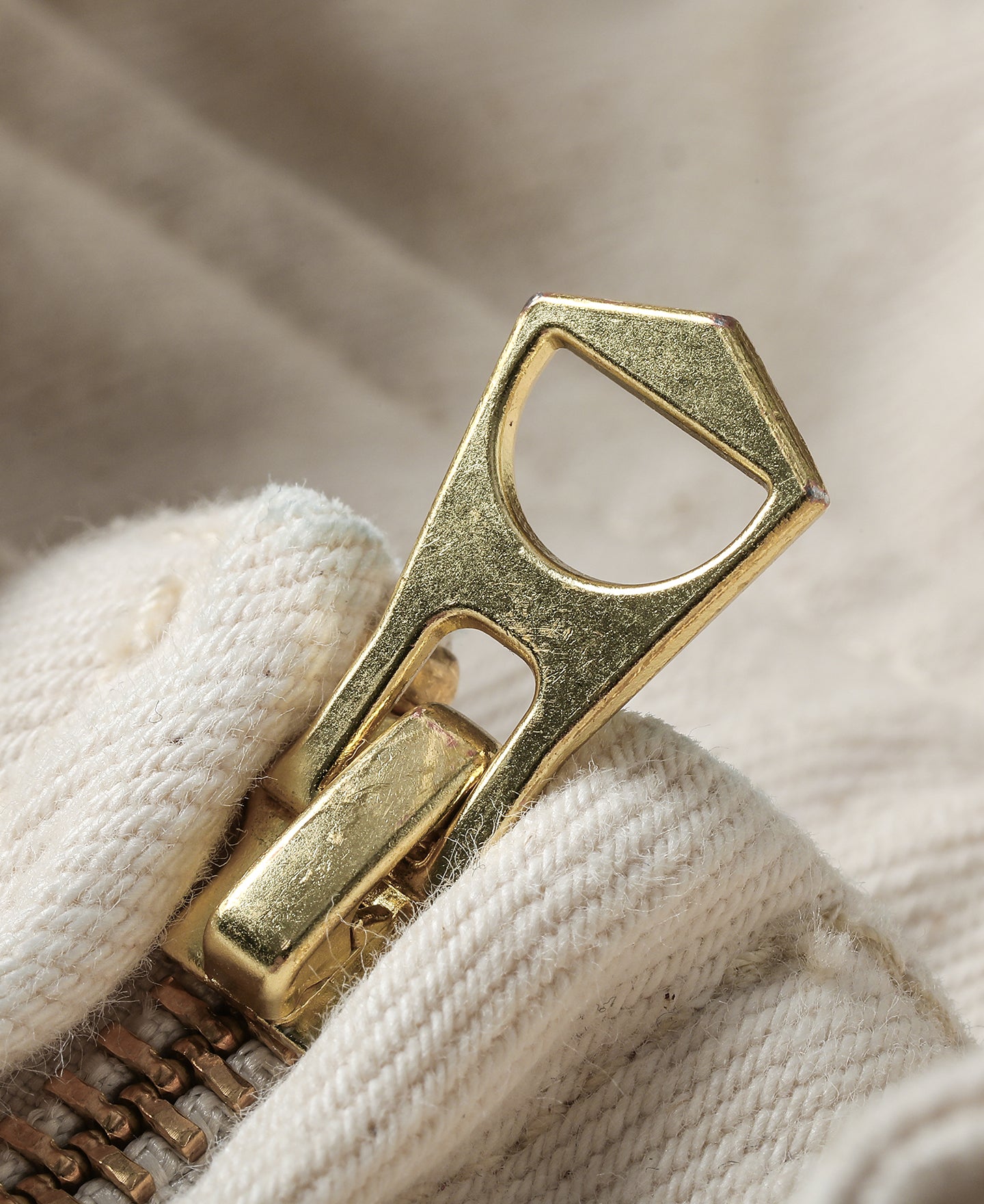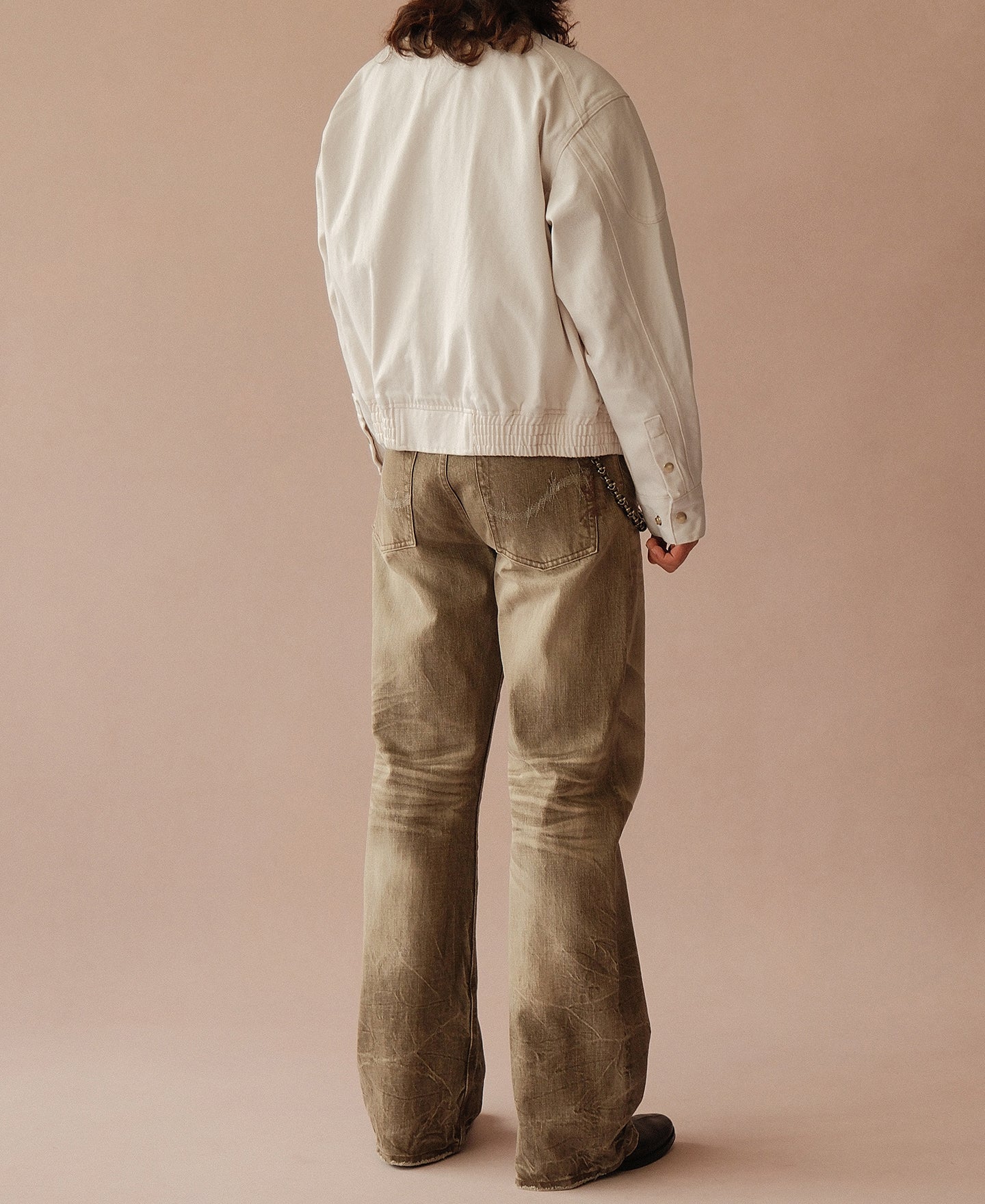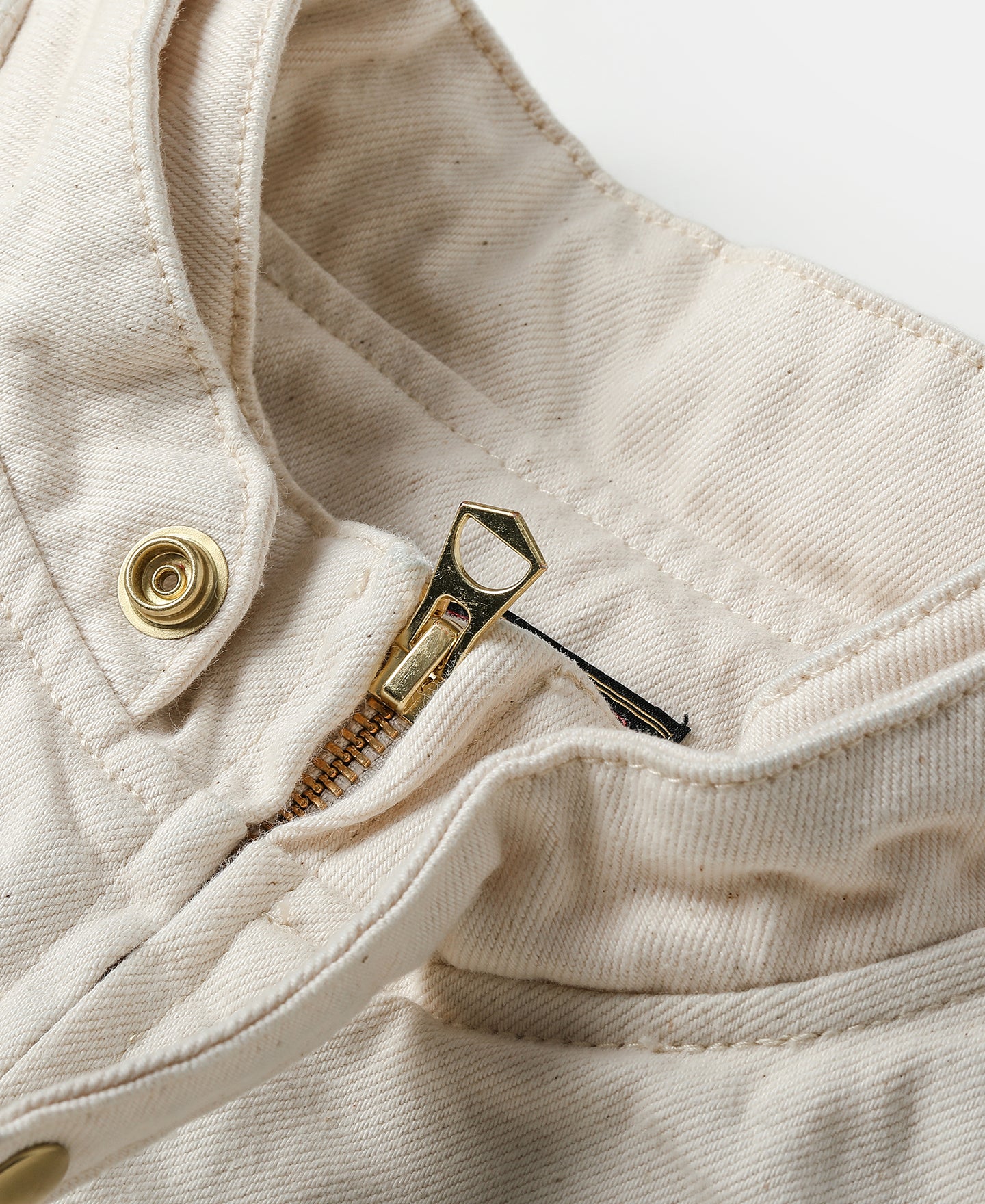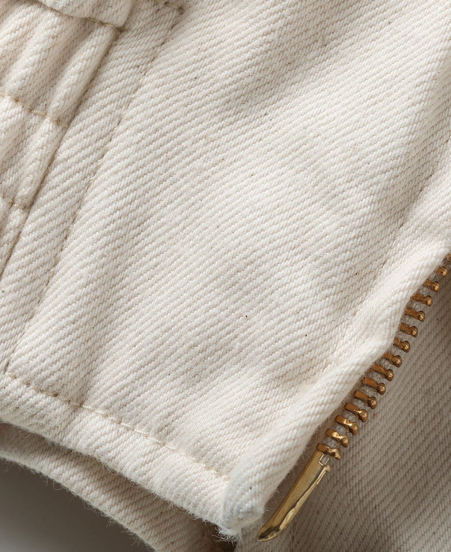 Crafted from a 14oz undyed selvedge denim (100% cotton), this jacket uses pre-washed slub-woven cellulose yarn, giving it a rich, weighty drape and a supple hand feel. The surface retains visible cotton husks, preserving the raw, honest texture of the fabric. Medium-weight and unlined, the jacket allows the fabric’s natural drape to express itself.