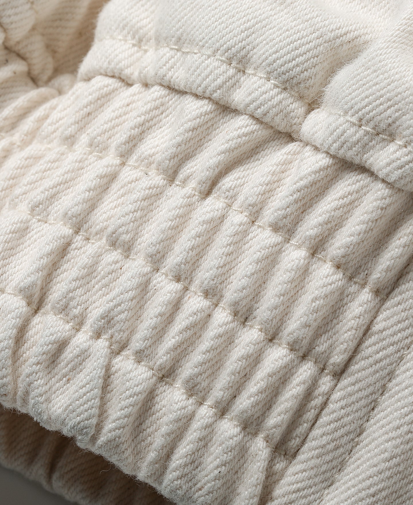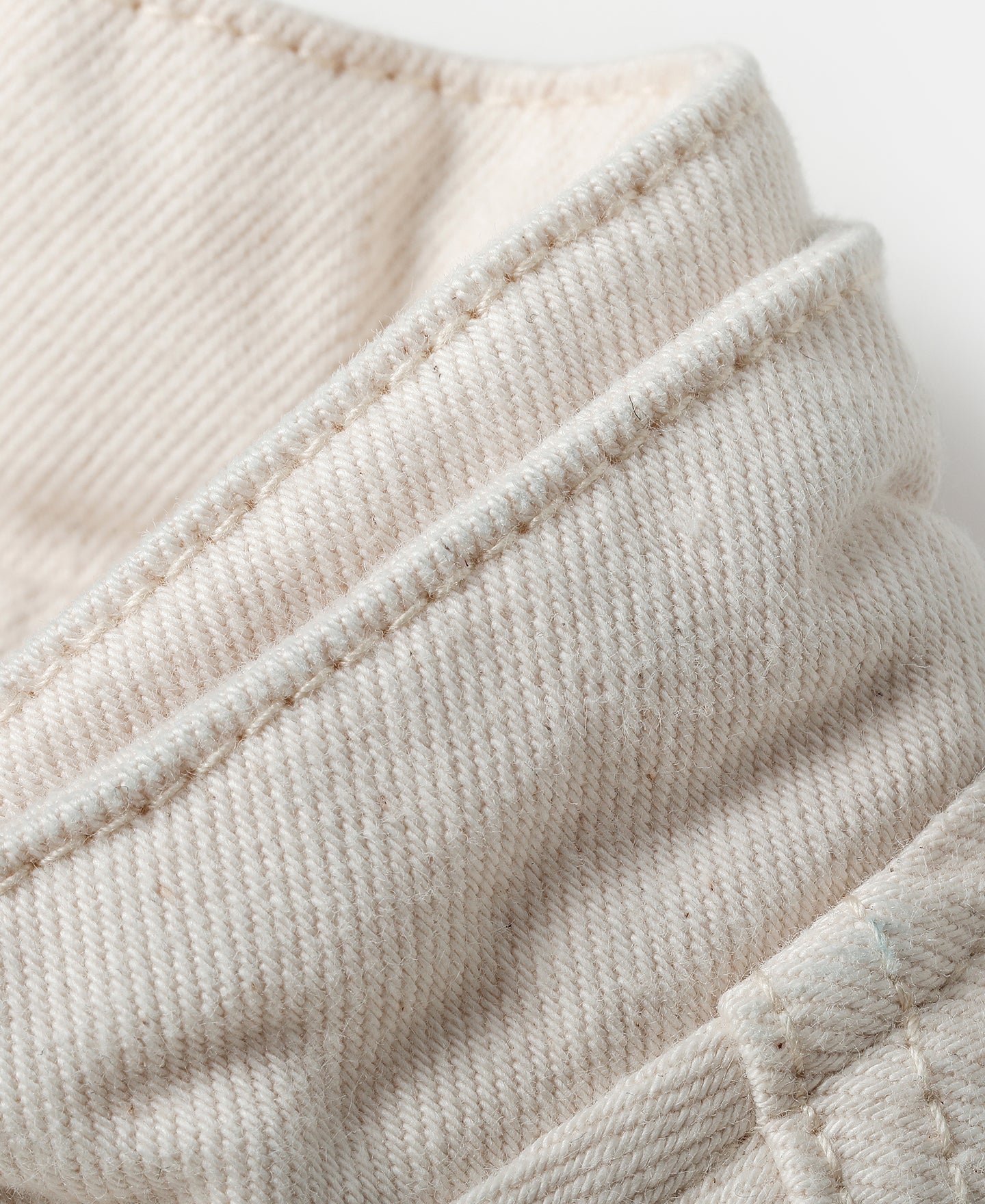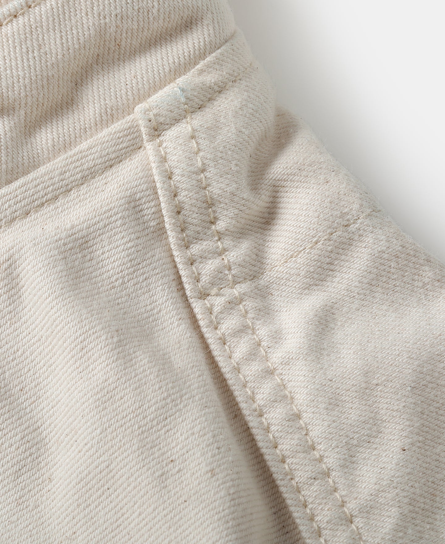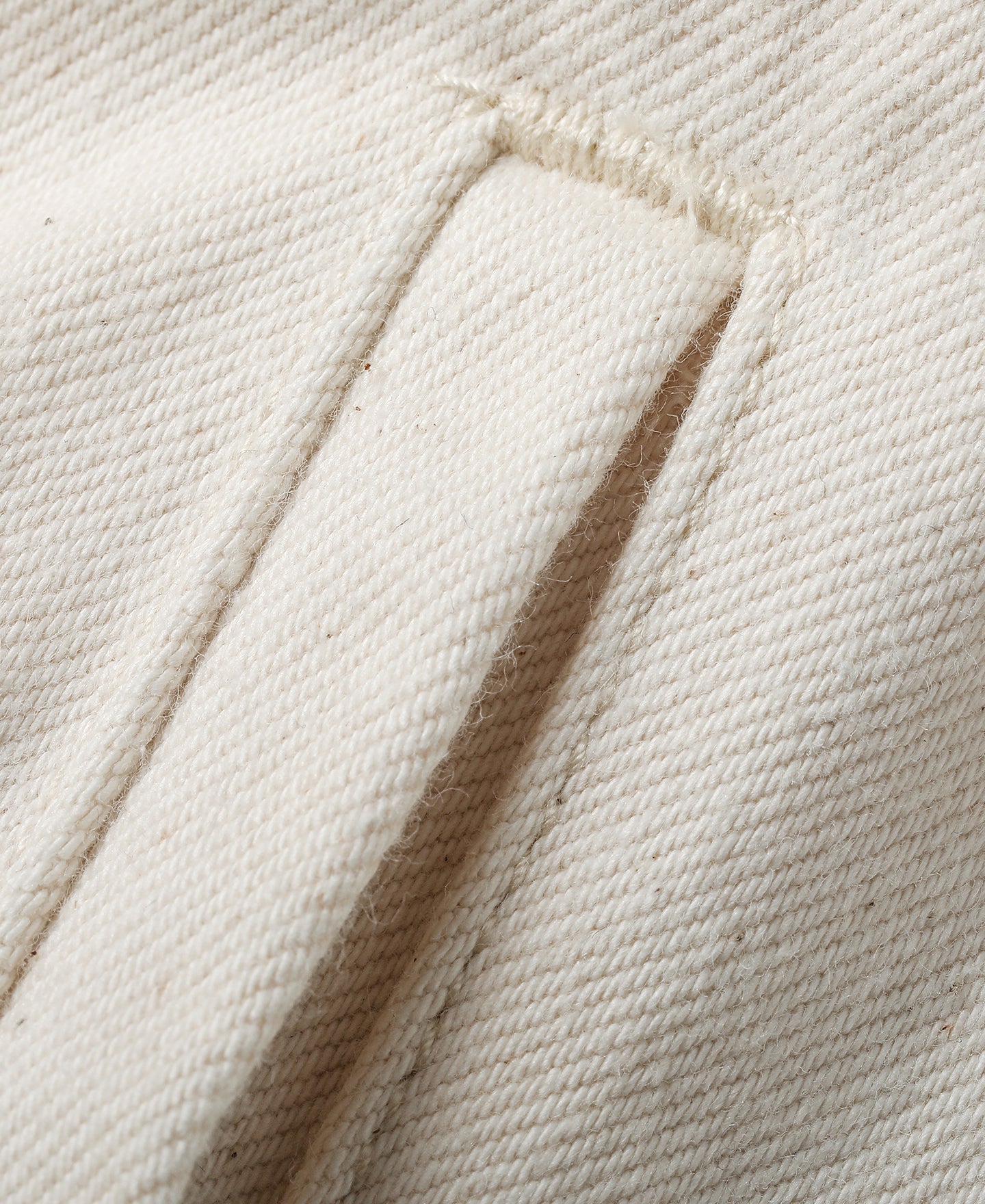 Crafted from a 14oz undyed selvedge denim (100% cotton), this jacket uses pre-washed slub-woven cellulose yarn, giving it a rich, weighty drape and a supple hand feel. The surface retains visible cotton husks, preserving the raw, honest texture of the fabric. Medium-weight and unlined, the jacket allows the fabric’s natural drape to express itself. -
