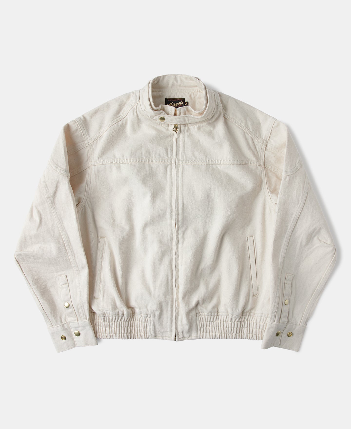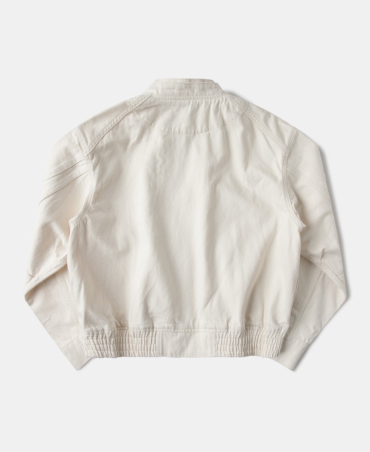 Inspired by the iconic Drizzler Harrington jacket, this piece blends vintage athletic cuts with subtle motorcycle detailing. It features a cropped body and extended sleeves for a sporty silhouette, complemented by a band collar with a throat latch that adds a nod to classic riding jackets.