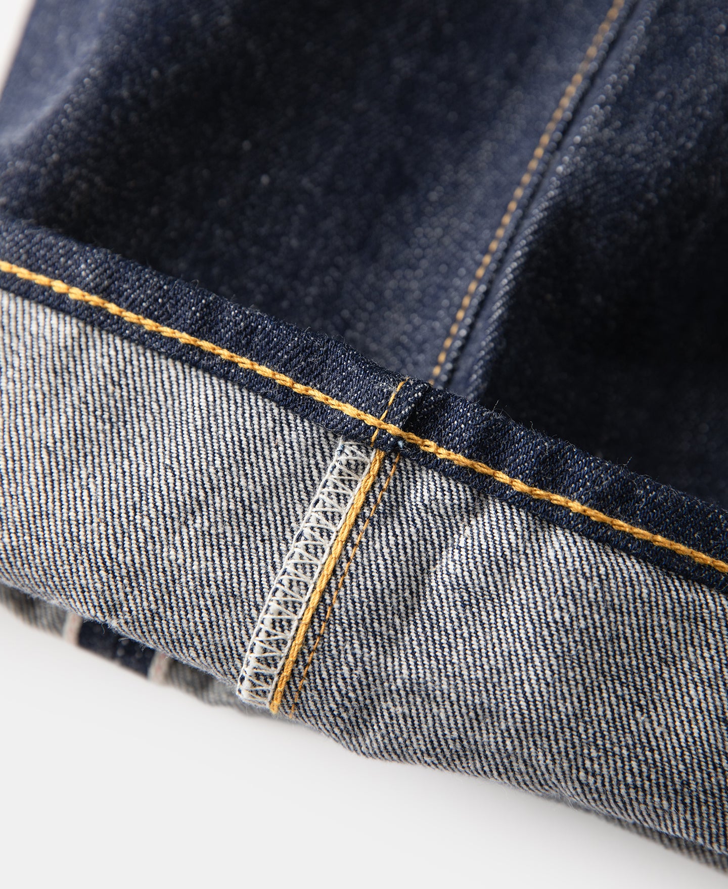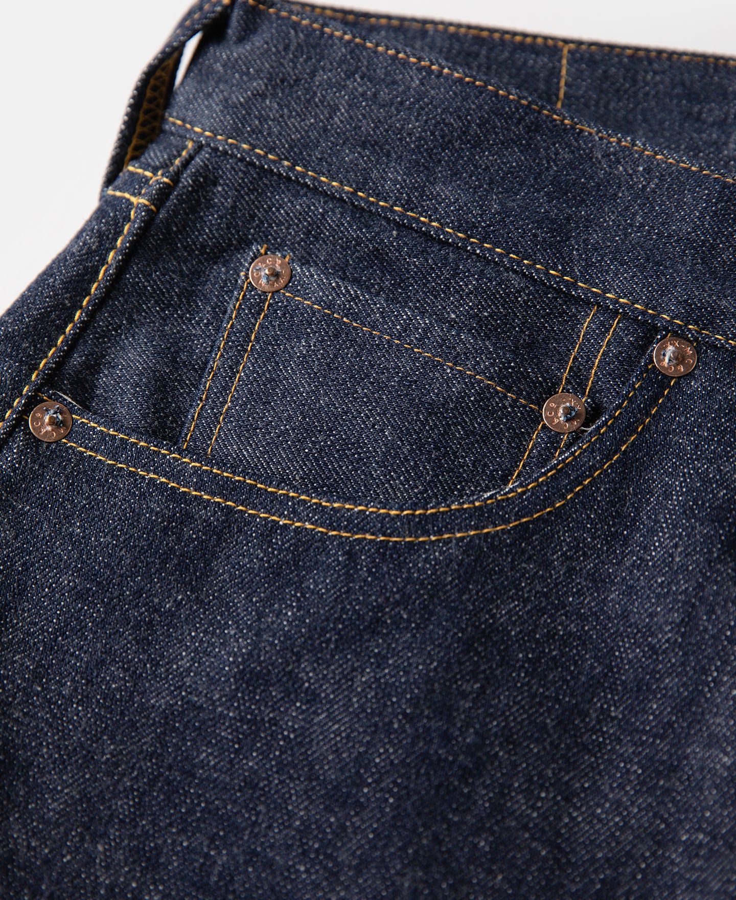 Crafted from 14.5oz unsanforized selvedge denim, this 1947-inspired regular straight fit captures the essence of the post-war era. Featuring copper button bases and copper-iron rivets, with notable shrinkage after wash.