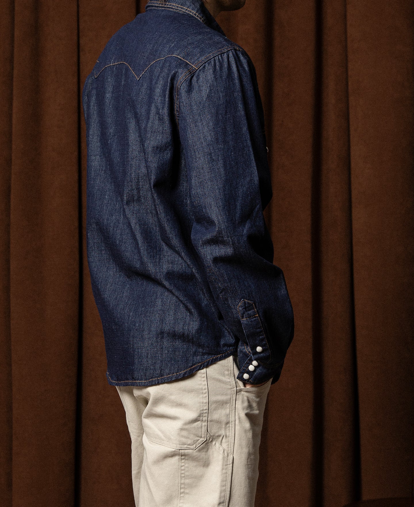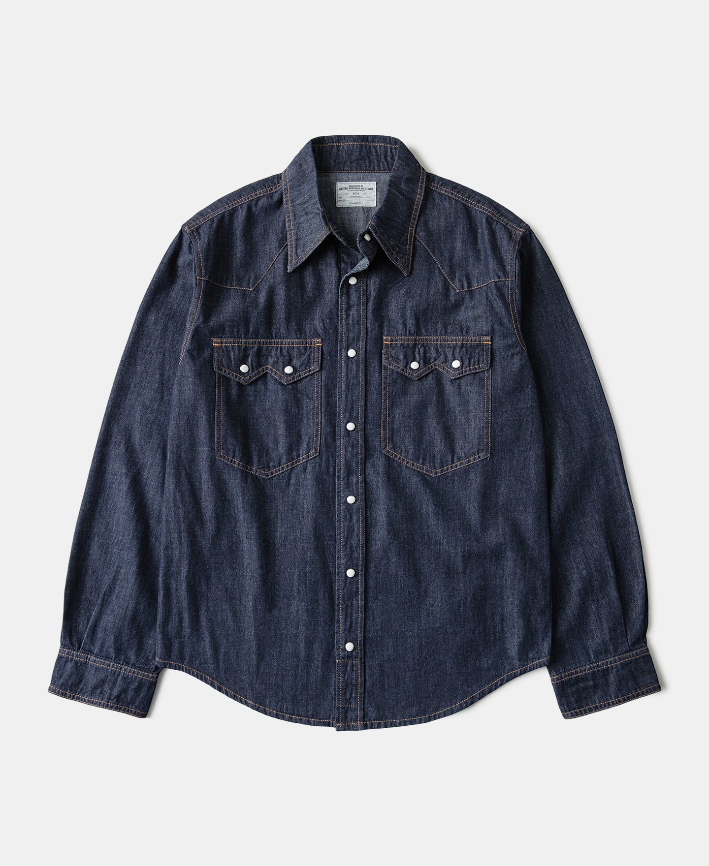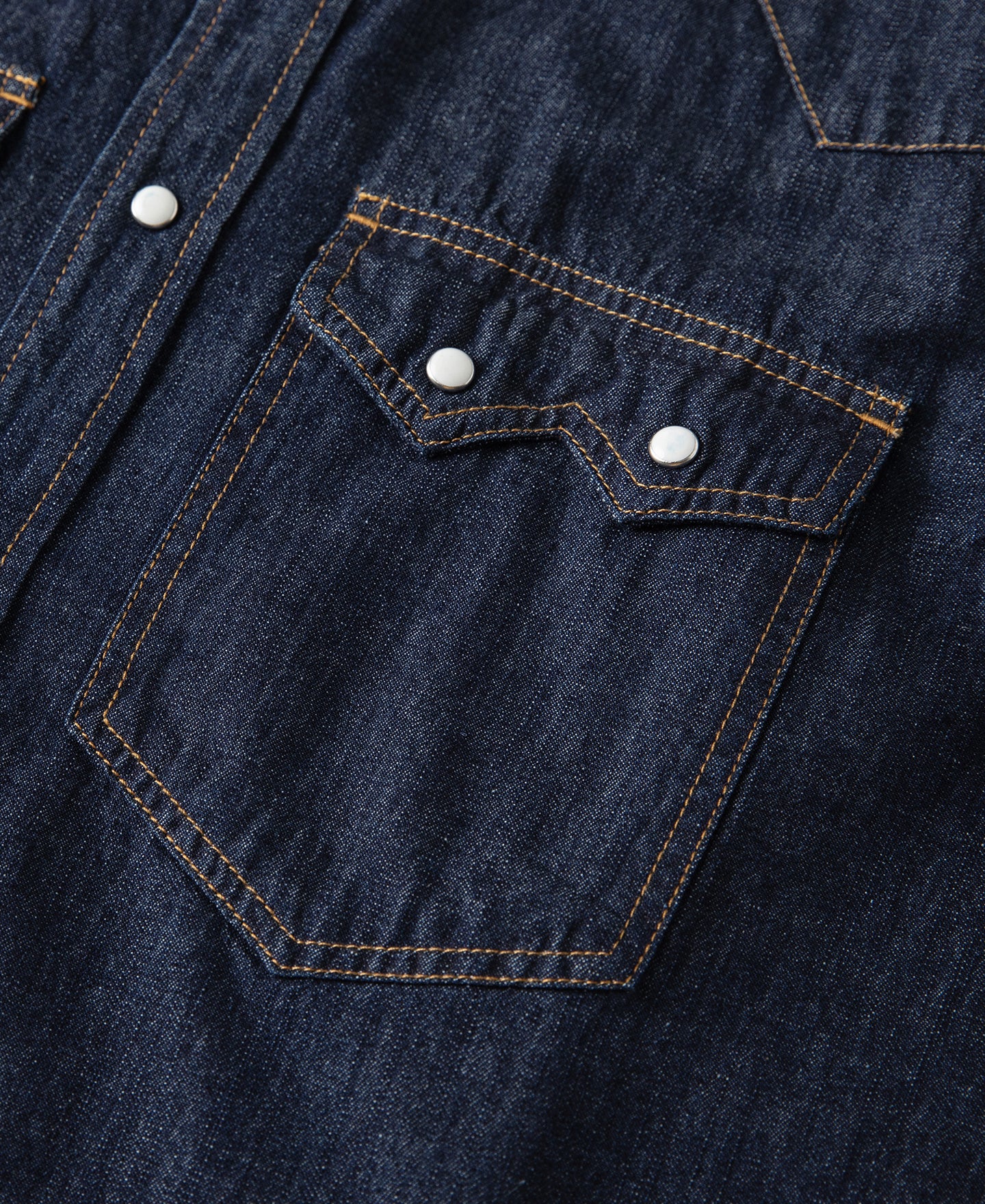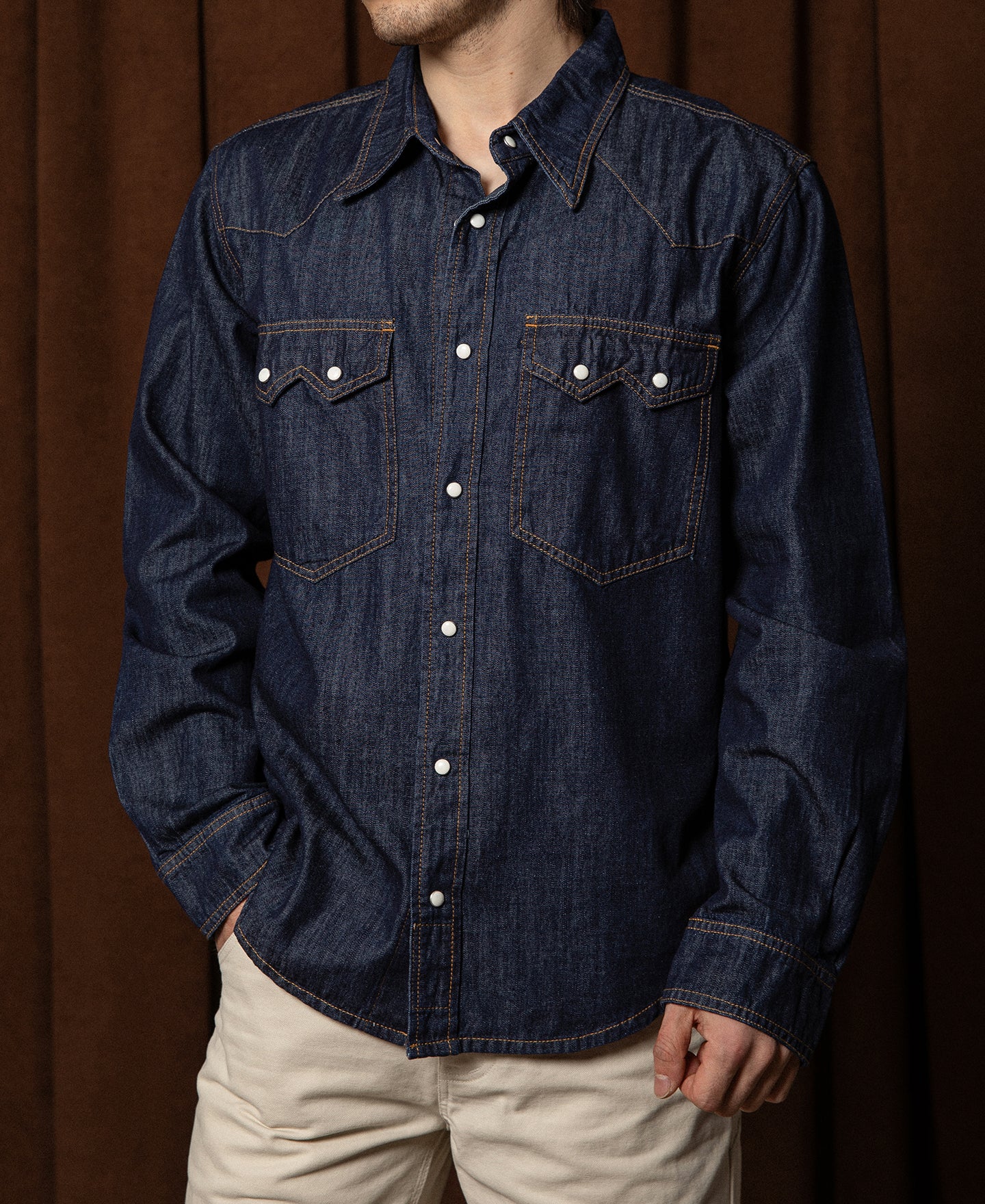 A classic Western shirt made from soft 210g slub denim. Lightweight and breathable, available in three washes—light wash, heavy wash, and dark indigo. It features signature pointed Western yoke stitching, faux pearl snap buttons, and sawtooth pocket flaps for an authentic vintage cowboy look—minus the embroidery.