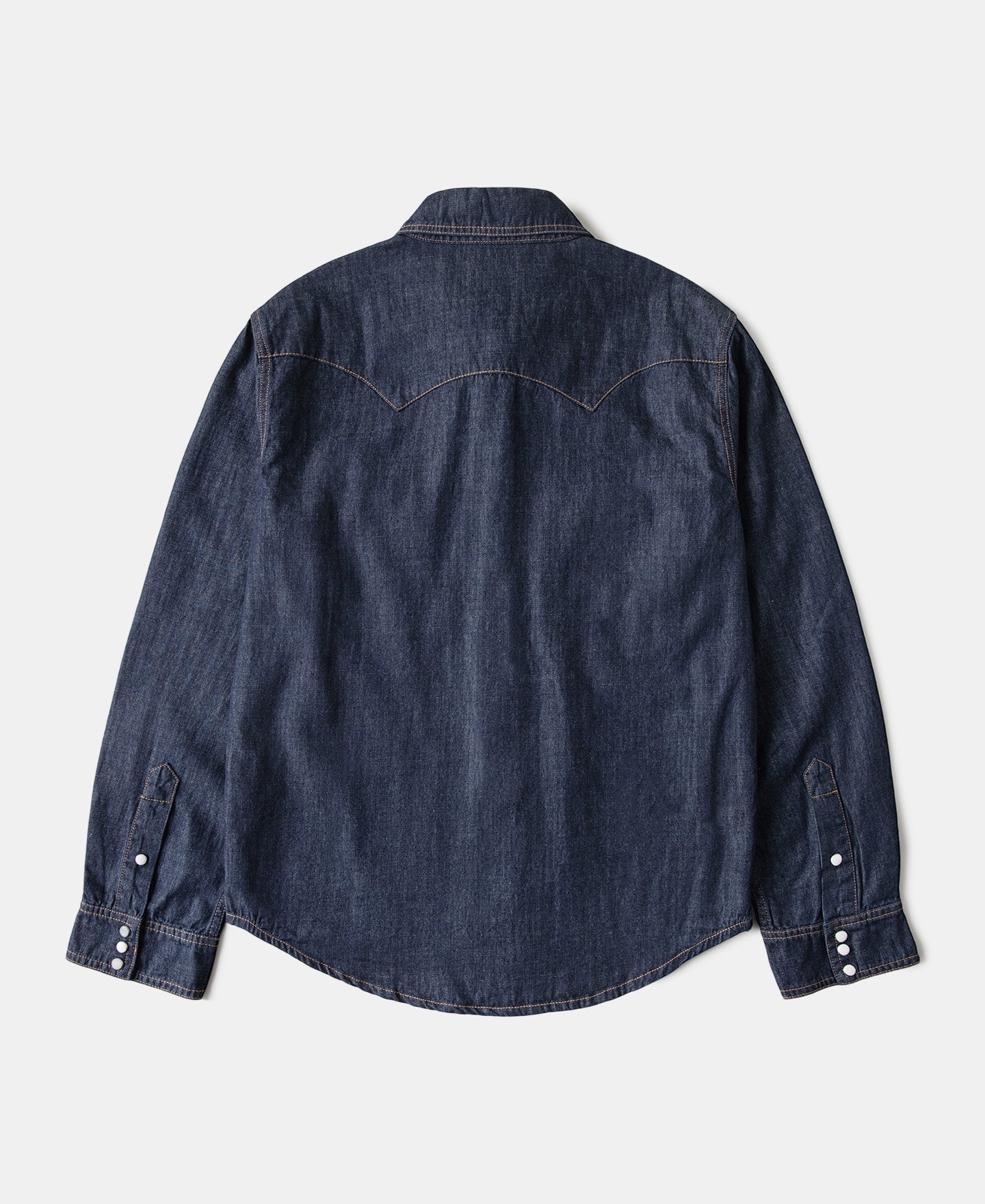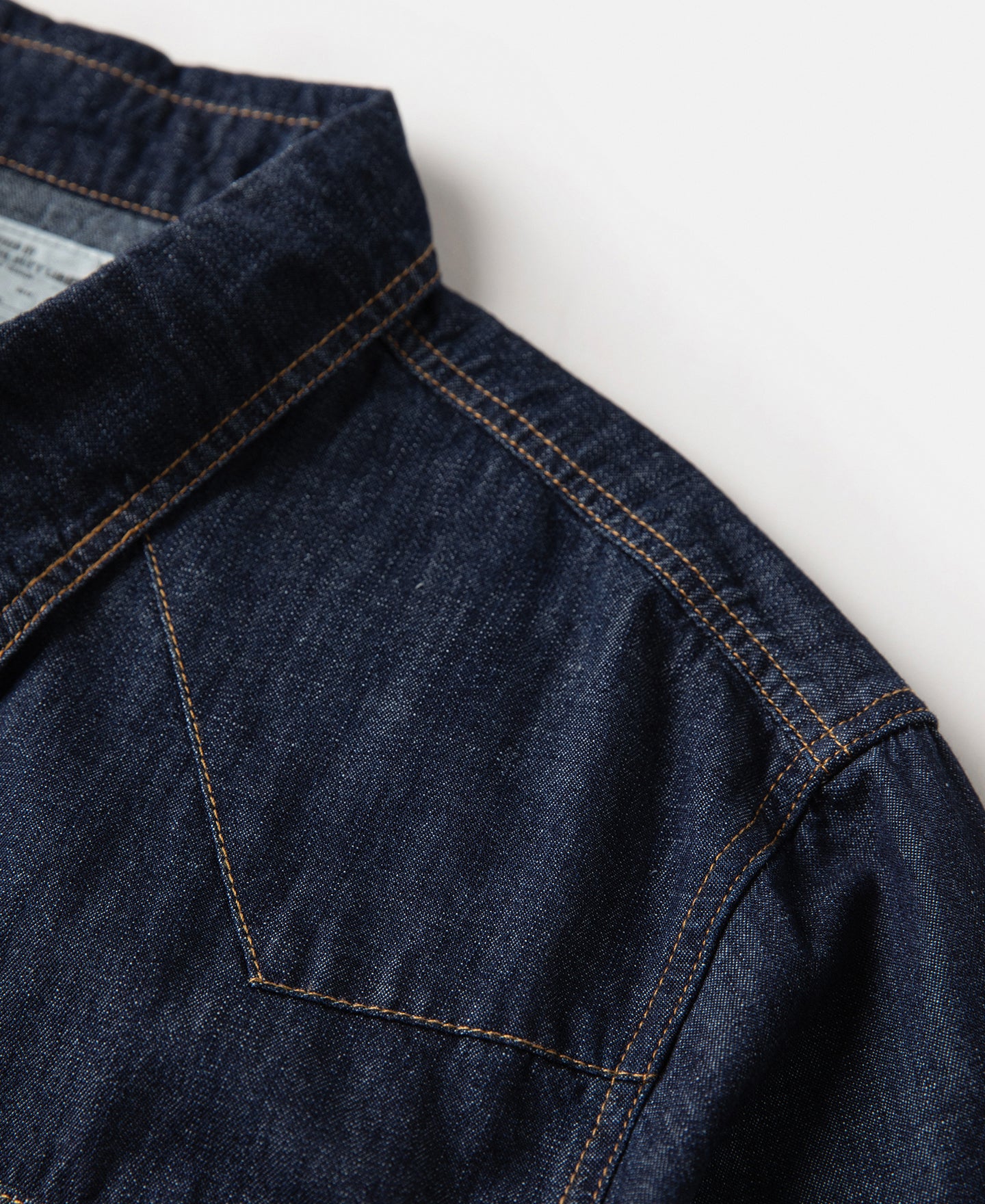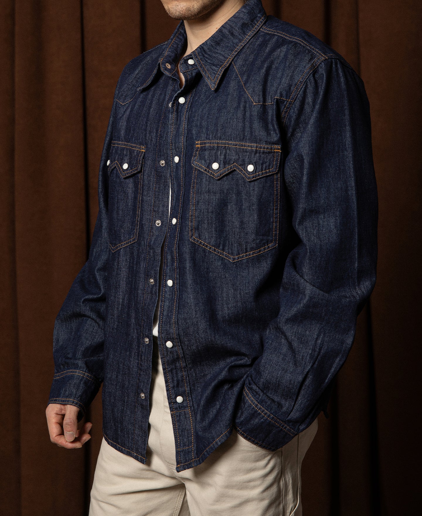 A classic Western shirt made from soft 210g slub denim. Lightweight and breathable, available in three washes—light wash, heavy wash, and dark indigo. It features signature pointed Western yoke stitching, faux pearl snap buttons, and sawtooth pocket flaps for an authentic vintage cowboy look—minus the embroidery.