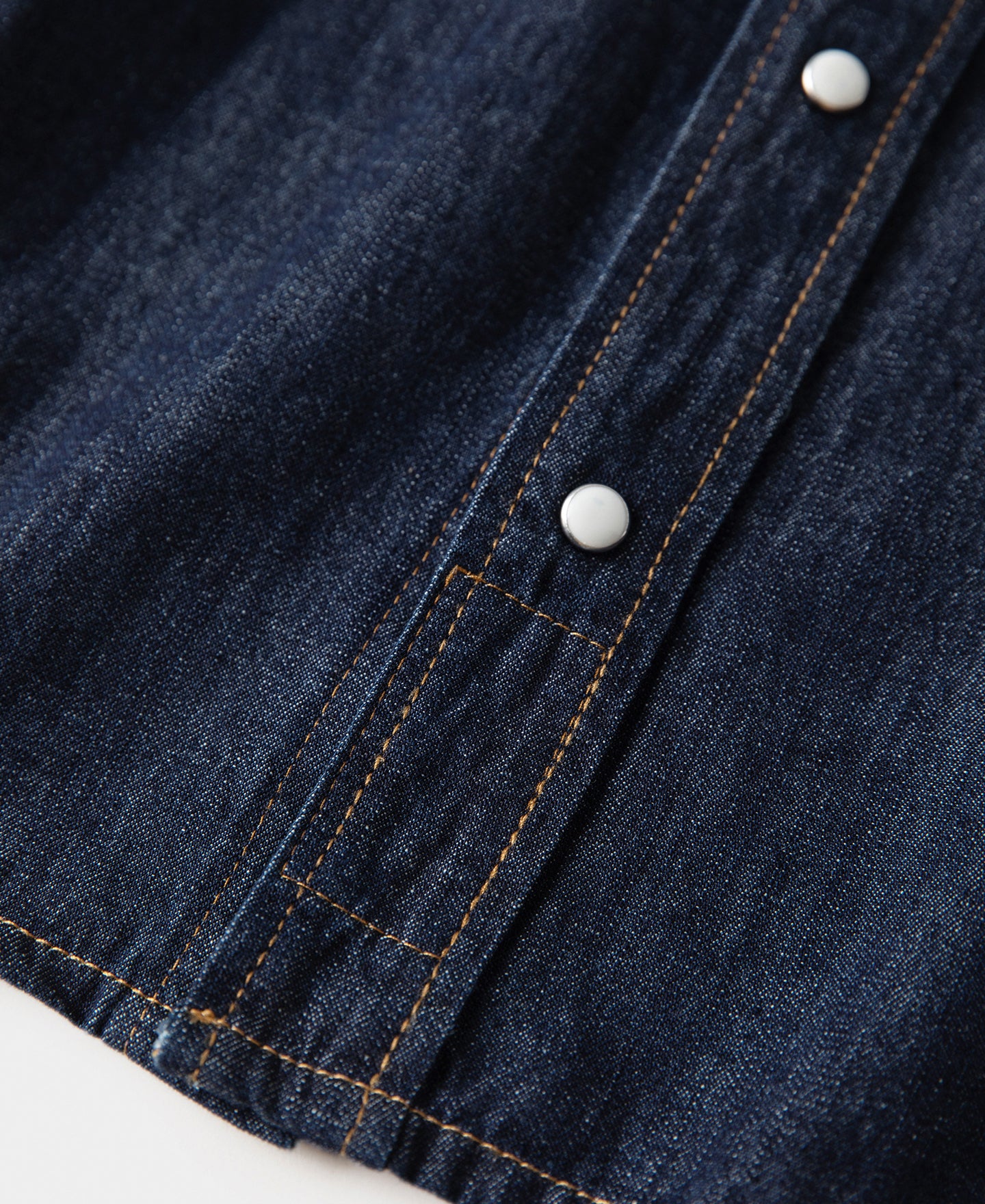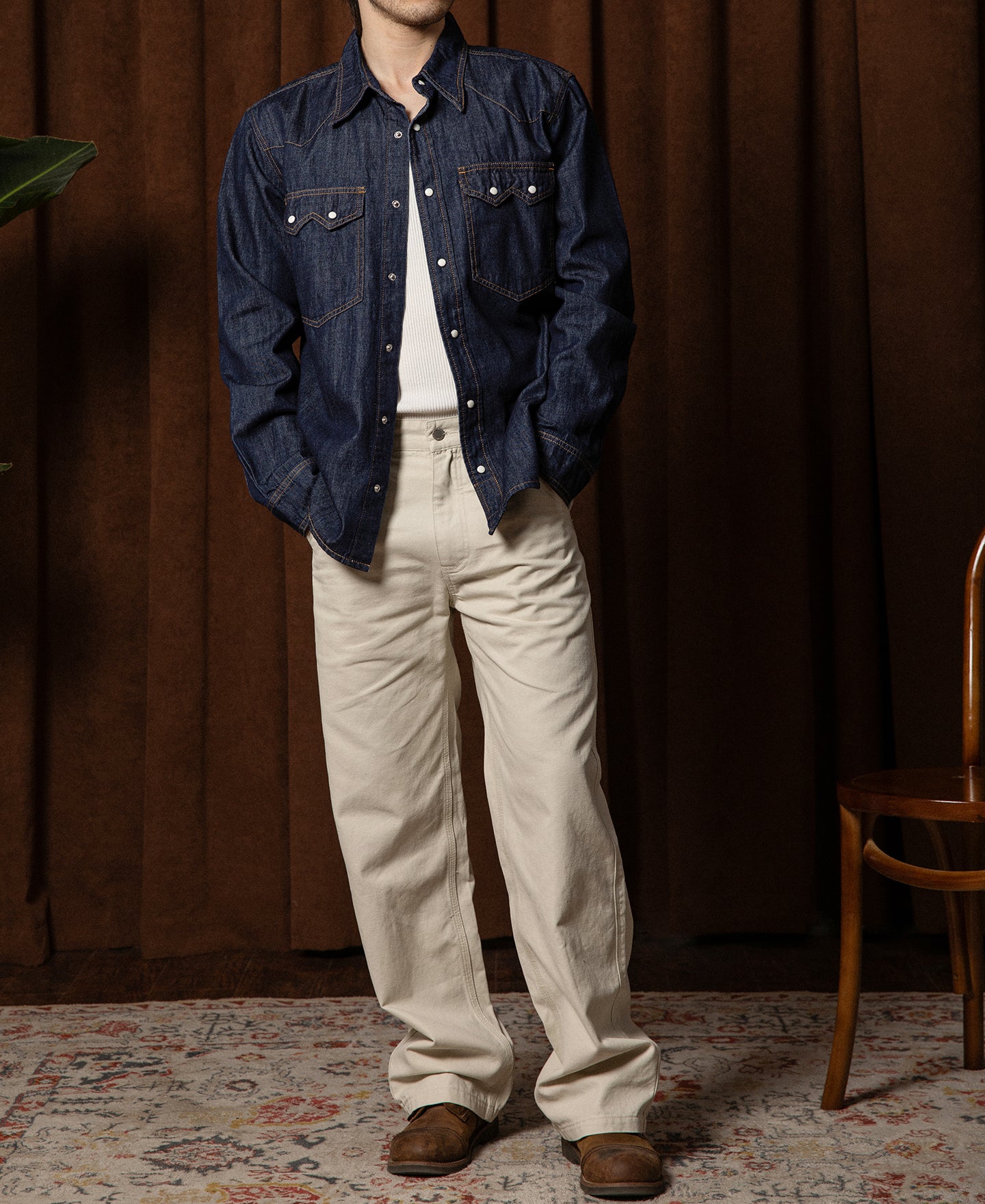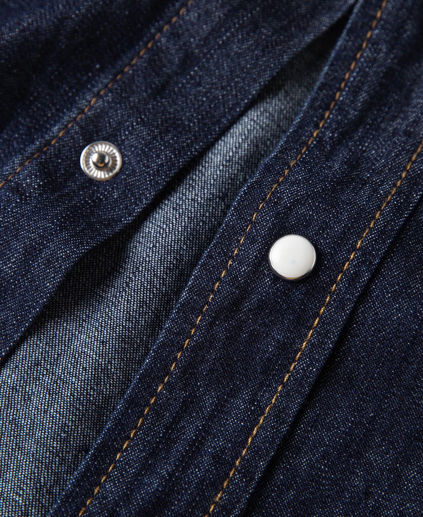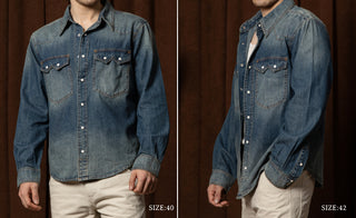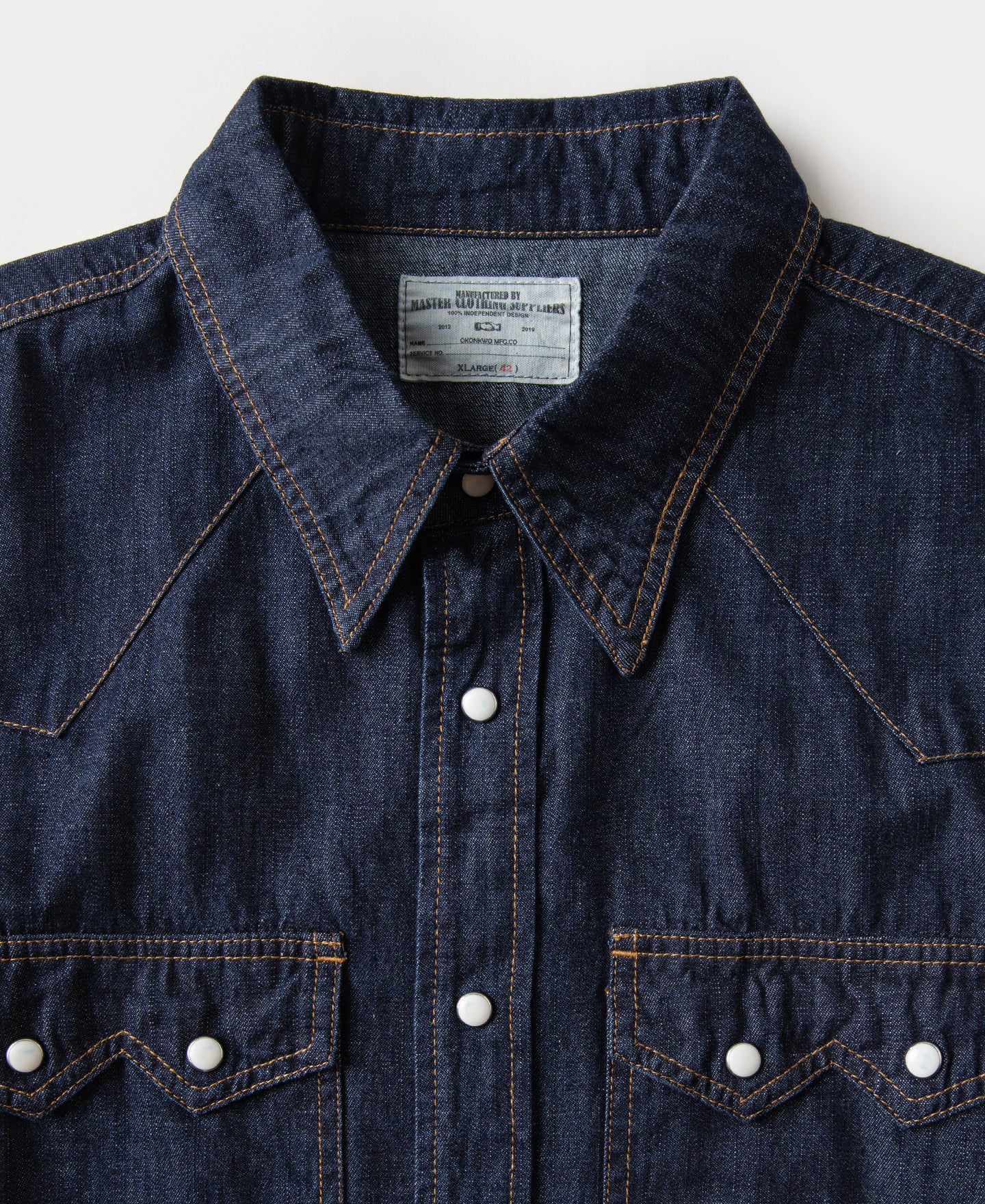 A classic Western shirt made from soft 210g slub denim. Lightweight and breathable, available in three washes—light wash, heavy wash, and dark indigo. It features signature pointed Western yoke stitching, faux pearl snap buttons, and sawtooth pocket flaps for an authentic vintage cowboy look—minus the embroidery.