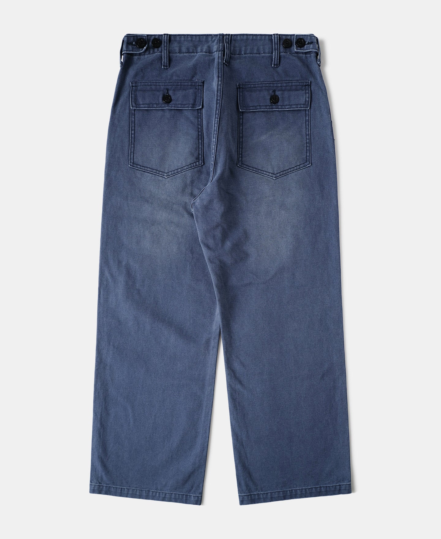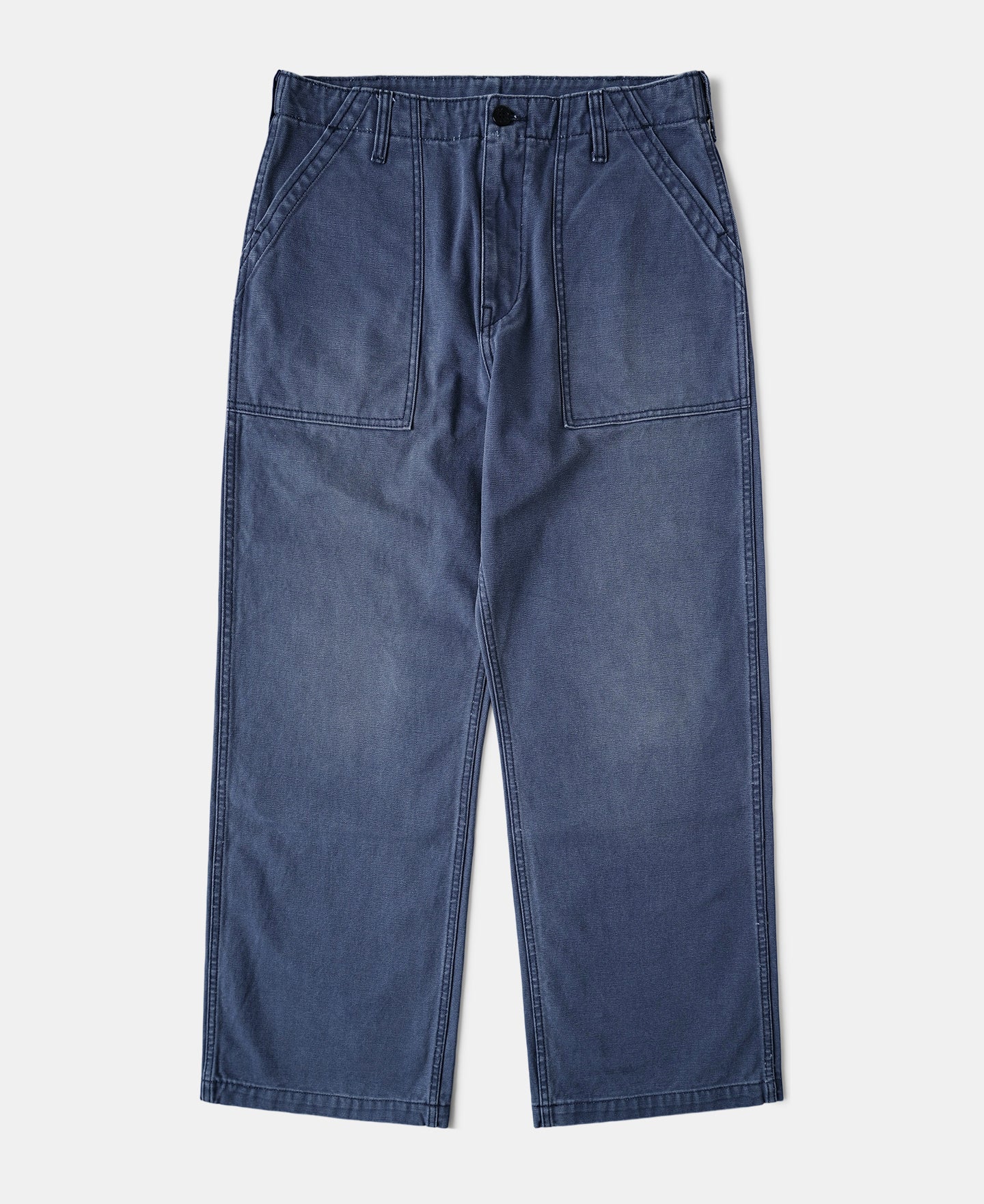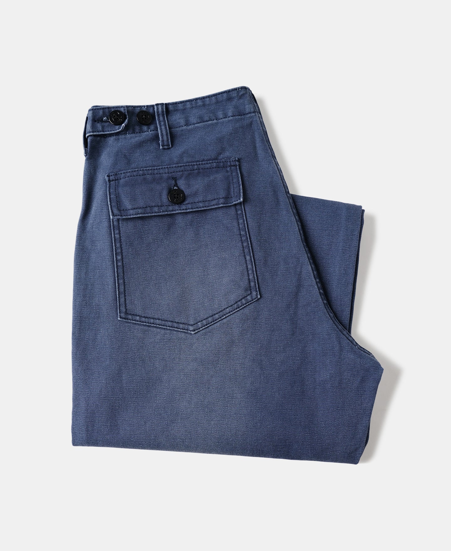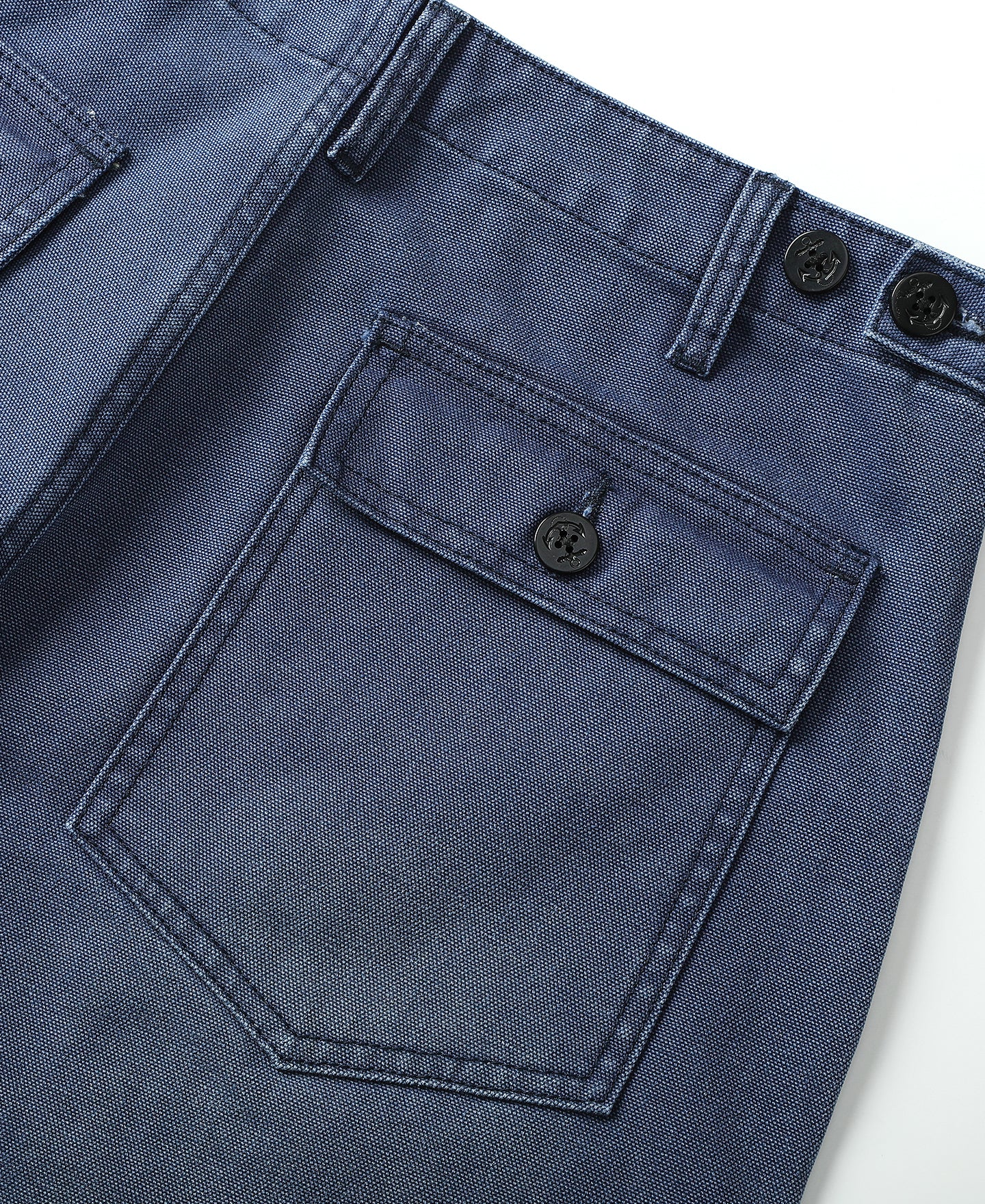 Inspired by classic OG-107 fatigue pants, this pair features a clean, tapered cut that retains a relaxed leg shape without excess bulk at the hips—allowing easy movement with a sharp silhouette. It's made from a custom-woven 420g cotton sateen using tightly spun ring yarns and dense weaving, finished in a specially developed grey-blue tone. Details include a bound fly for a neat finish, sailor-motif resin buttons, a YKK antique brass zipper, reinforced belt loops, and durable chain stitching at the hem and waist. Built with precision and structure, this is a timeless workwear piece ready for daily wear.