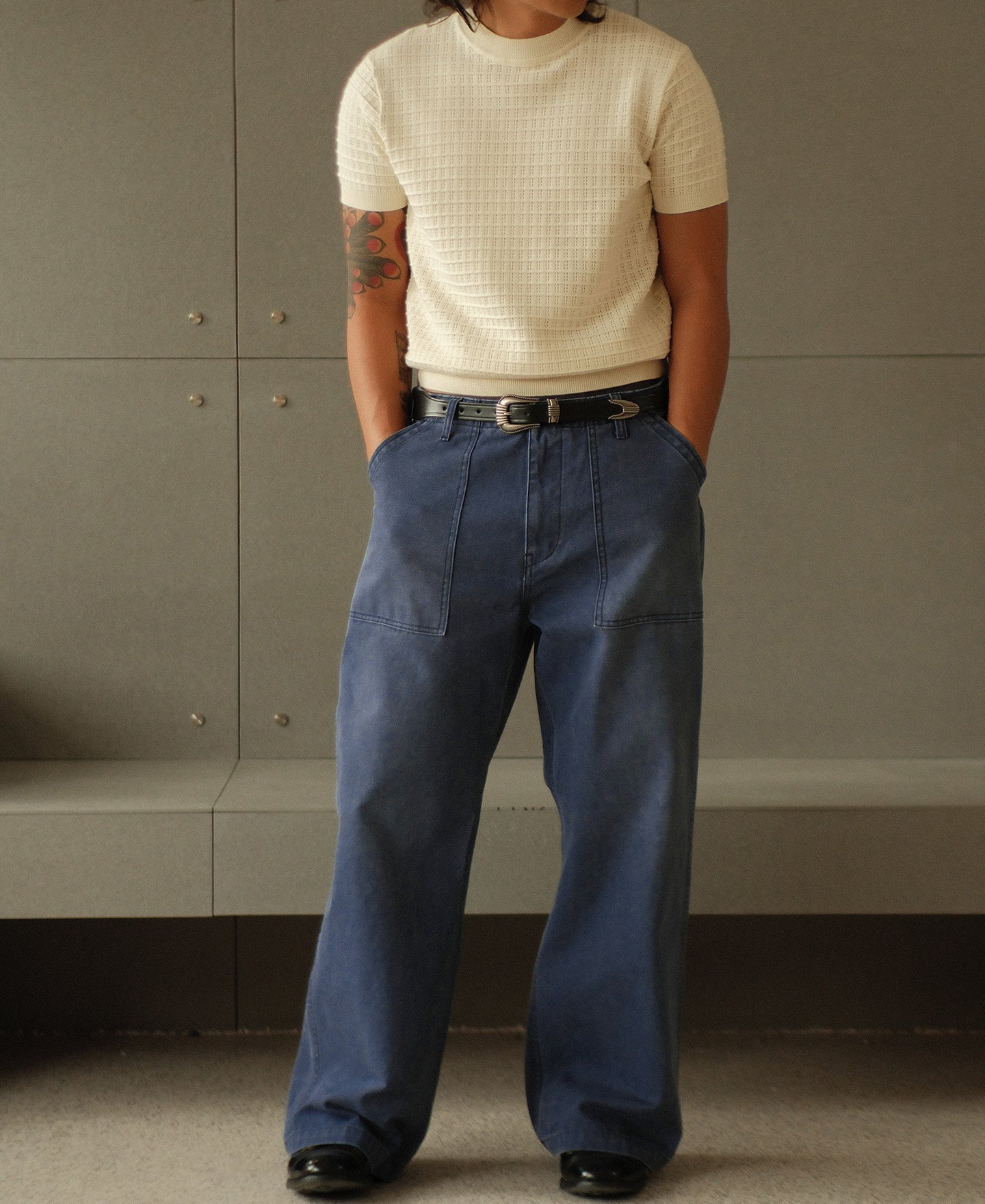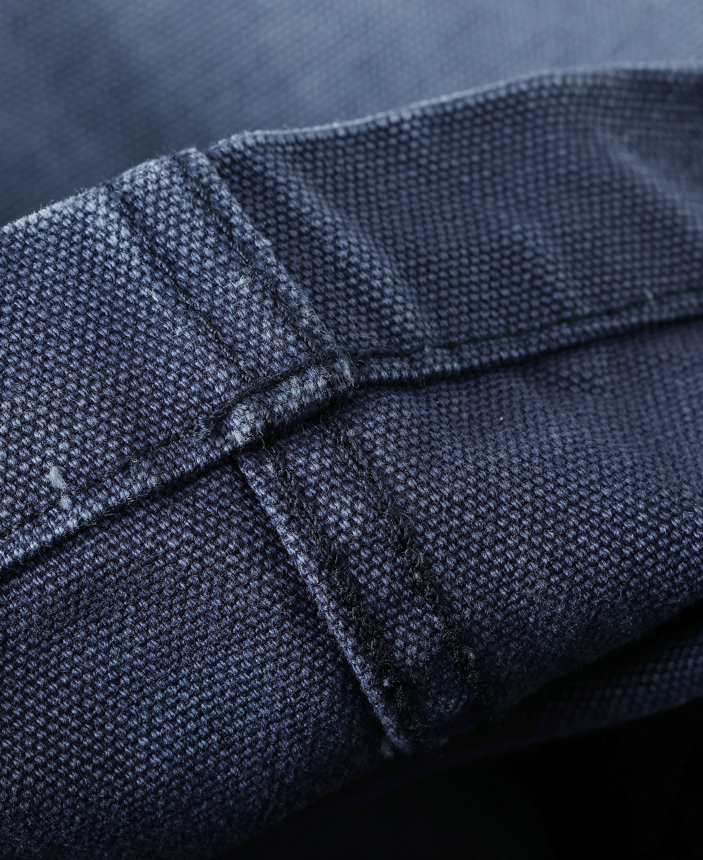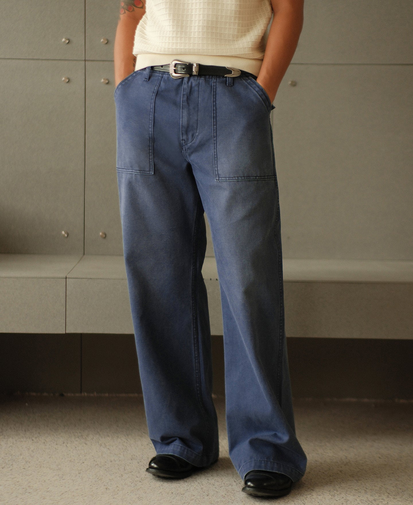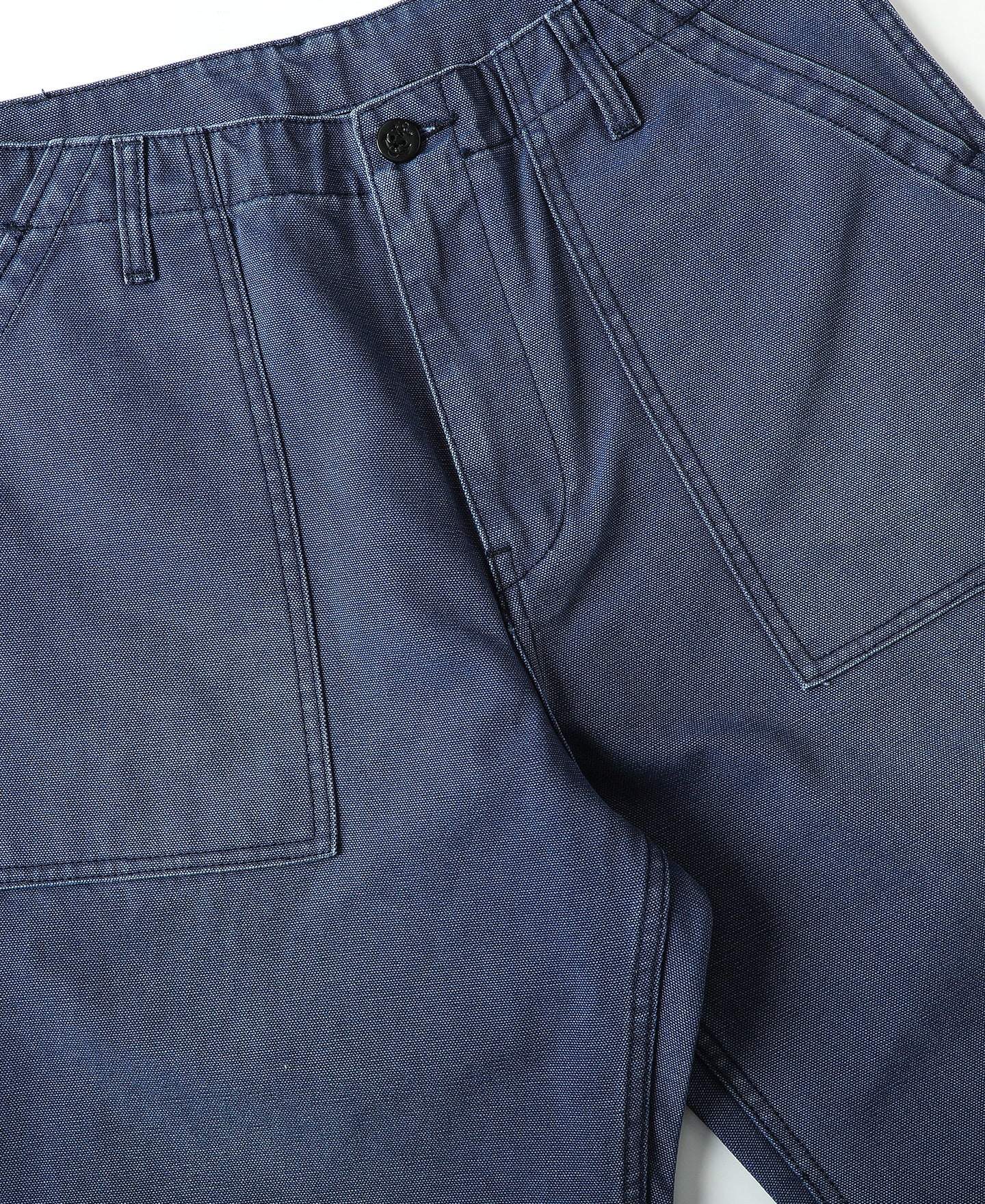 Inspired by classic OG-107 fatigue pants, this pair features a clean, tapered cut that retains a relaxed leg shape without excess bulk at the hips—allowing easy movement with a sharp silhouette. It's made from a custom-woven 420g cotton sateen using tightly spun ring yarns and dense weaving, finished in a specially developed grey-blue tone. Details include a bound fly for a neat finish, sailor-motif resin buttons, a YKK antique brass zipper, reinforced belt loops, and durable chain stitching at the hem and waist. Built with precision and structure, this is a timeless workwear piece ready for daily wear.
