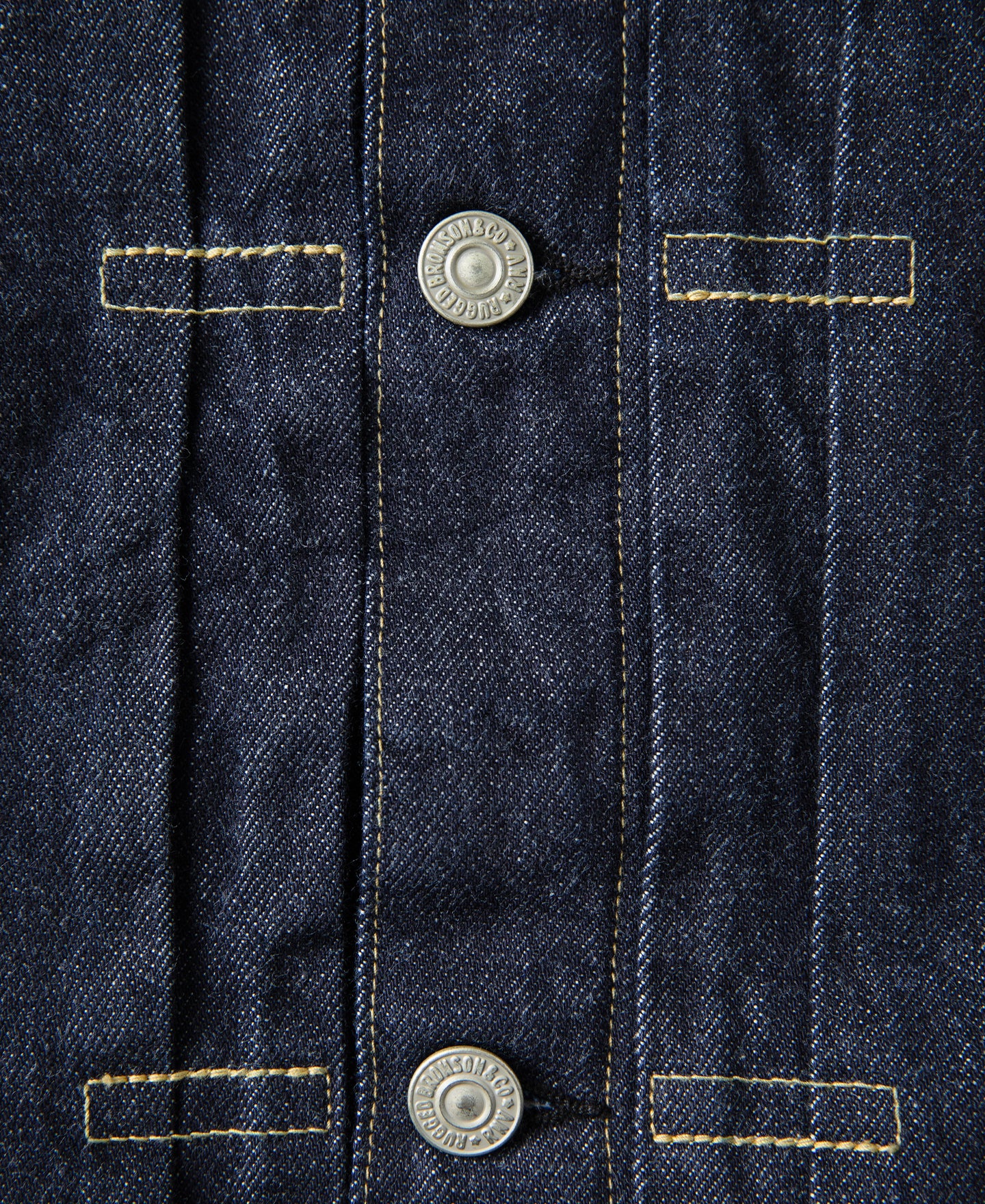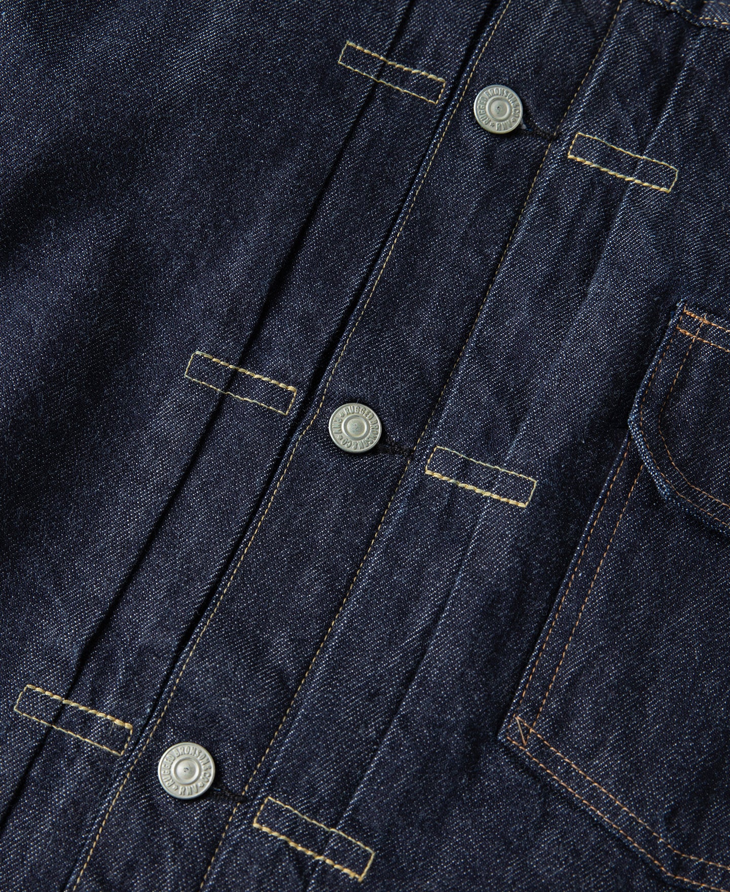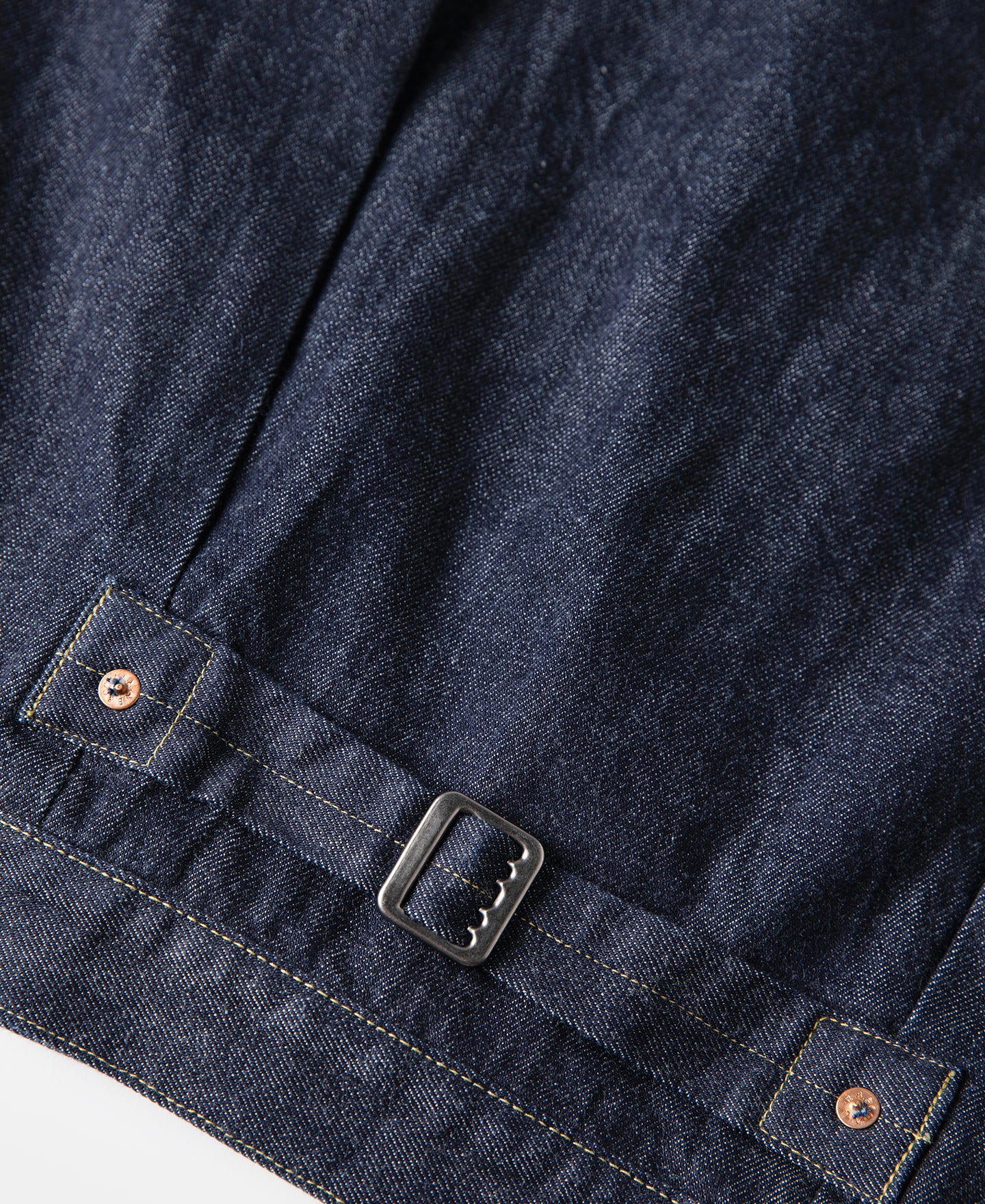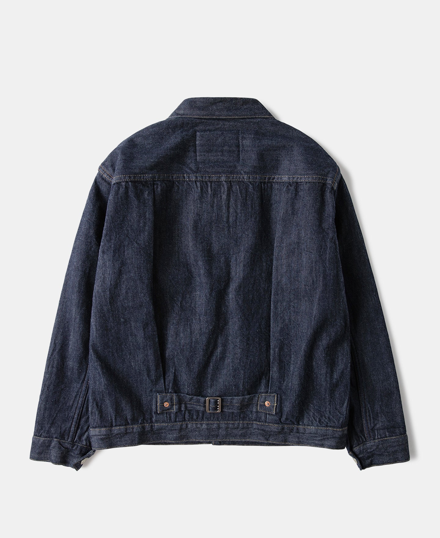 Inspired by late-1940s denim jacket, after World War II when material restrictions were lifted. With wartime regulations gone, classic details returned—including the option to line jackets with wool blankets once again. It features accordion pleats aligned with the second front button, a hallmark of Type I jacket. At the back, the cinch buckle evolved from a prong style to a safer and more practical box-pressed type. Cut from 13.5 oz selvedge denim and fully lined with a blended wool blanket (50% wool, 35% polyester, 15% acrylic), the fabric provides a soft, warm, and wind-resistant feel. Stitched with Japanese cotton threads and finished with a garment wash, this piece combines authentic vintage character with everyday comfort and affordability.