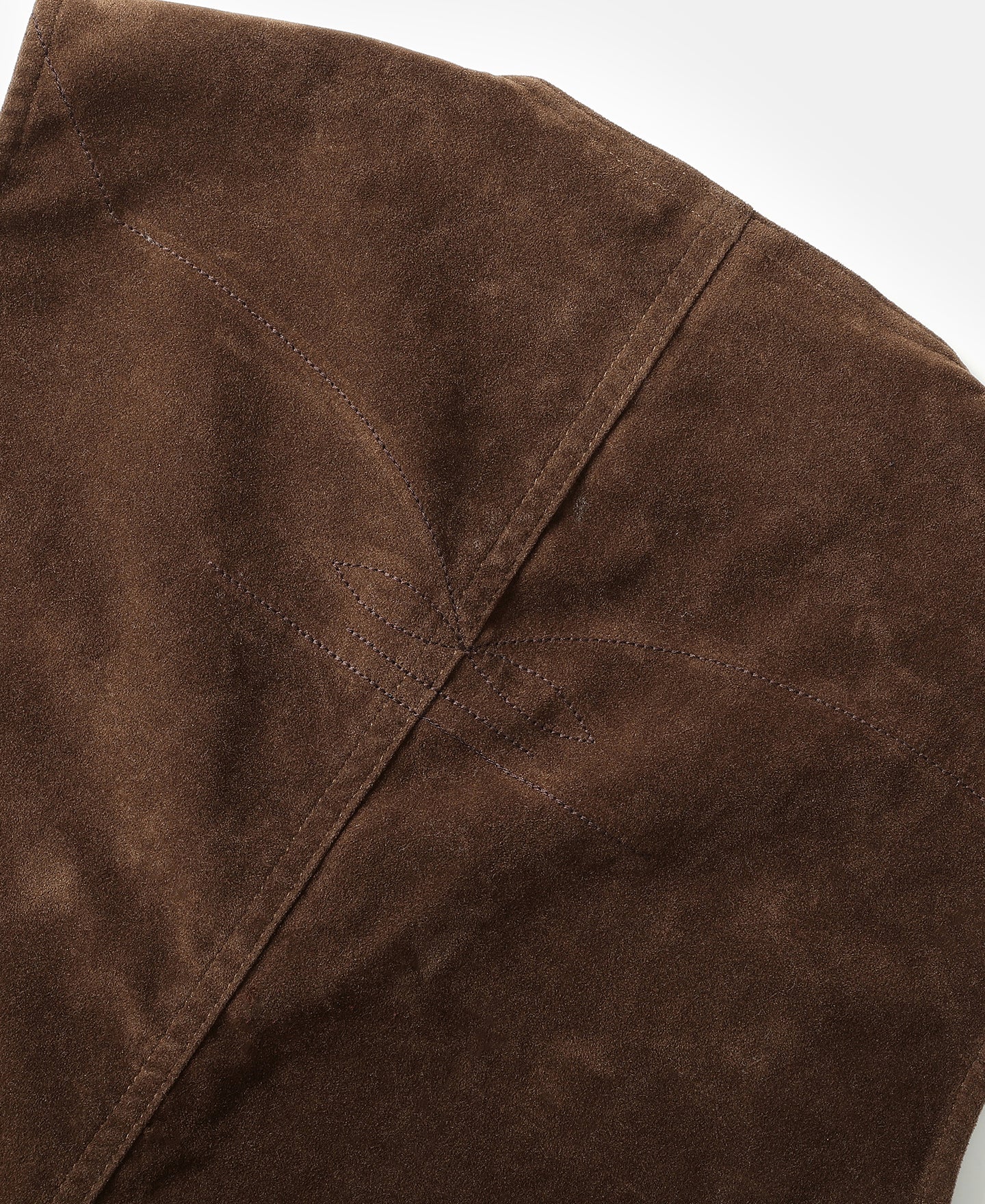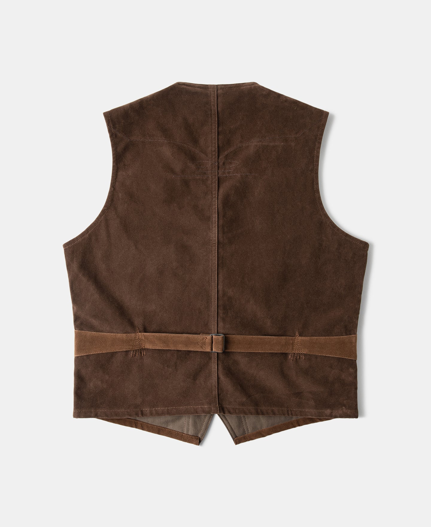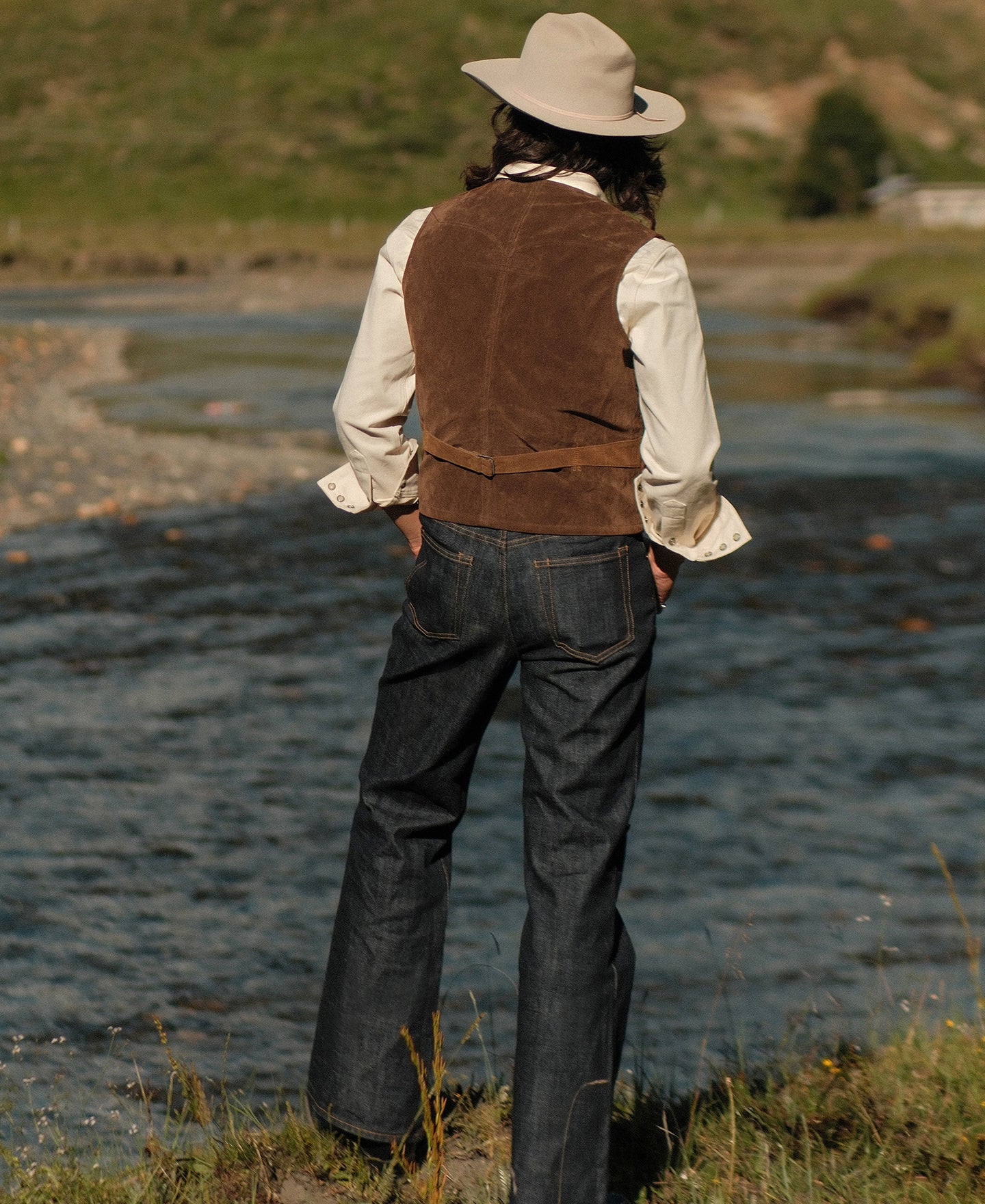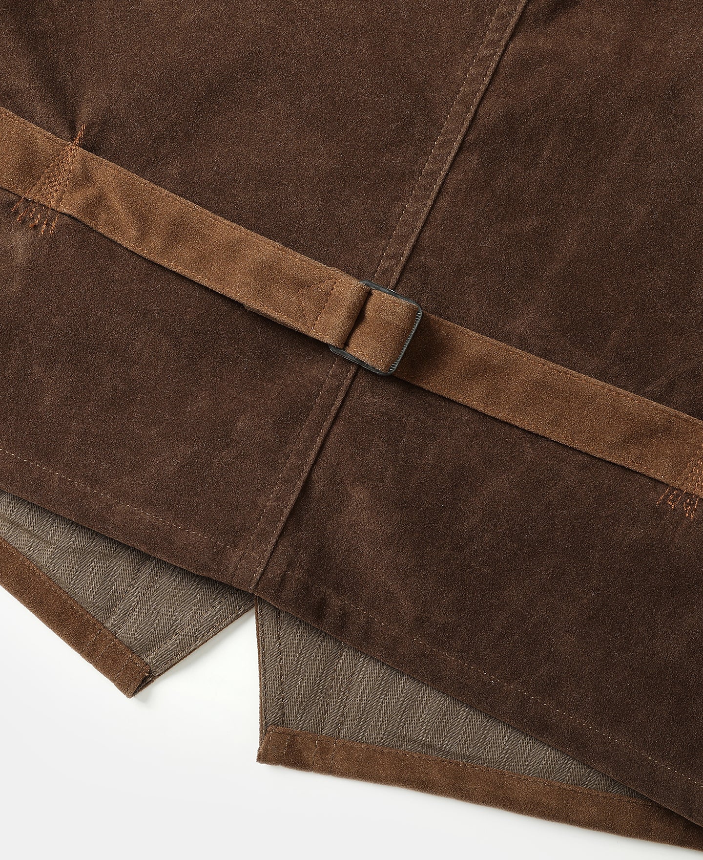This vest combines the structure of early British hunting jackets with the flair of French waistcoats and rugged American workwear. The short, fitted cut and tonal paneling give it a sharp silhouette, while the mix of materials and handcrafted stitching add depth and authenticity.