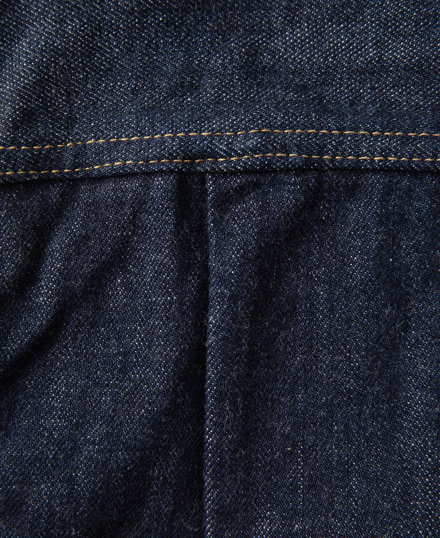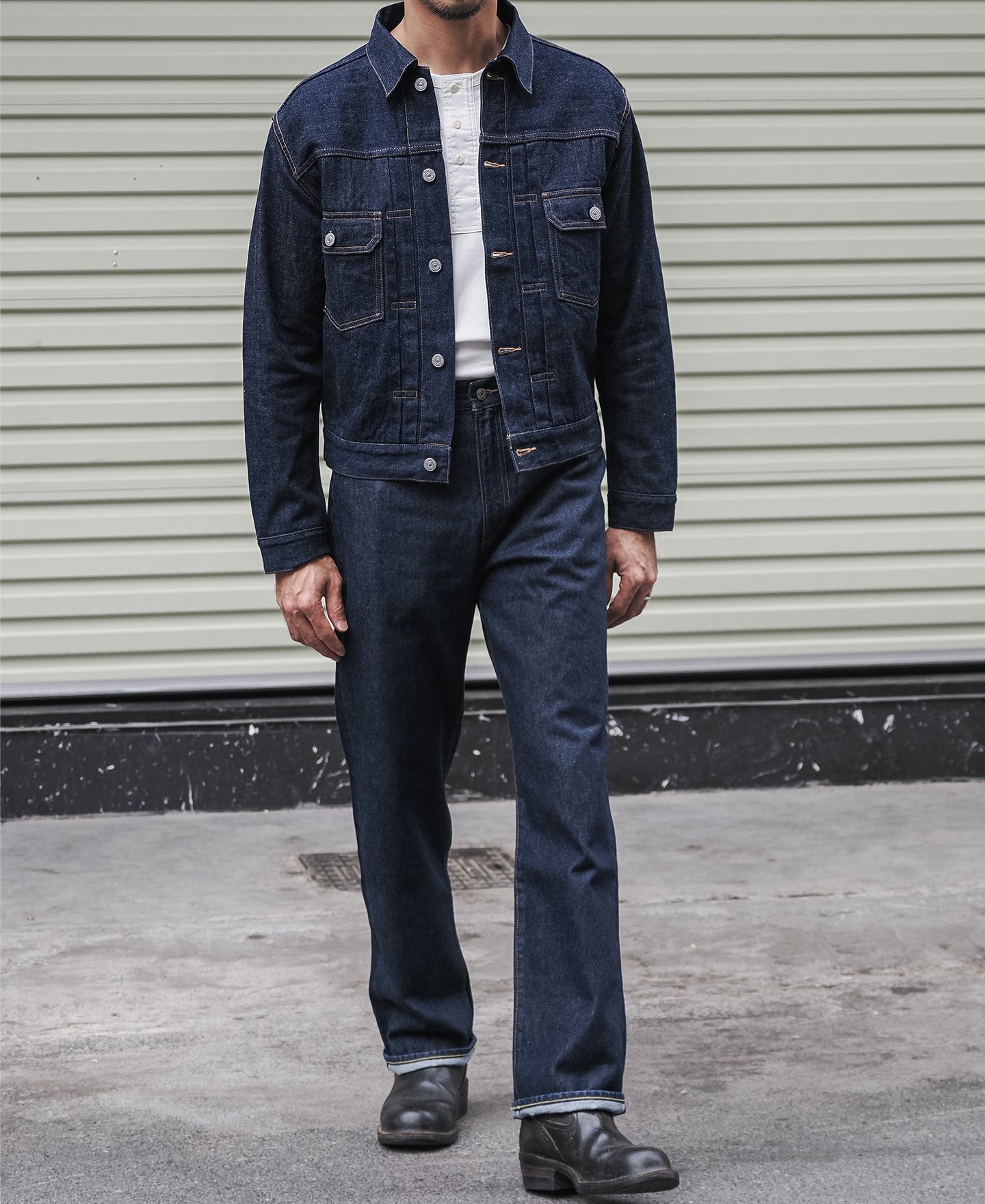 Inspired by the 1950s second-generation denim jacket, this piece carries the defining traits of the era: a trimmer fit with narrower sleeves and a more tapered waistband. The back features an adjustable cinch in place of the earlier prong buckle, adding both function and period-correct detail. Cut from sturdy 14 oz selvedge denim and fully lined with a blended wool blanket (50% wool, 35% polyester, 15% acrylic), it offers warmth, structure, and durability.