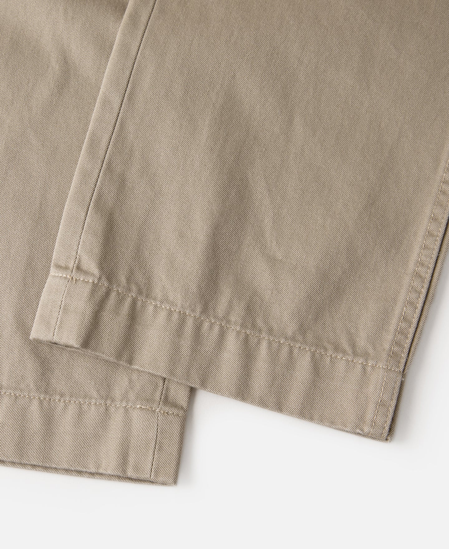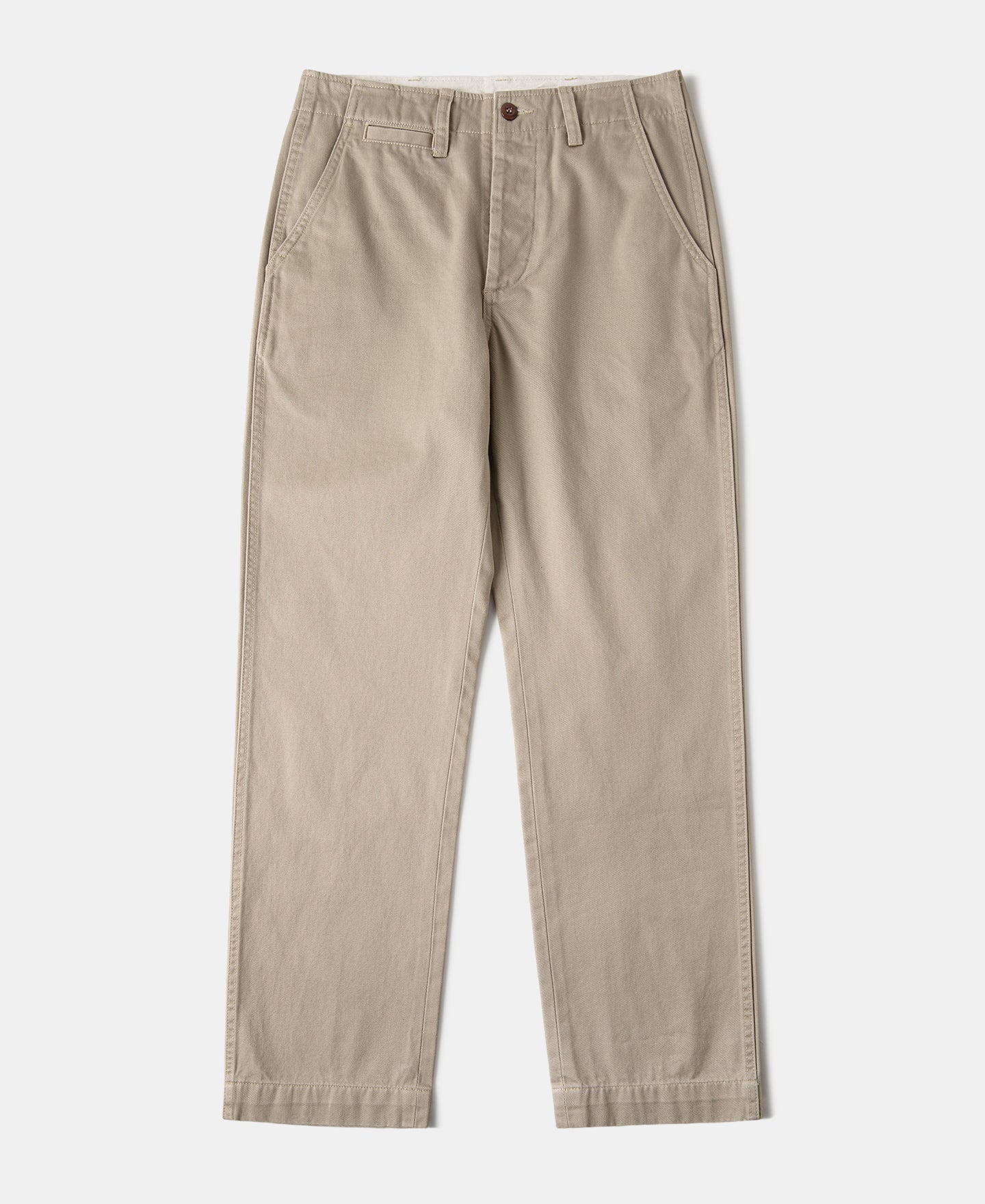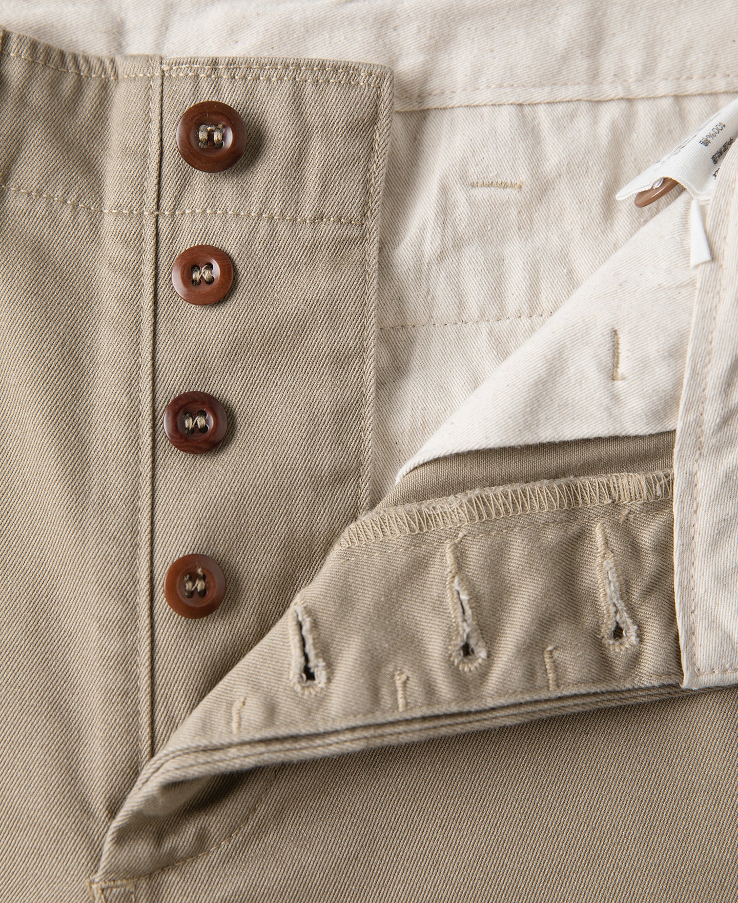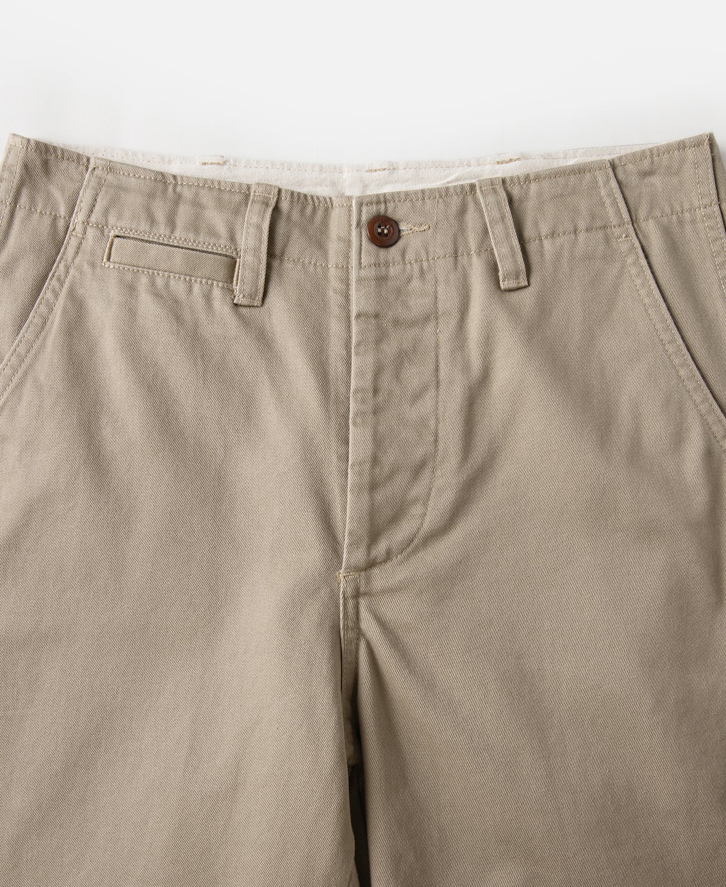 This pair of trousers is based on the 1950s U.S. Army issue chinos, but adopts a slightly tapered silhouette. It is tailored to fit at the thighs and gradually narrows from the knees, presenting a more modern fashion style, reminiscent of Steve McQueen in The Great Escape.