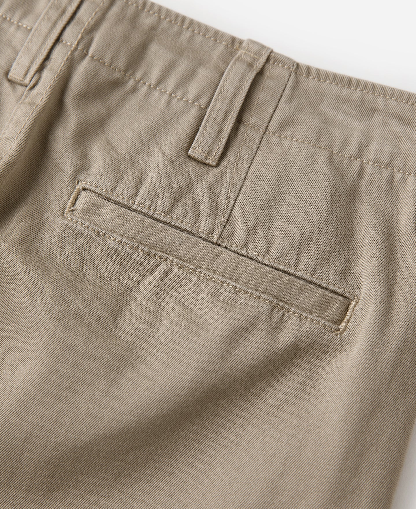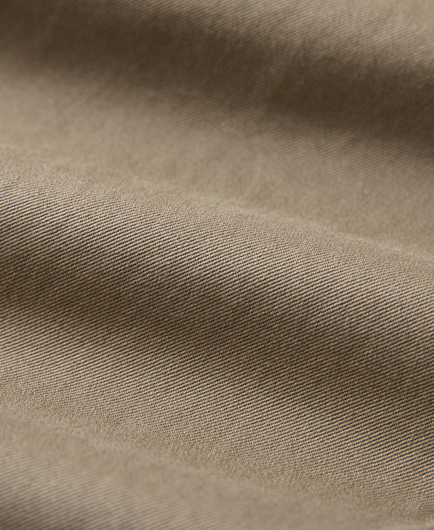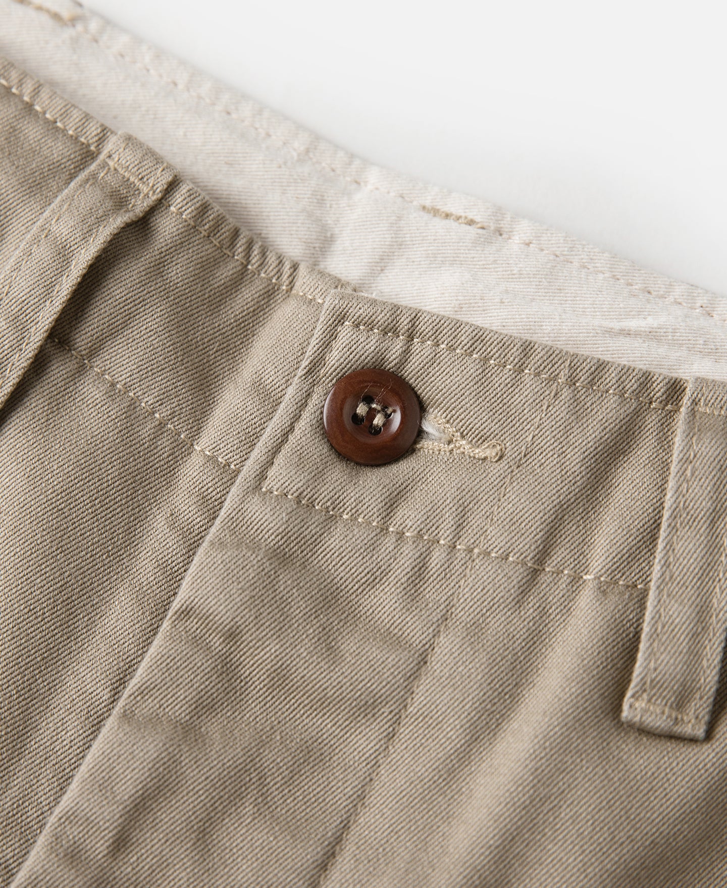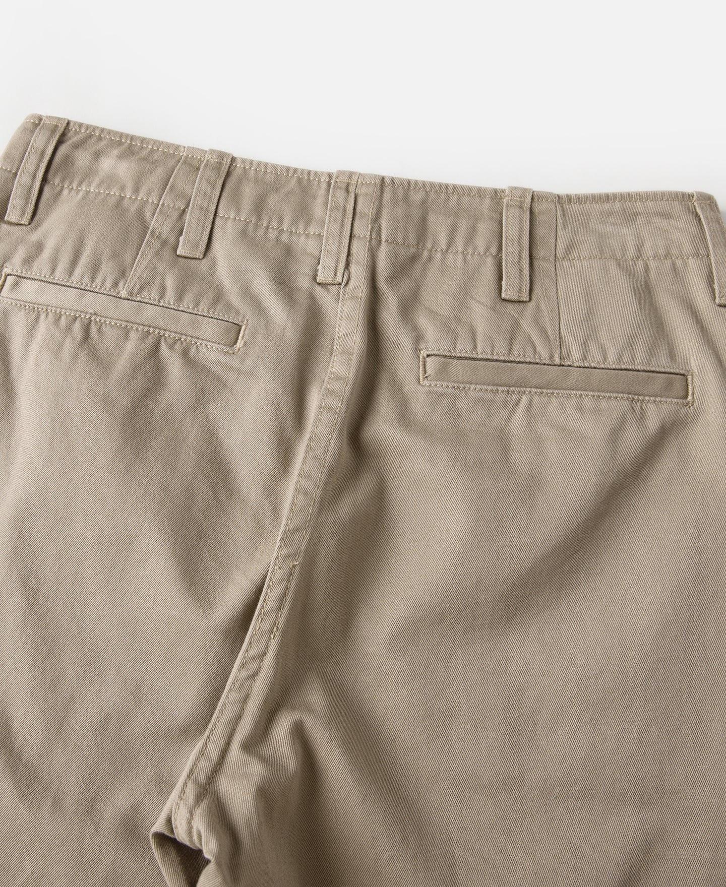 This pair of trousers is based on the 1950s U.S. Army issue chinos, but adopts a slightly tapered silhouette. It is tailored to fit at the thighs and gradually narrows from the knees, presenting a more modern fashion style, reminiscent of Steve McQueen in The Great Escape.