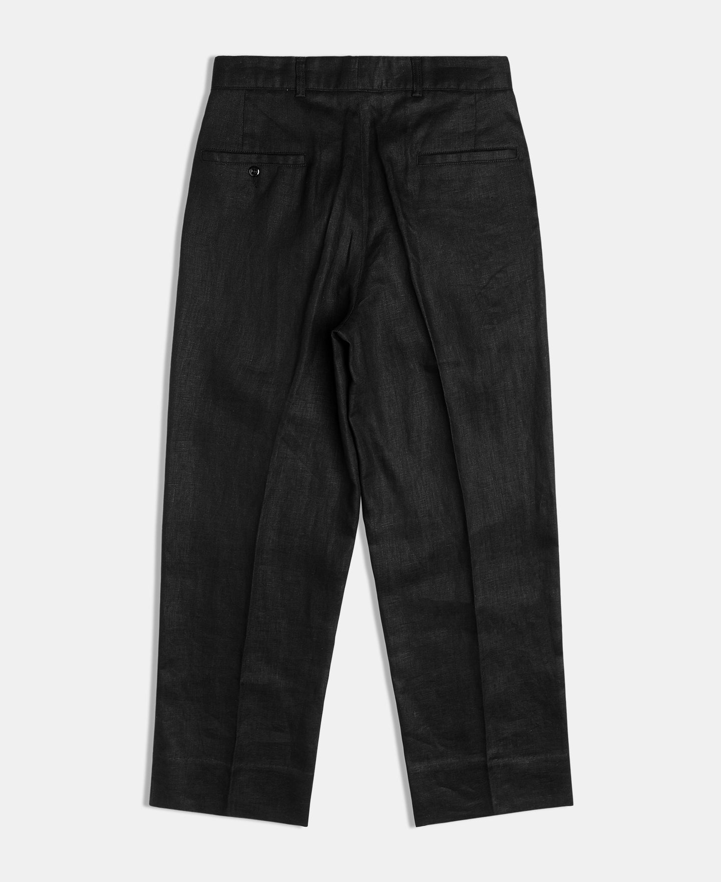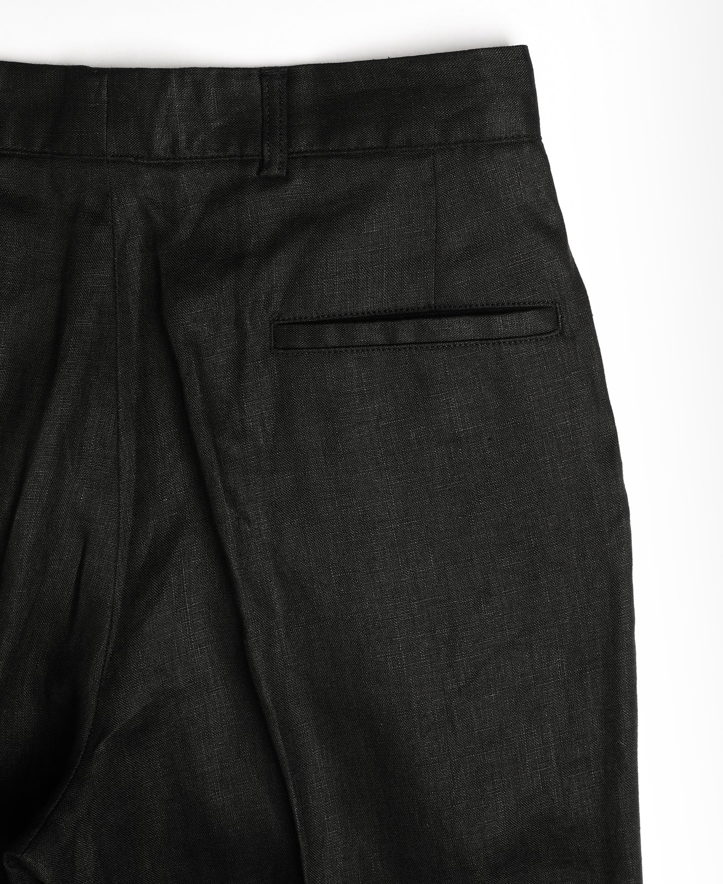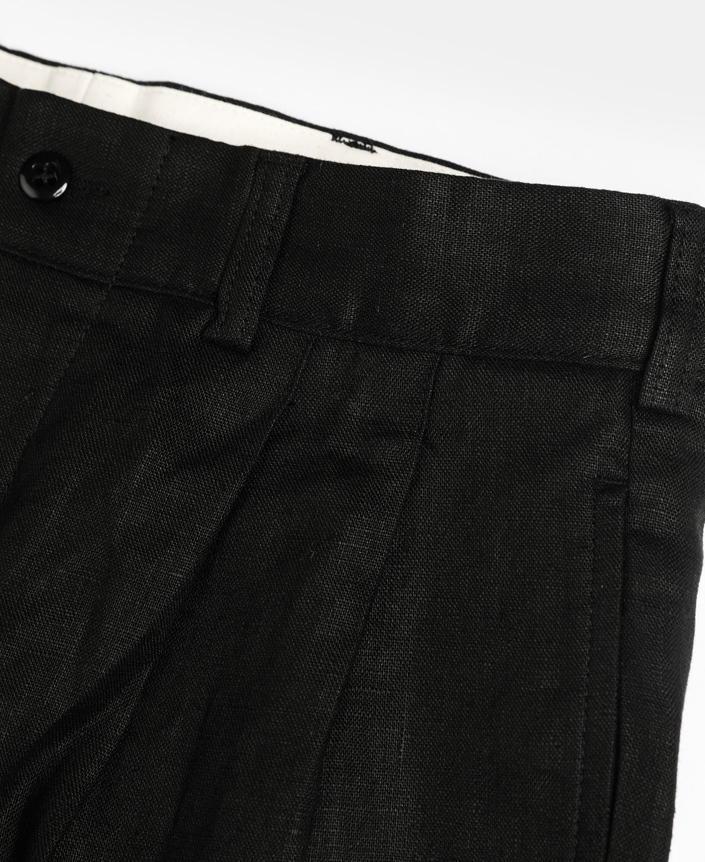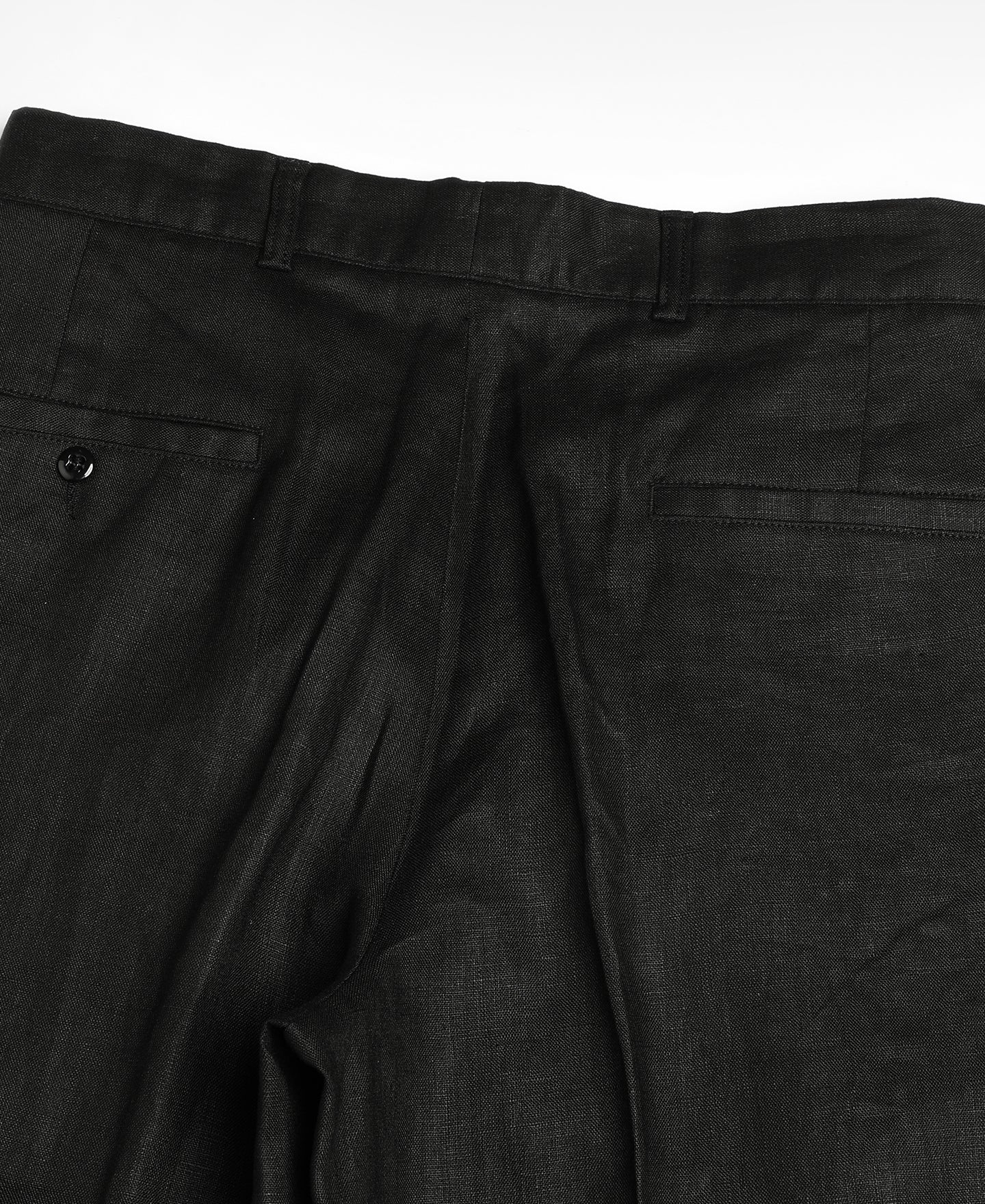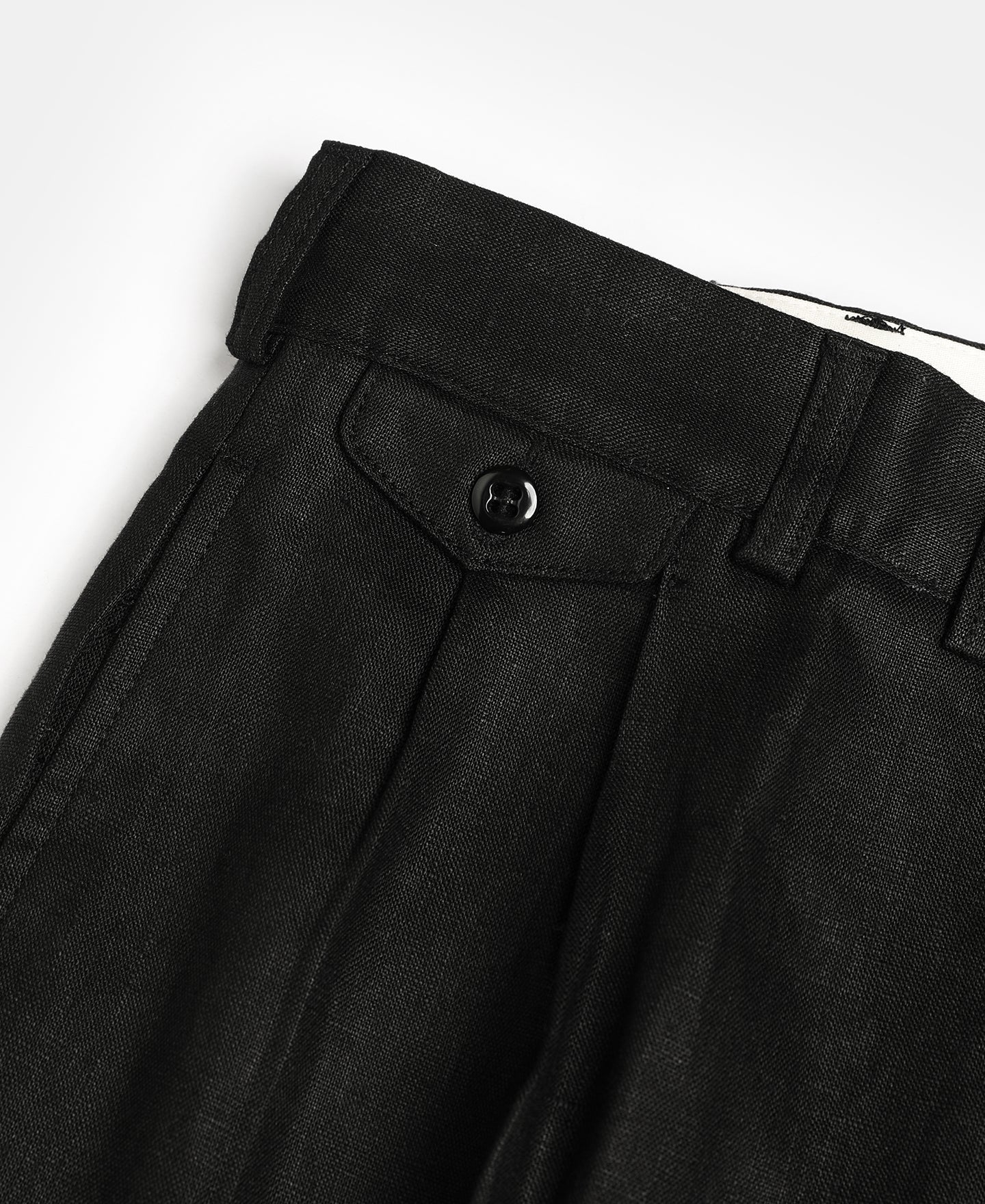 The combination of double pleats and a roomy cut creates a strong structure. This pair follows the classic two-tuck slacks design, crafted from 100% French linen—offering a refined balance of breathability, relaxation, and summer-ready coolness. -