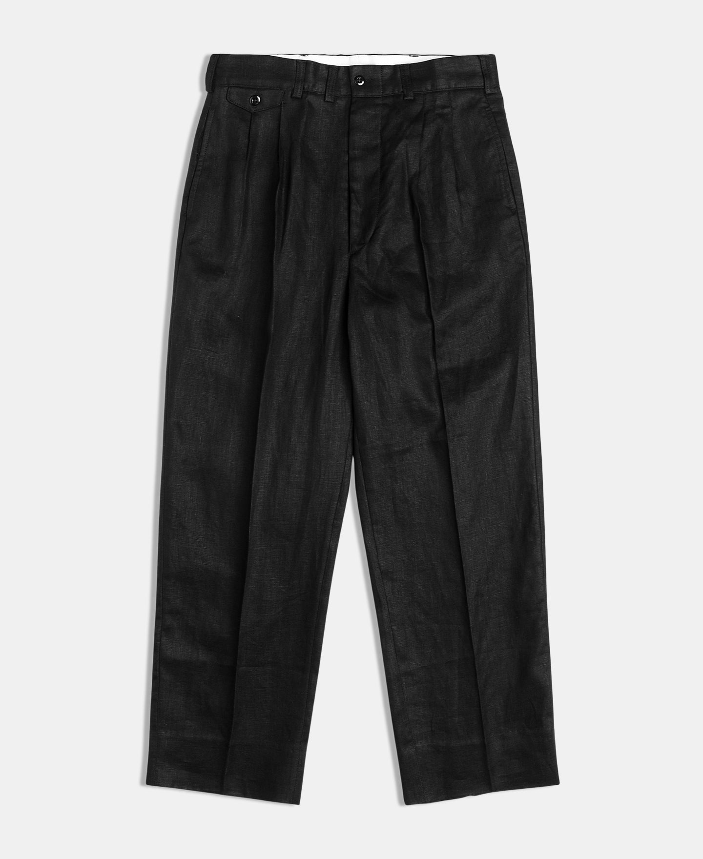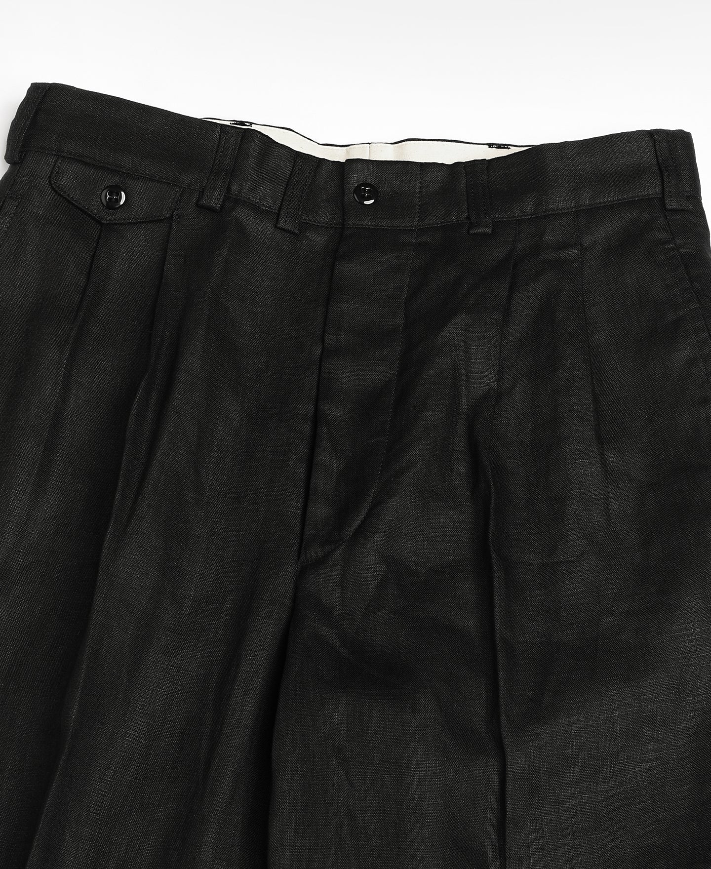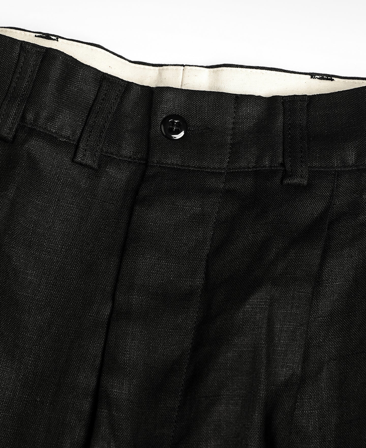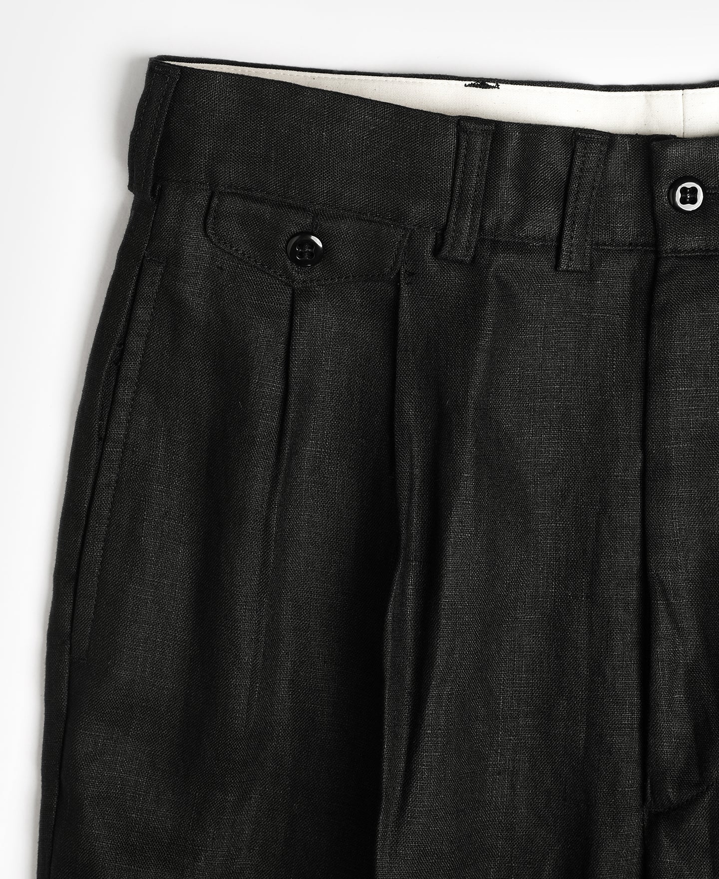 The combination of double pleats and a roomy cut creates a strong structure. This pair follows the classic two-tuck slacks design, crafted from 100% French linen—offering a refined balance of breathability, relaxation, and summer-ready coolness.