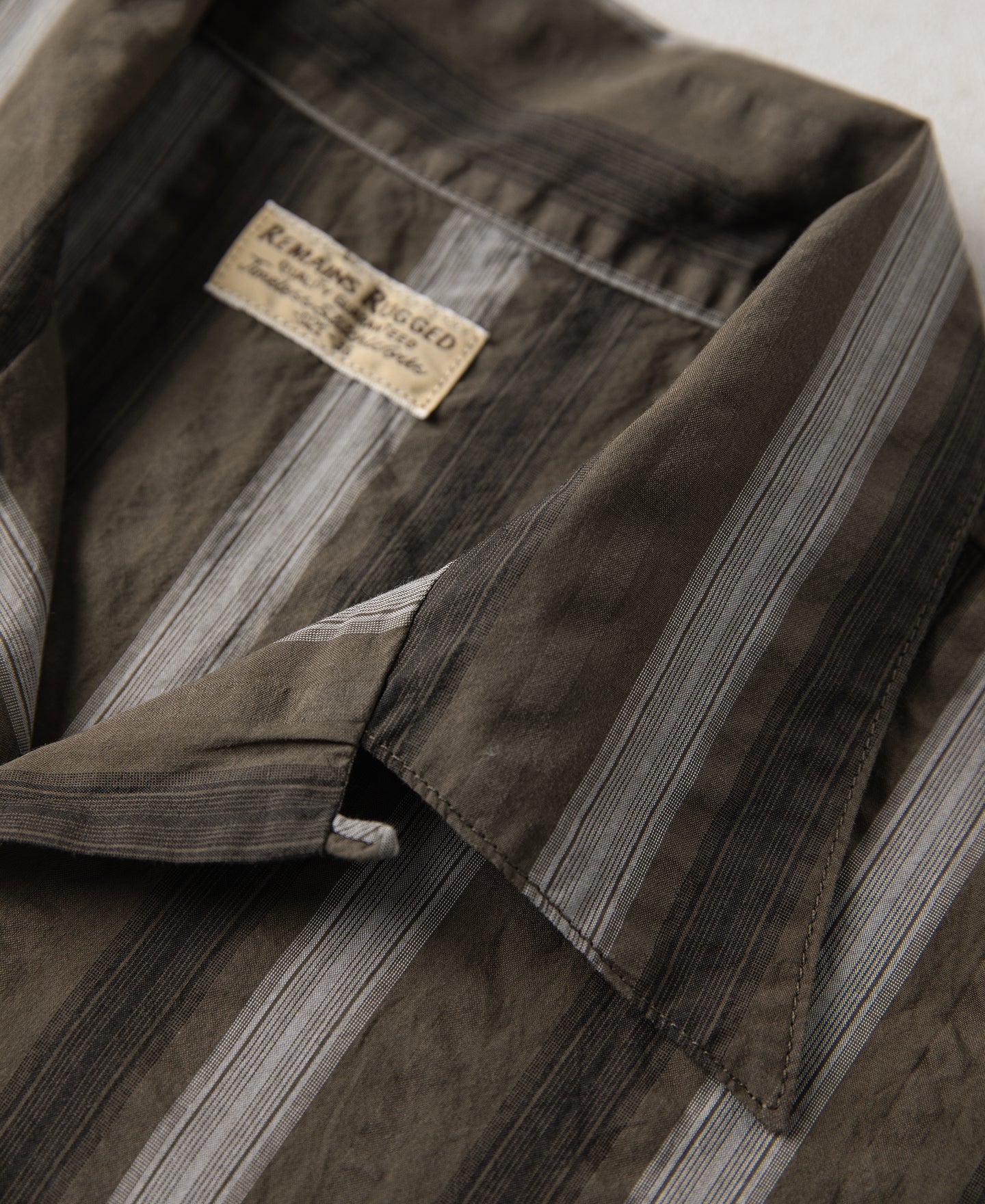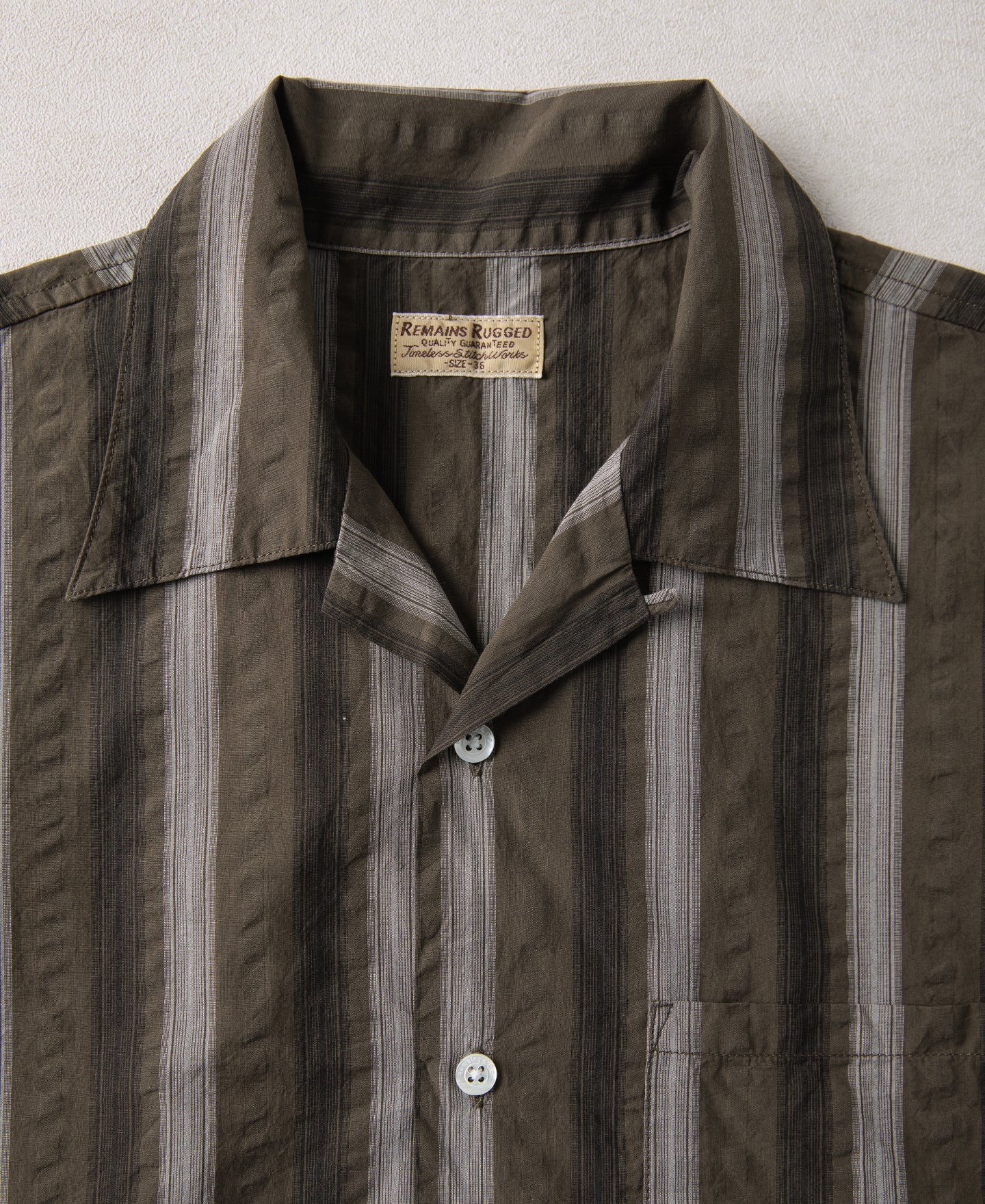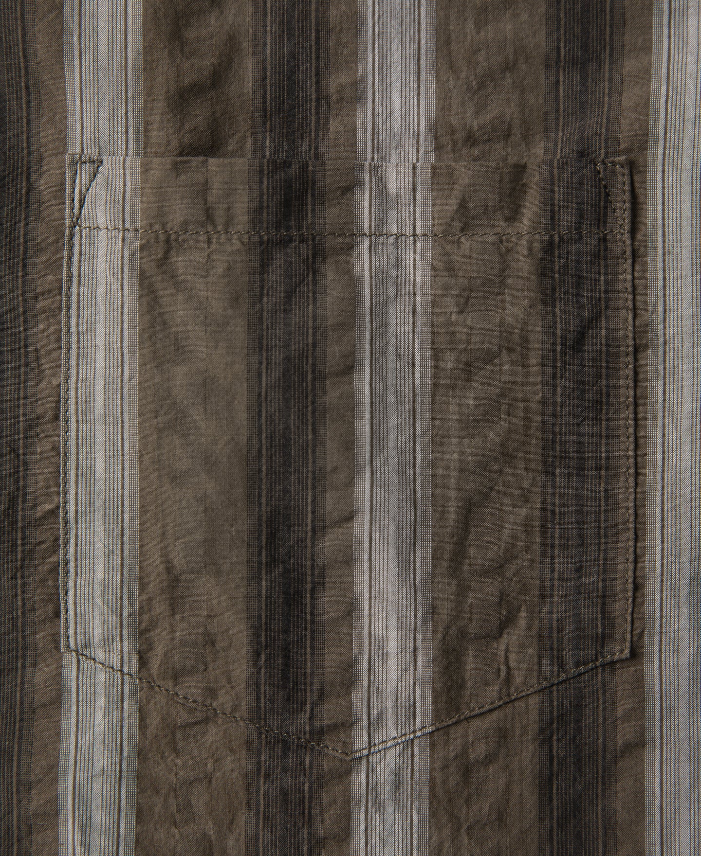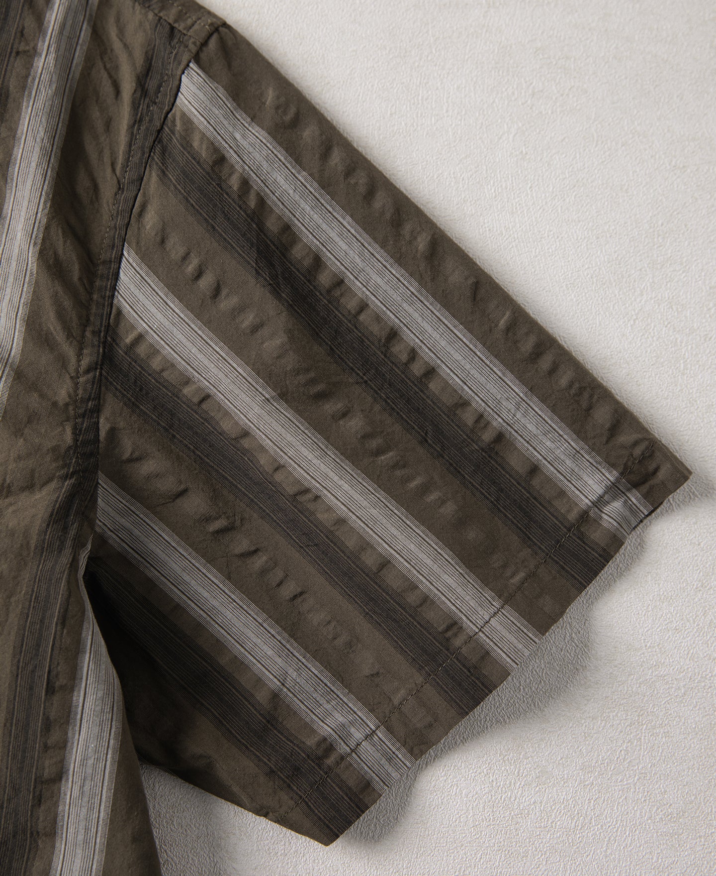 This short-sleeve shirt is crafted from 100% cotton seersucker, featuring alternating sets of deep and light yarn-dyed stripes and a puckered texture unique to the fabric. The uneven surface promotes airflow and reduces direct contact with the skin, making it ideal for summer wear. The chest pocket is carefully aligned with the body stripes for a clean, consistent look. Cut in a relaxed fit, it features a 1940s-style open collar and a simple straight hem. The placket is finished with refined imported natural shell buttons.