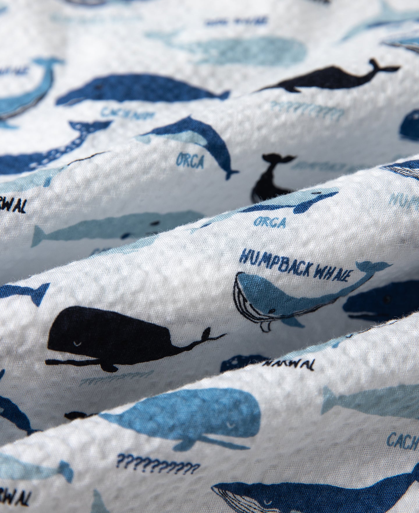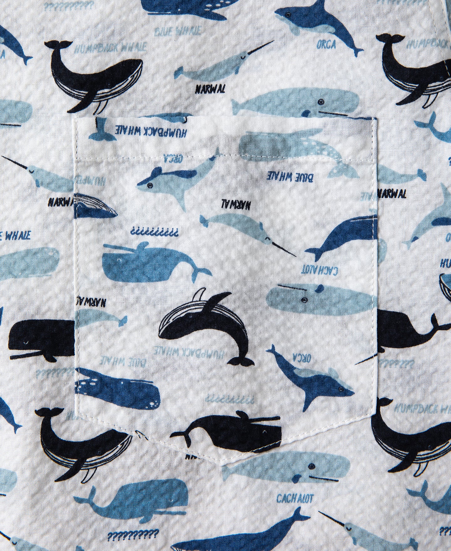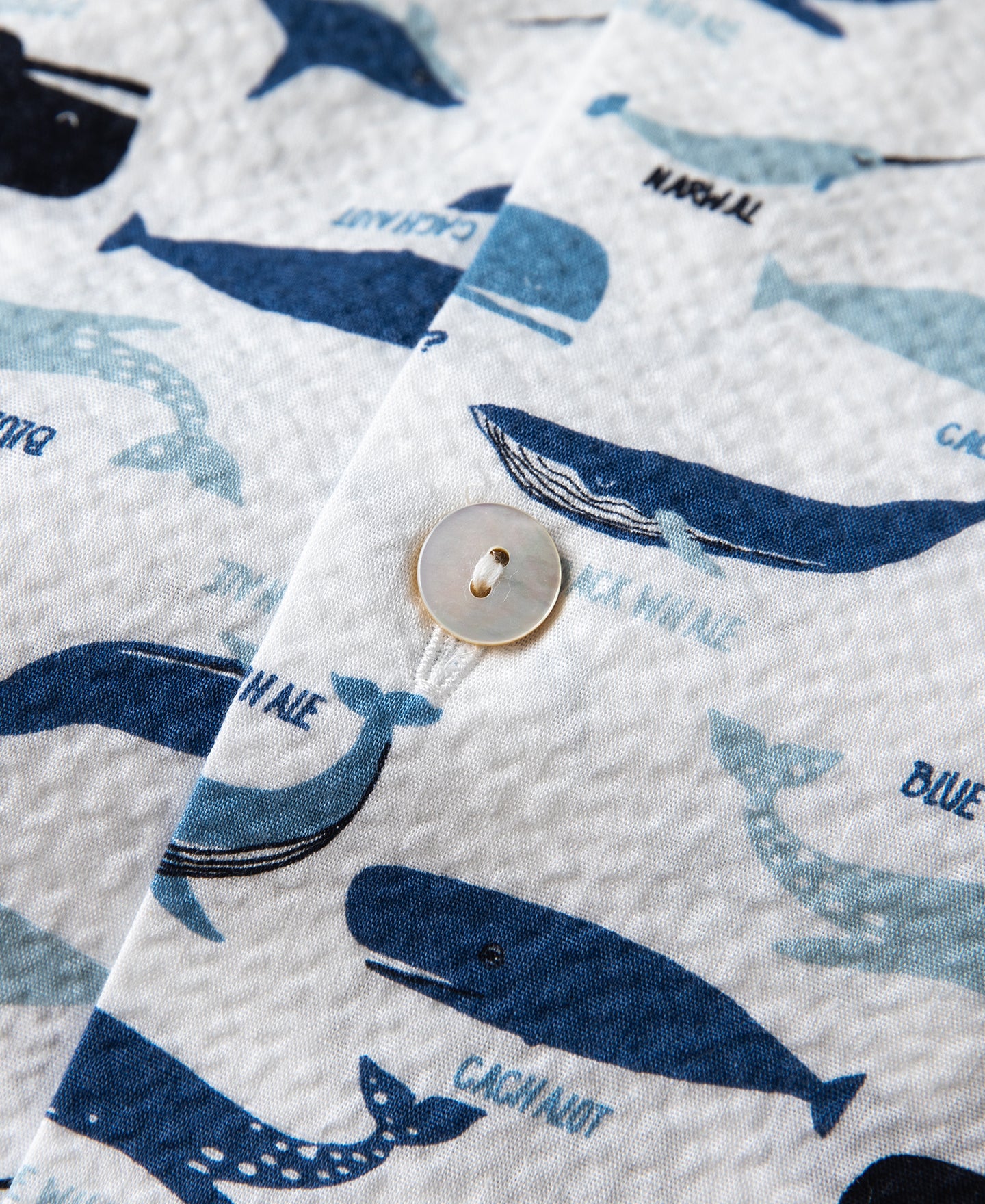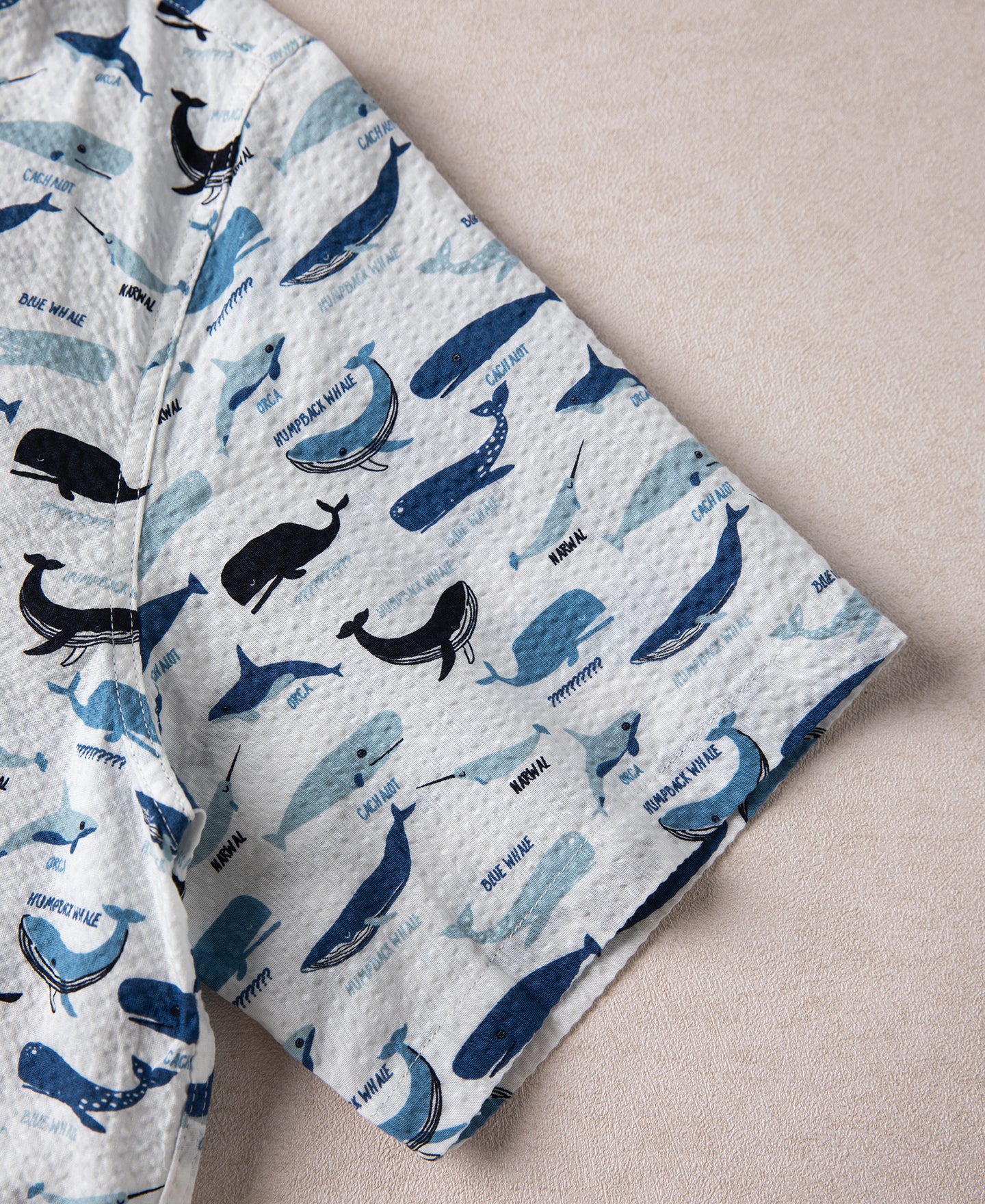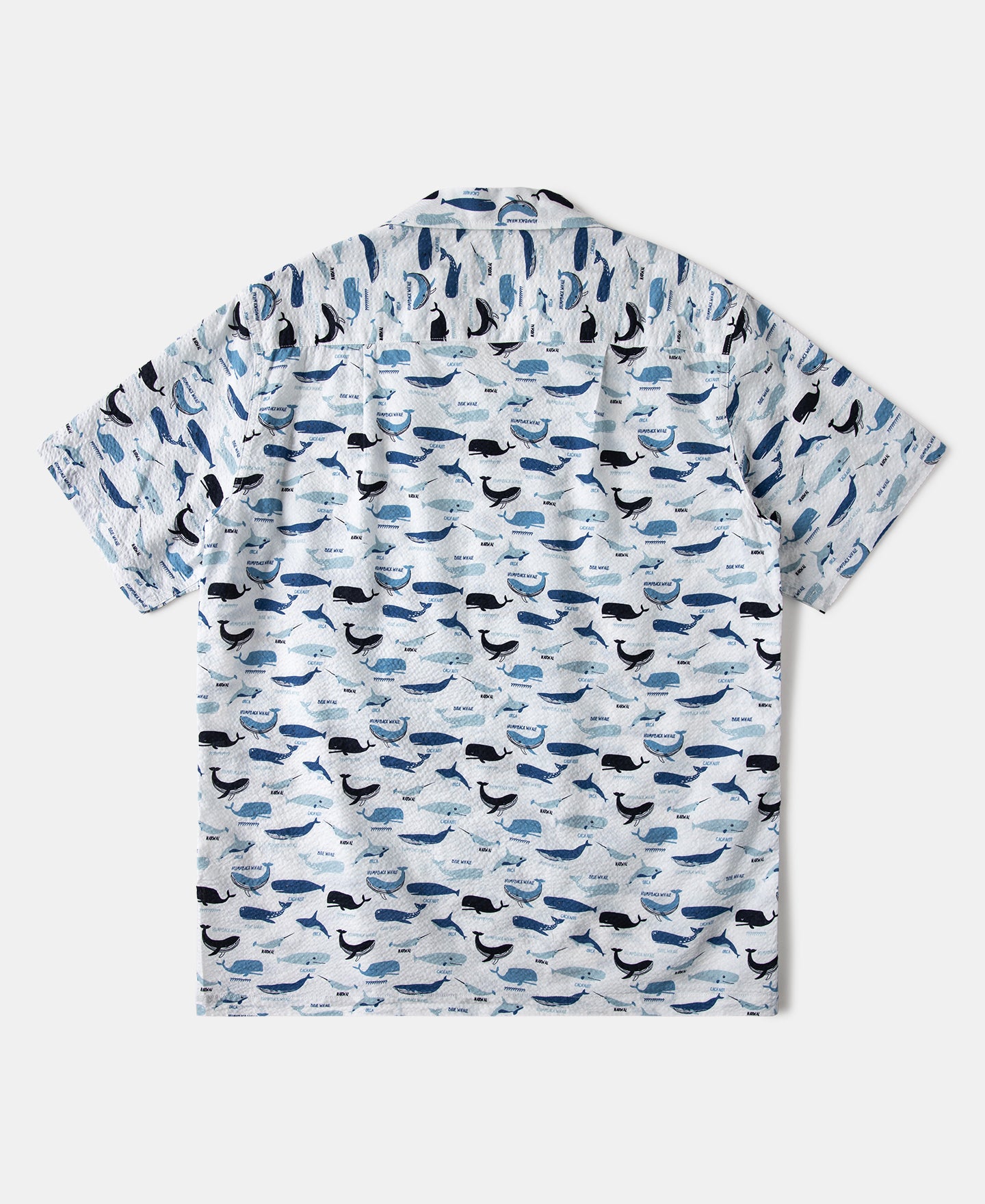 Made from Japanese seersucker fabric, this shirt is exceptionally breathable and comfortable, offering a rich texture. Featuring whale-themed prints, it is the perfect choice for stylish summer wear.