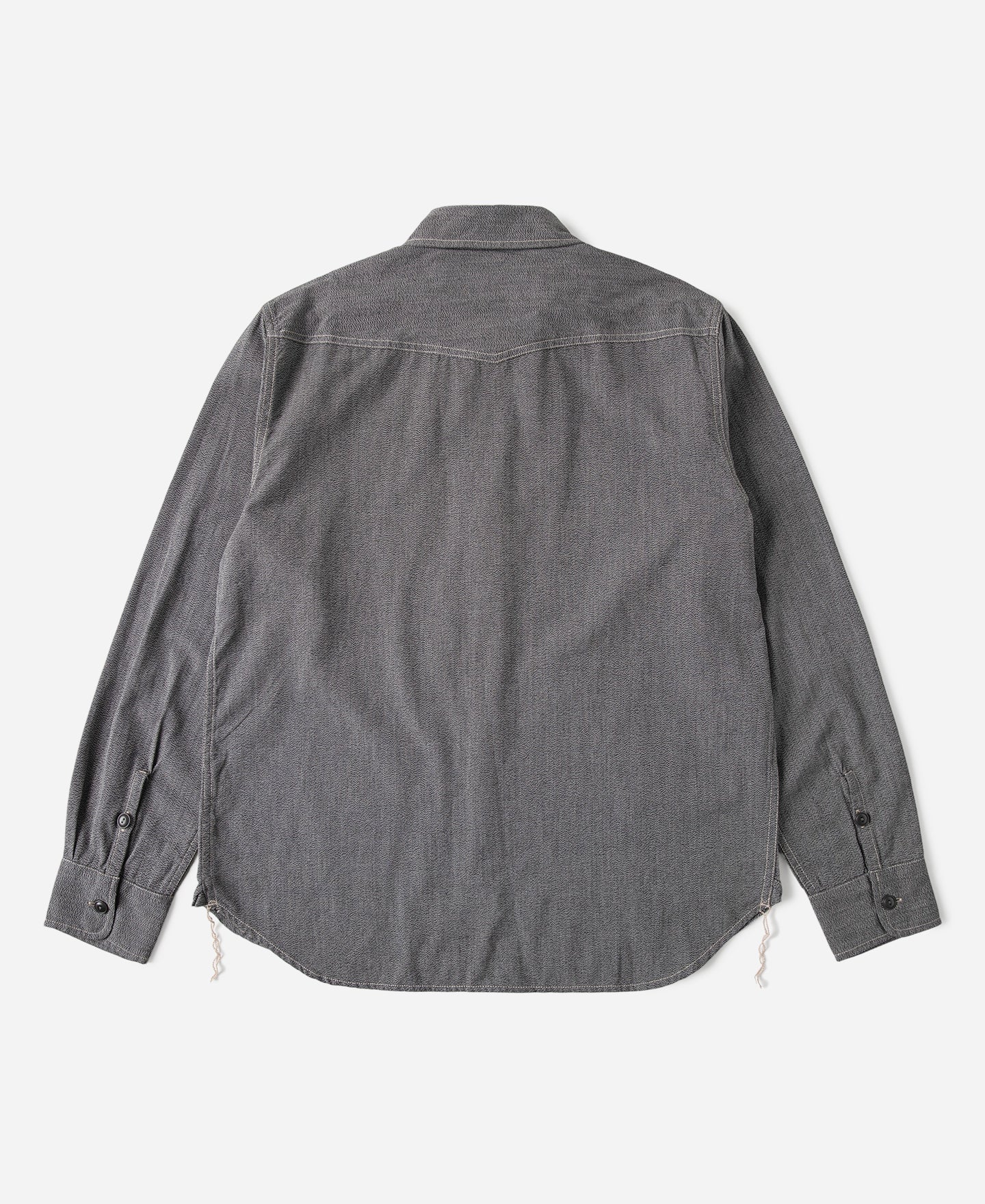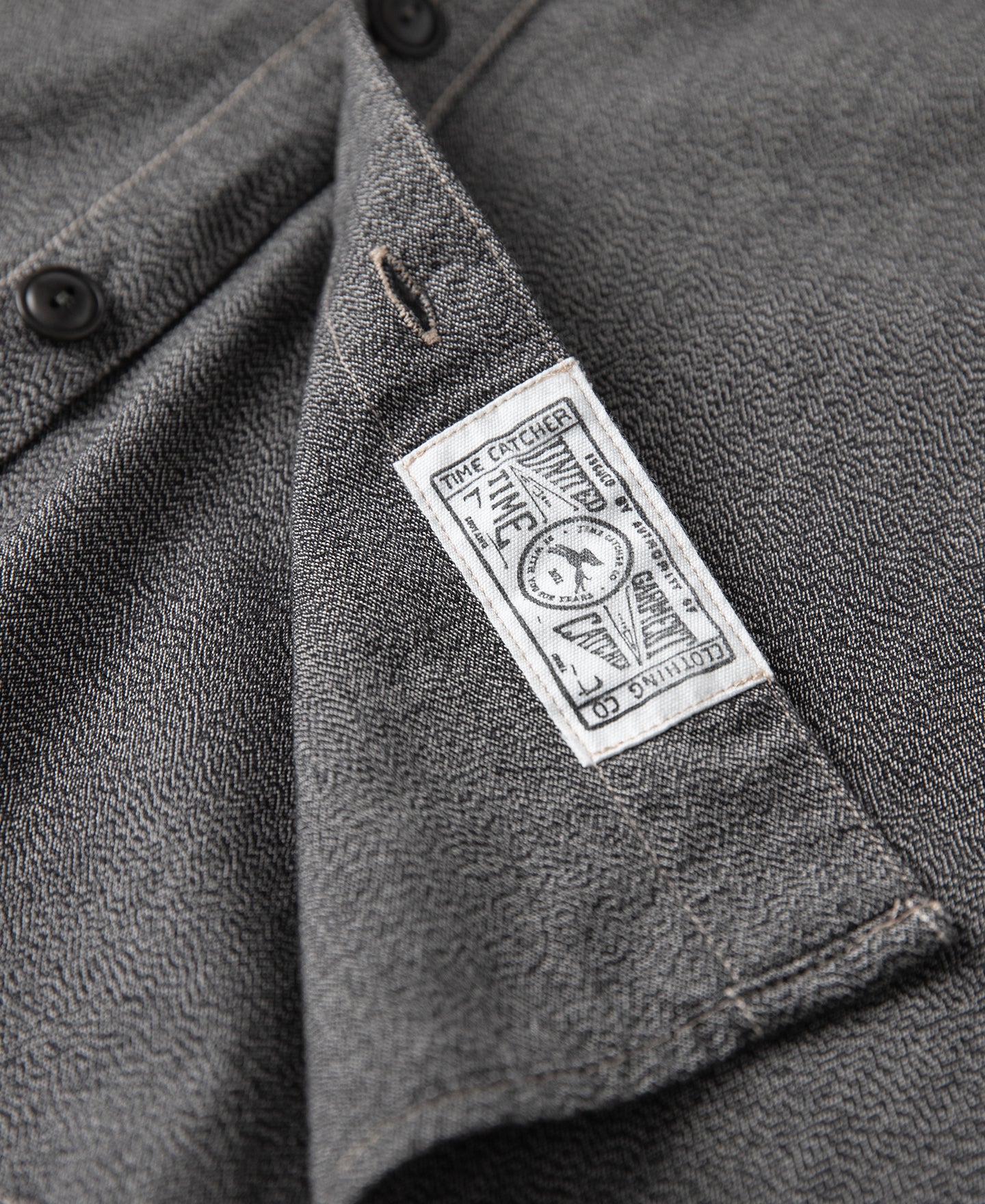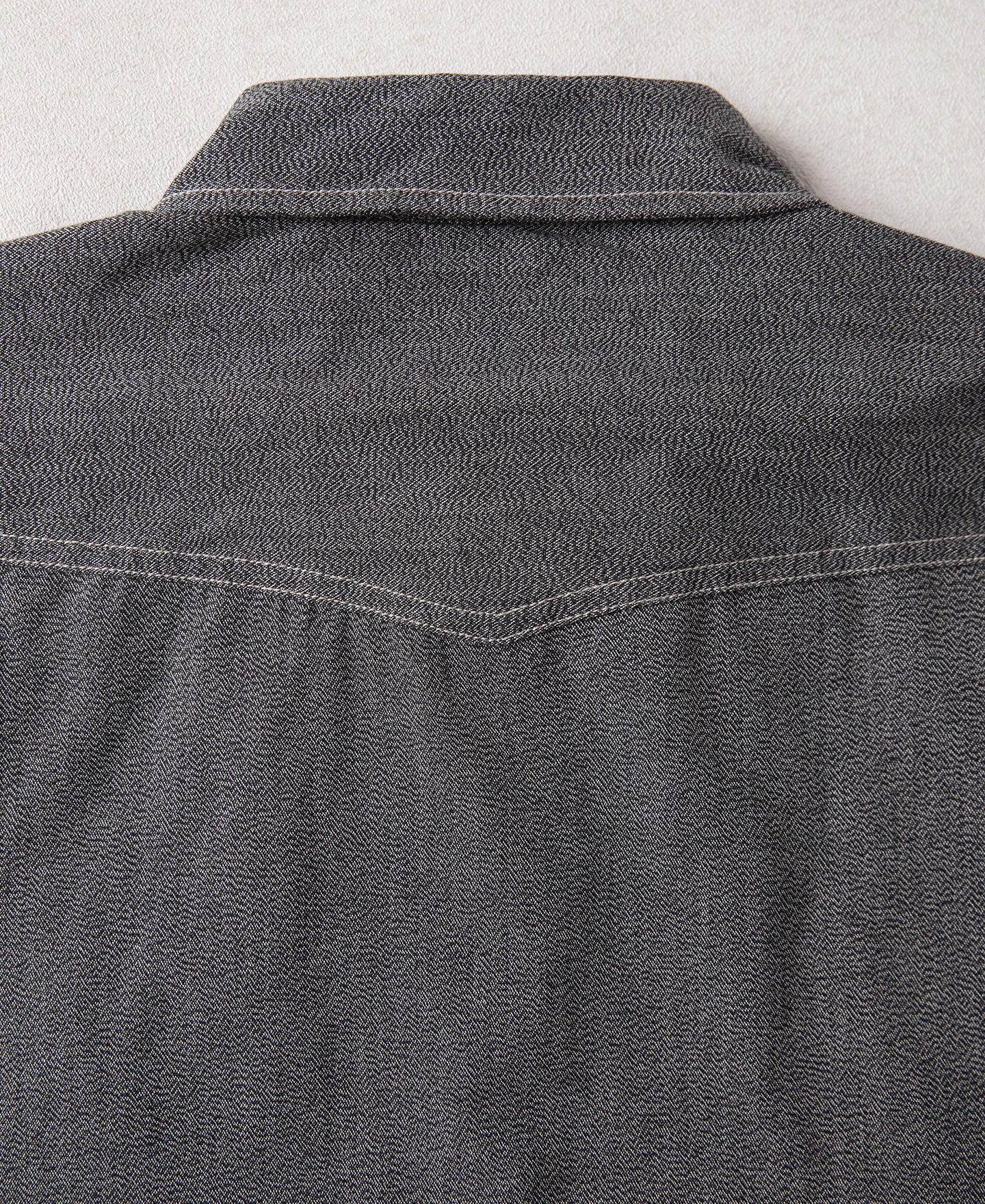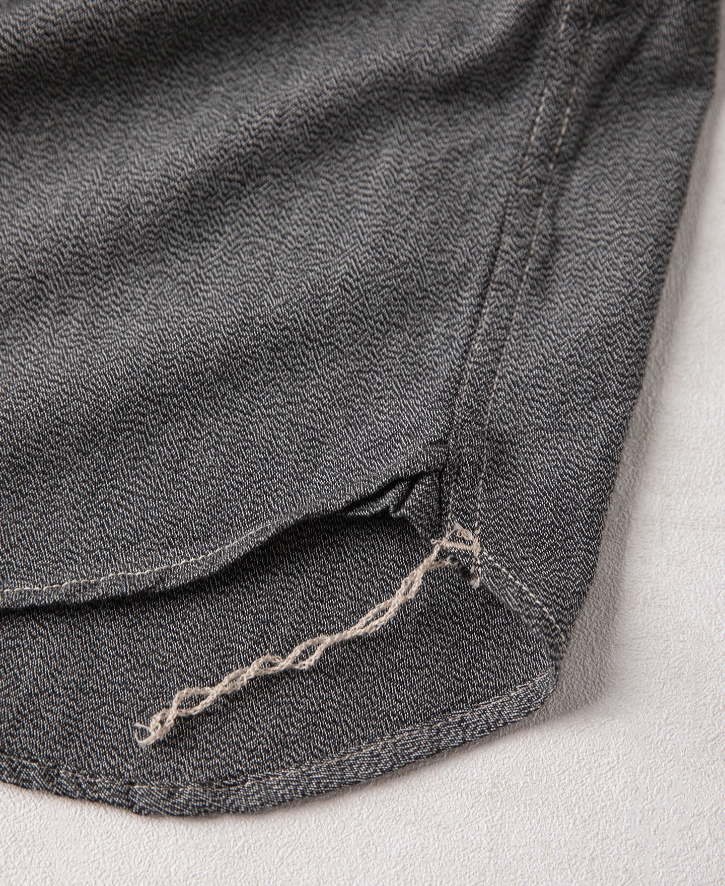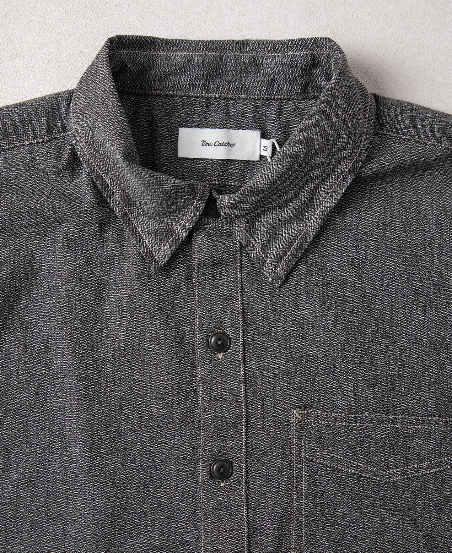 This shirt is inspired by work shirts from the 1930s, cotton jaspé cloth, the jaspé technique combines two separately dyed cotton yarns to create a rustic two-tone effect. Retro style work shirt detail, khaki stitching structure, and Authentic chain stitching structure at the side seams ensure durable construction. A pocket on the left breast makes it more retro after a long wear.