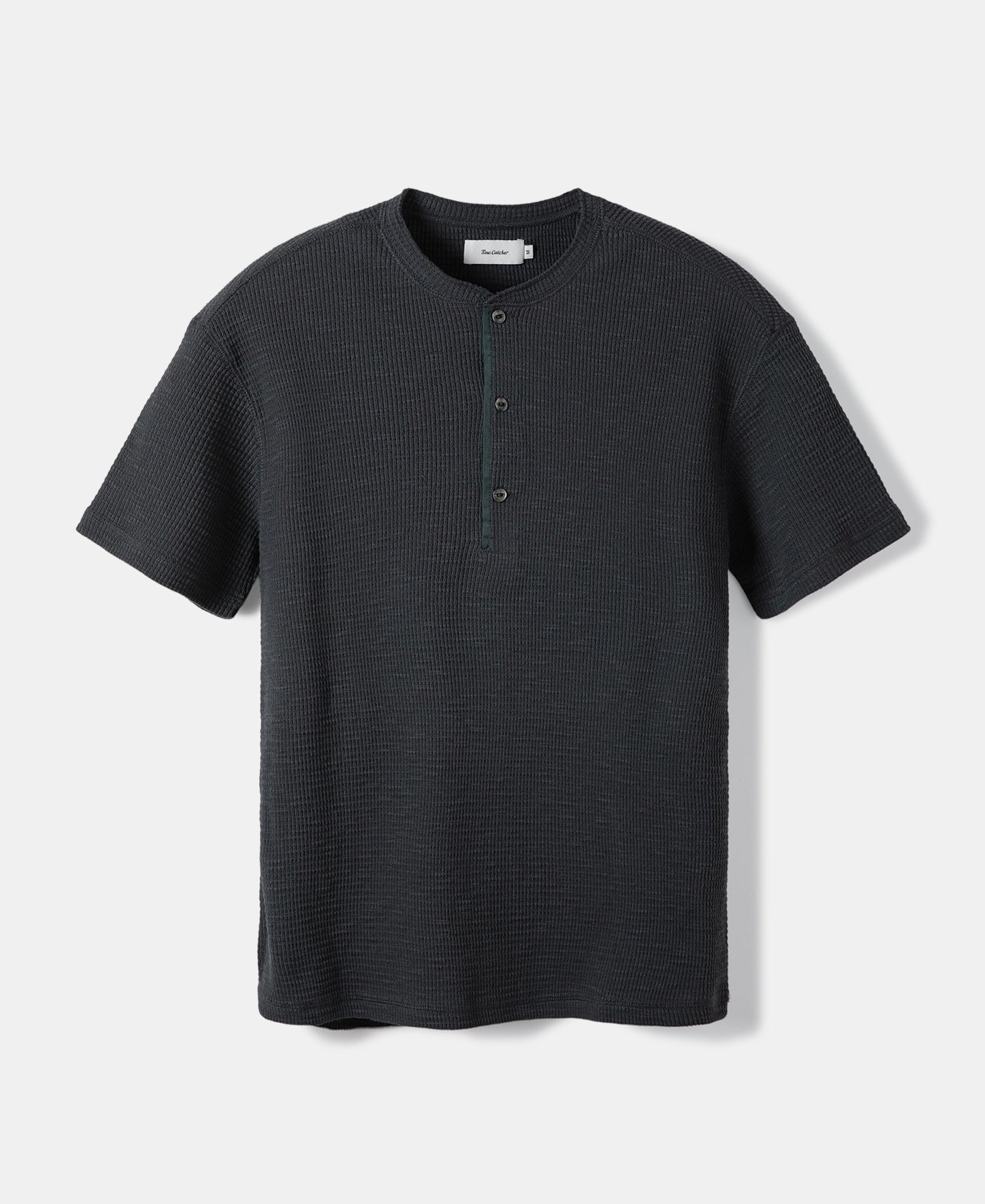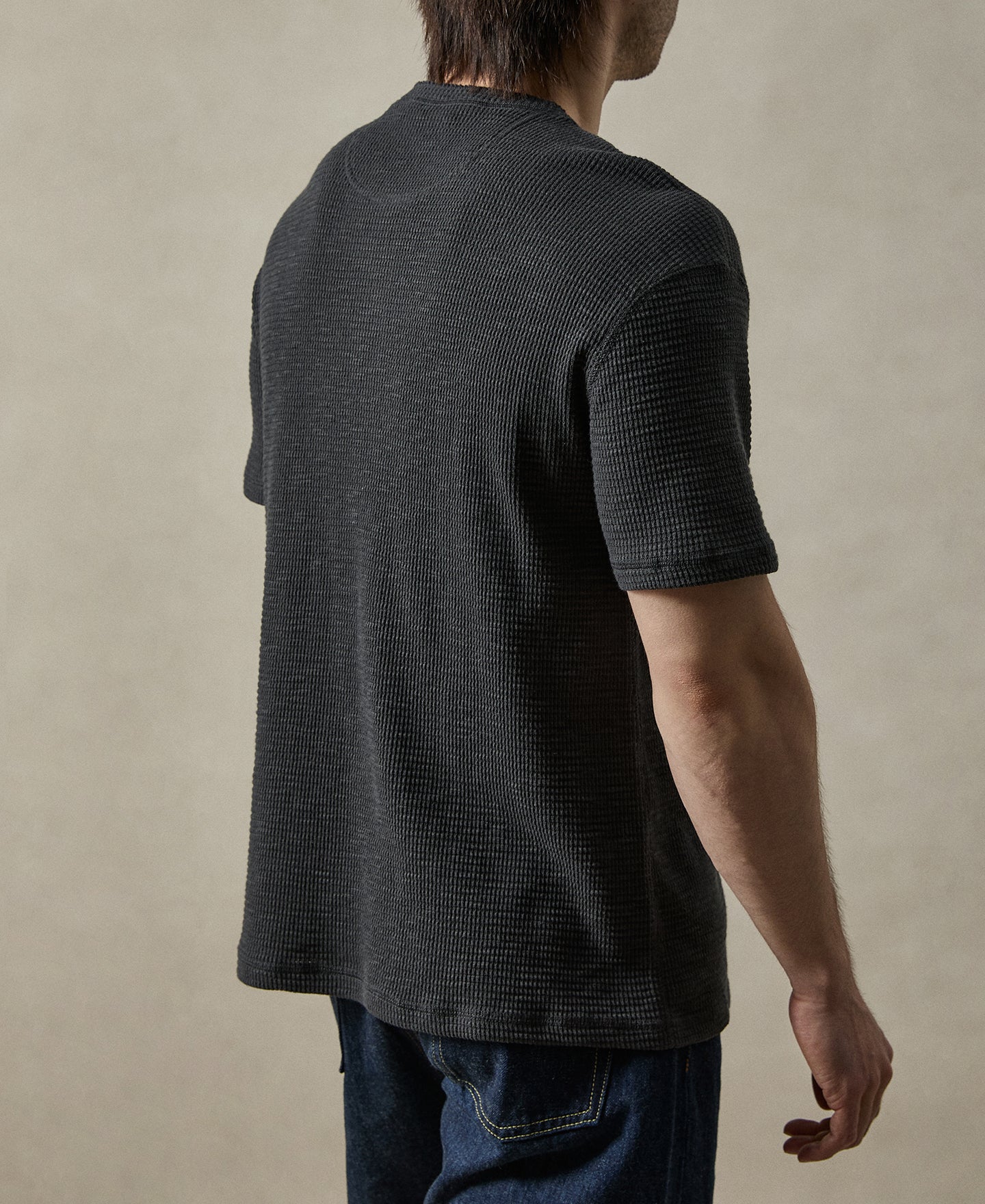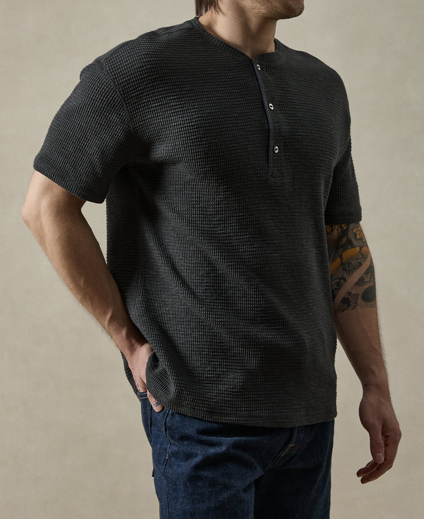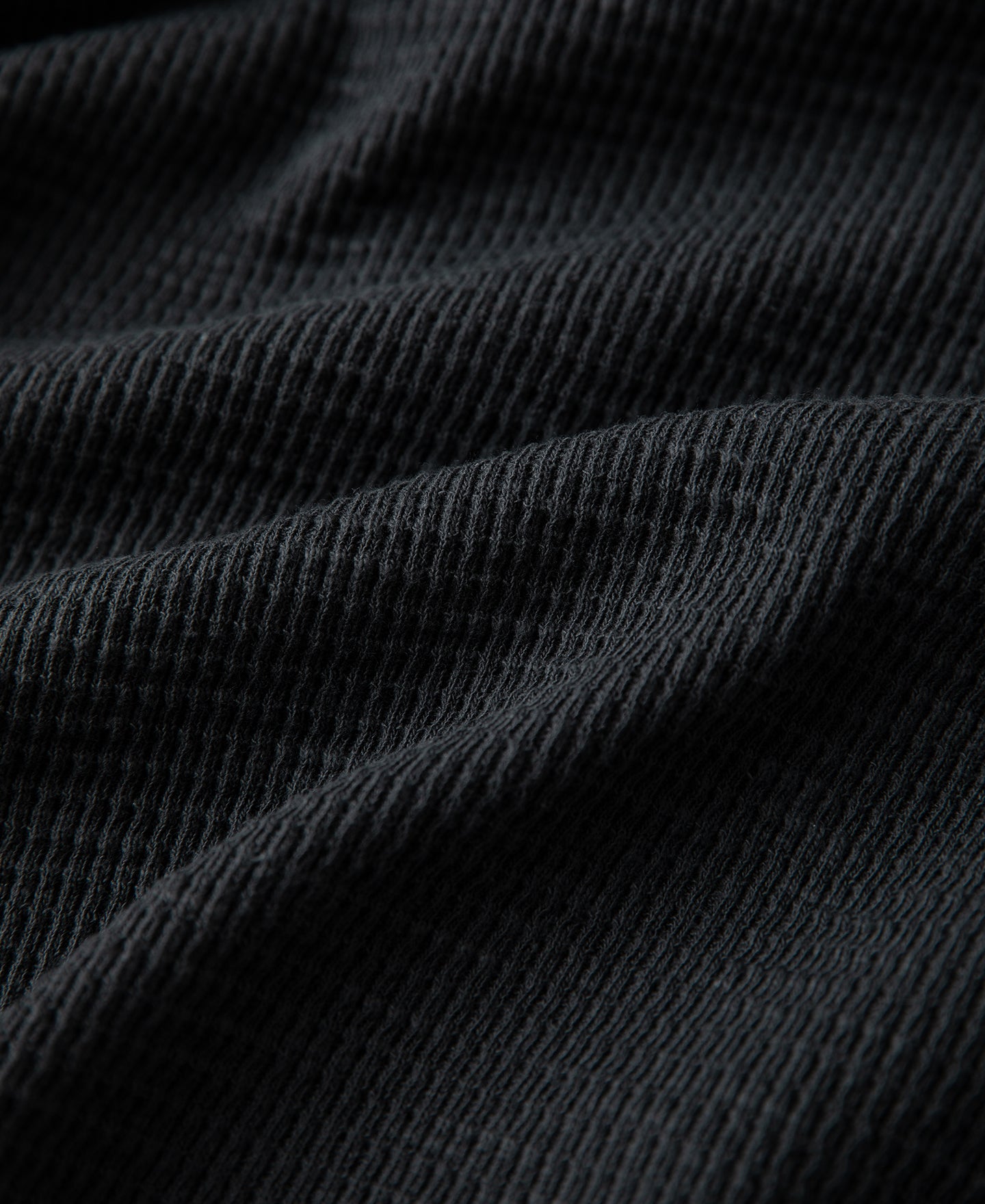 Crafted from a 220 GSM cotton waffle knit—also known as honeycomb for its textured grid pattern—this henley T-shirt combines softness with natural stretch. The raised weave allows for enhanced breathability and comfort, while durable triple-needle stitching ensures a clean, long-lasting finish.