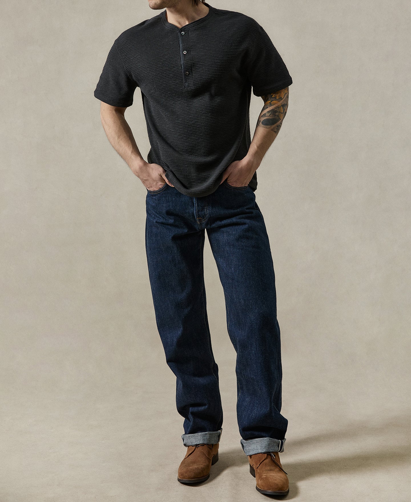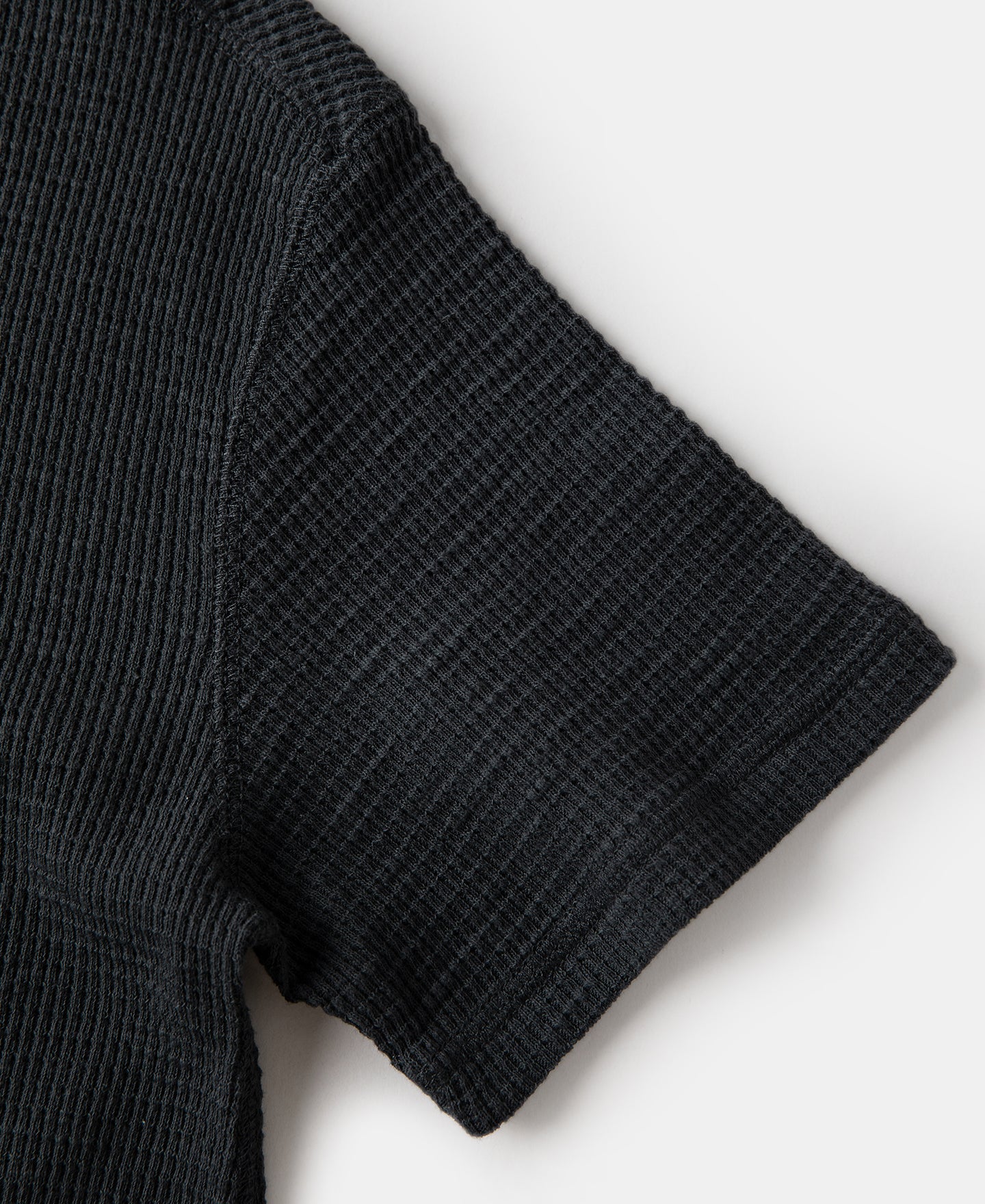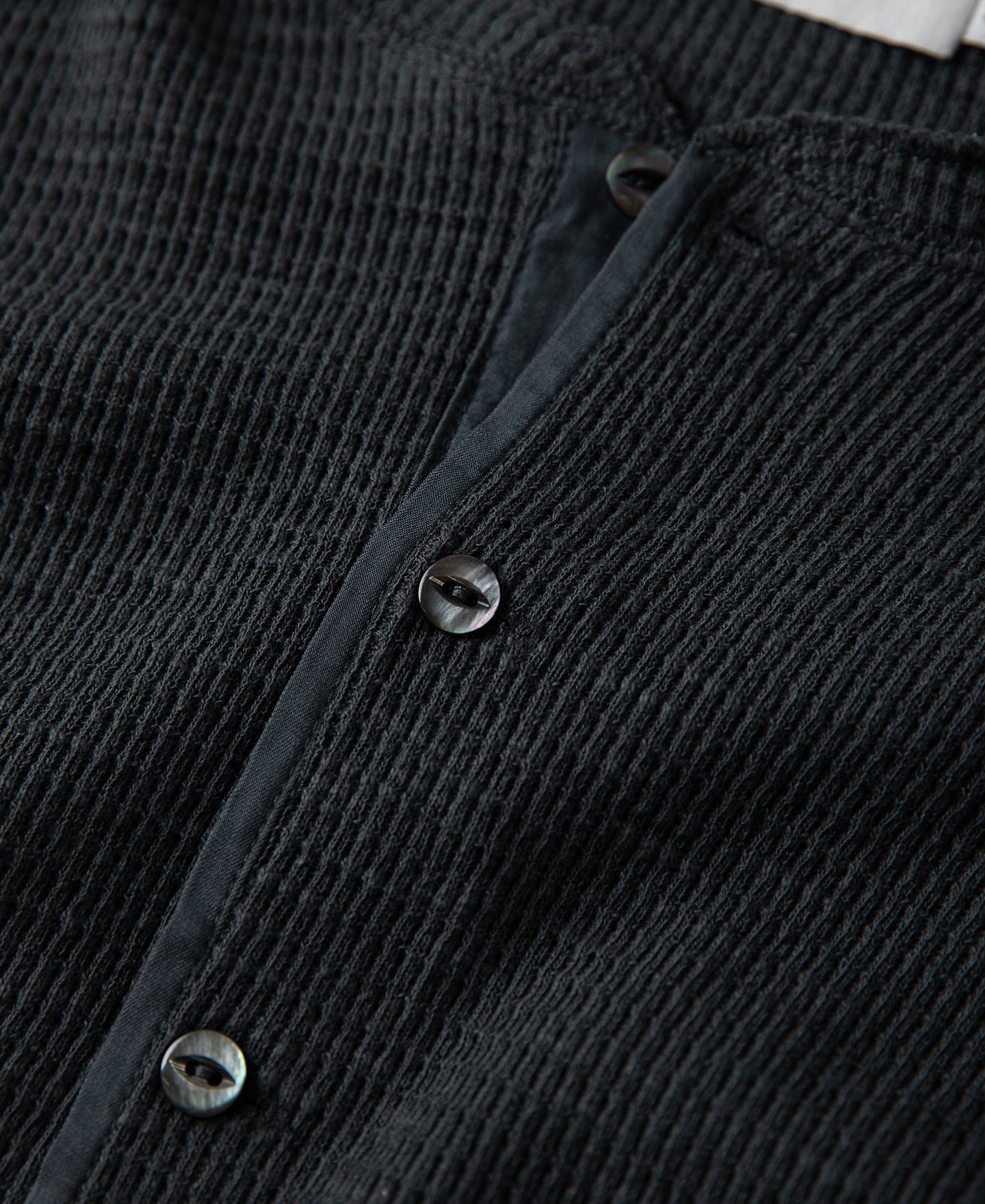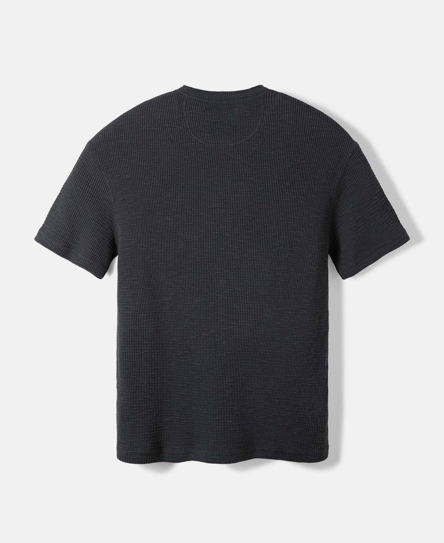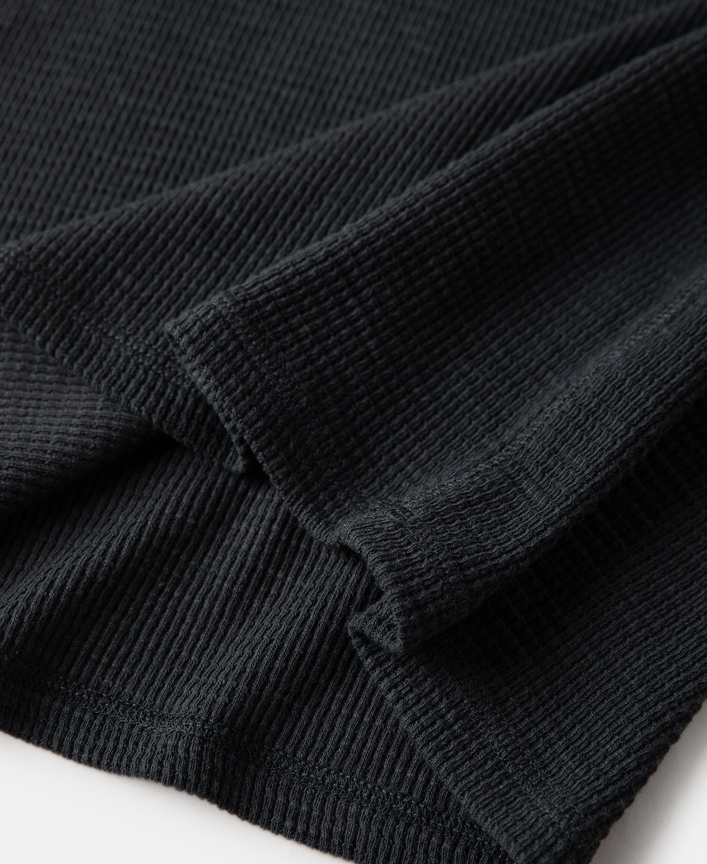 Crafted from a 220 GSM cotton waffle knit—also known as honeycomb for its textured grid pattern—this henley T-shirt combines softness with natural stretch. The raised weave allows for enhanced breathability and comfort, while durable triple-needle stitching ensures a clean, long-lasting finish.