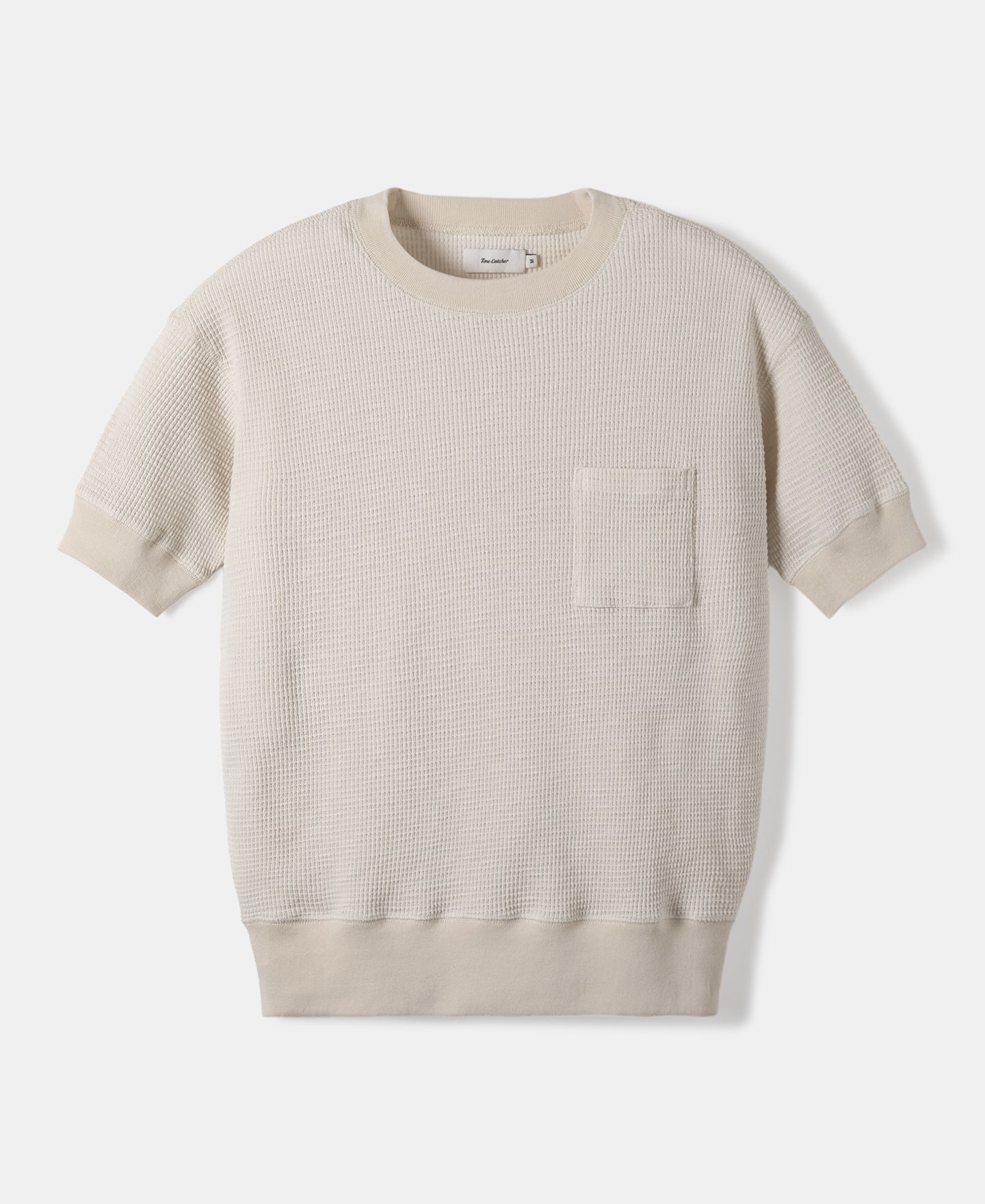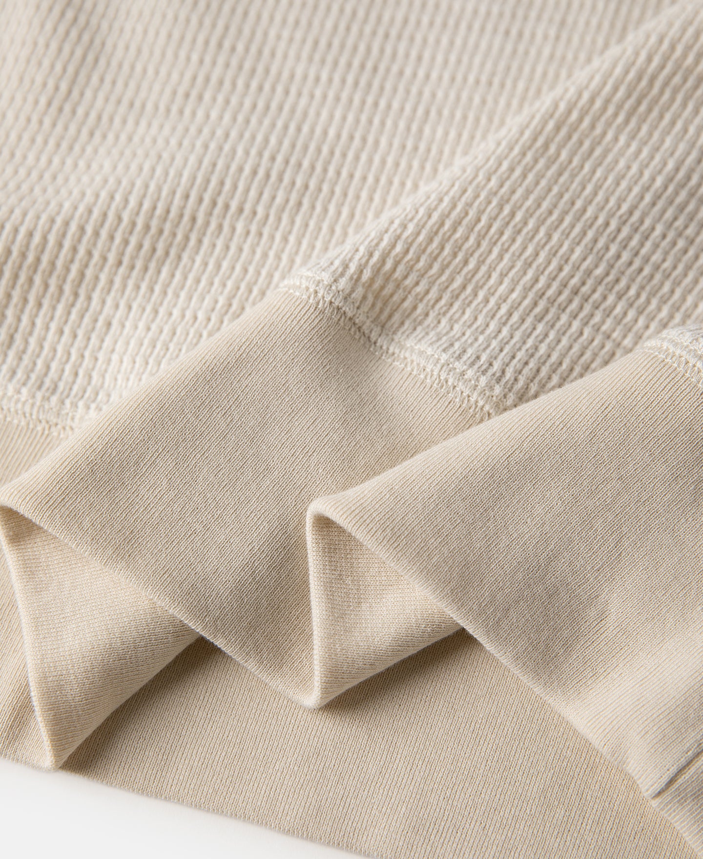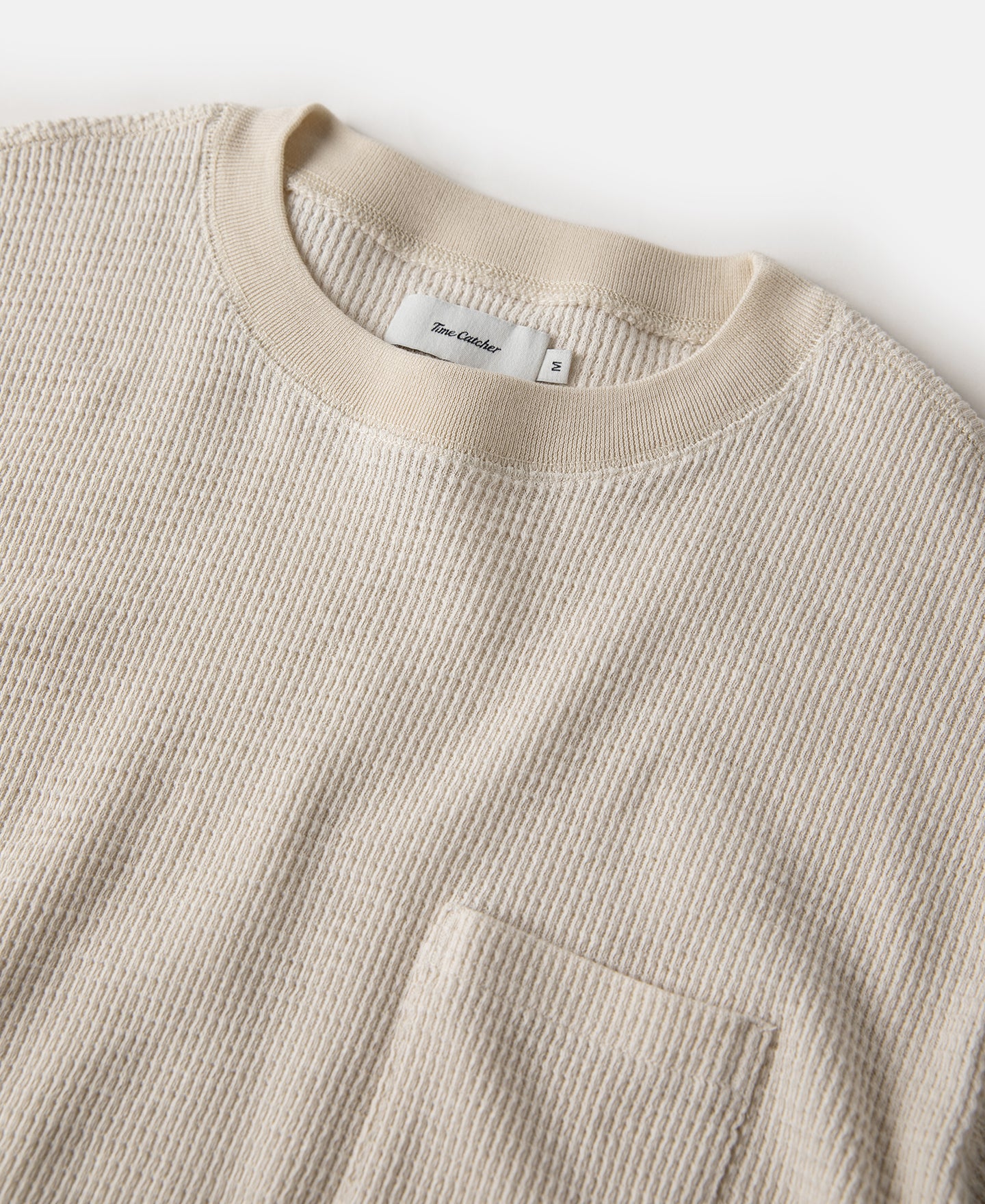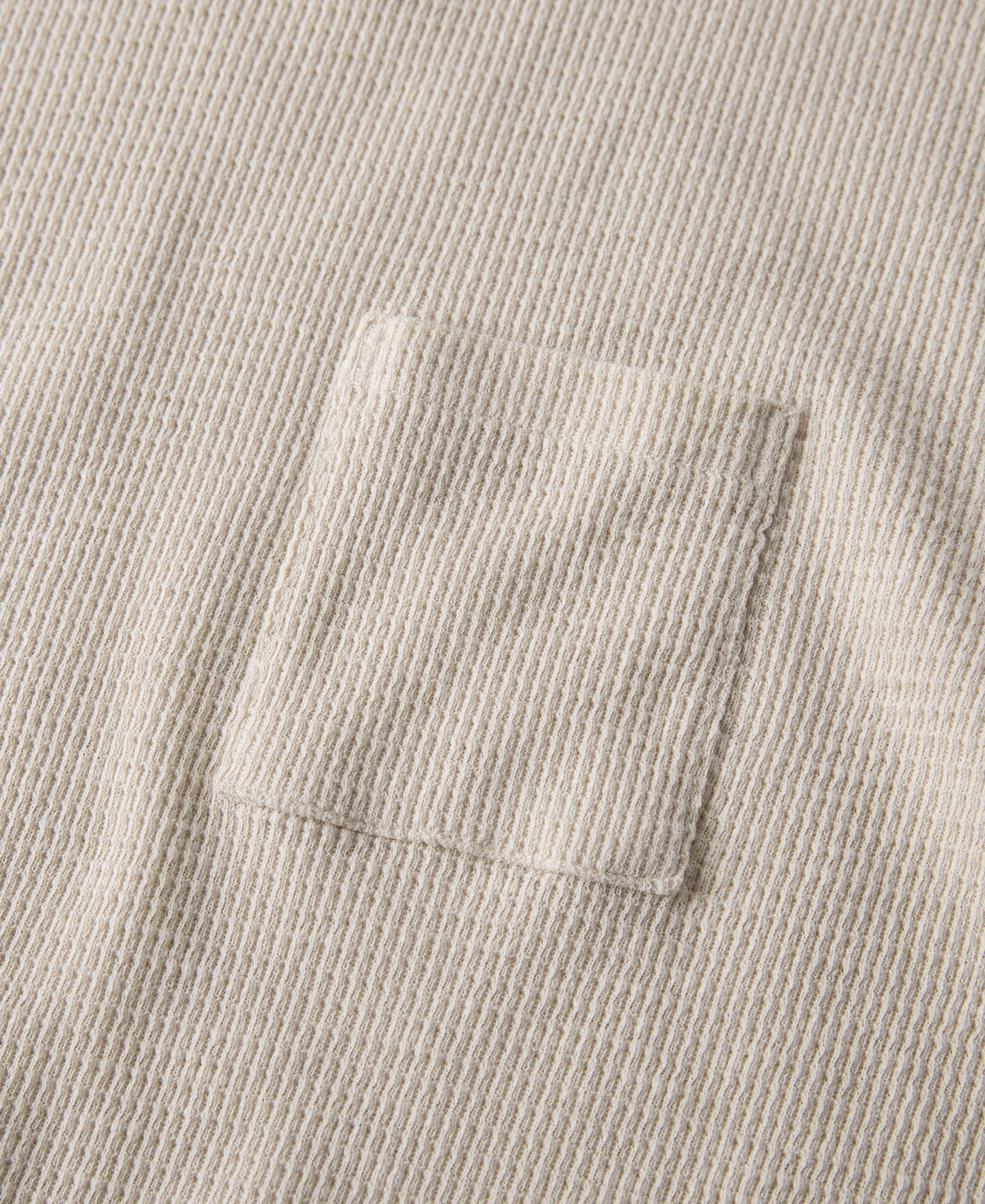 Crafted from a 220 GSM cotton waffle knit—also known as honeycomb for its textured grid pattern—this pocket T-shirt combines softness with natural stretch. The raised weave allows for enhanced breathability and comfort, while durable triple-needle stitching ensures a clean, long-lasting finish.