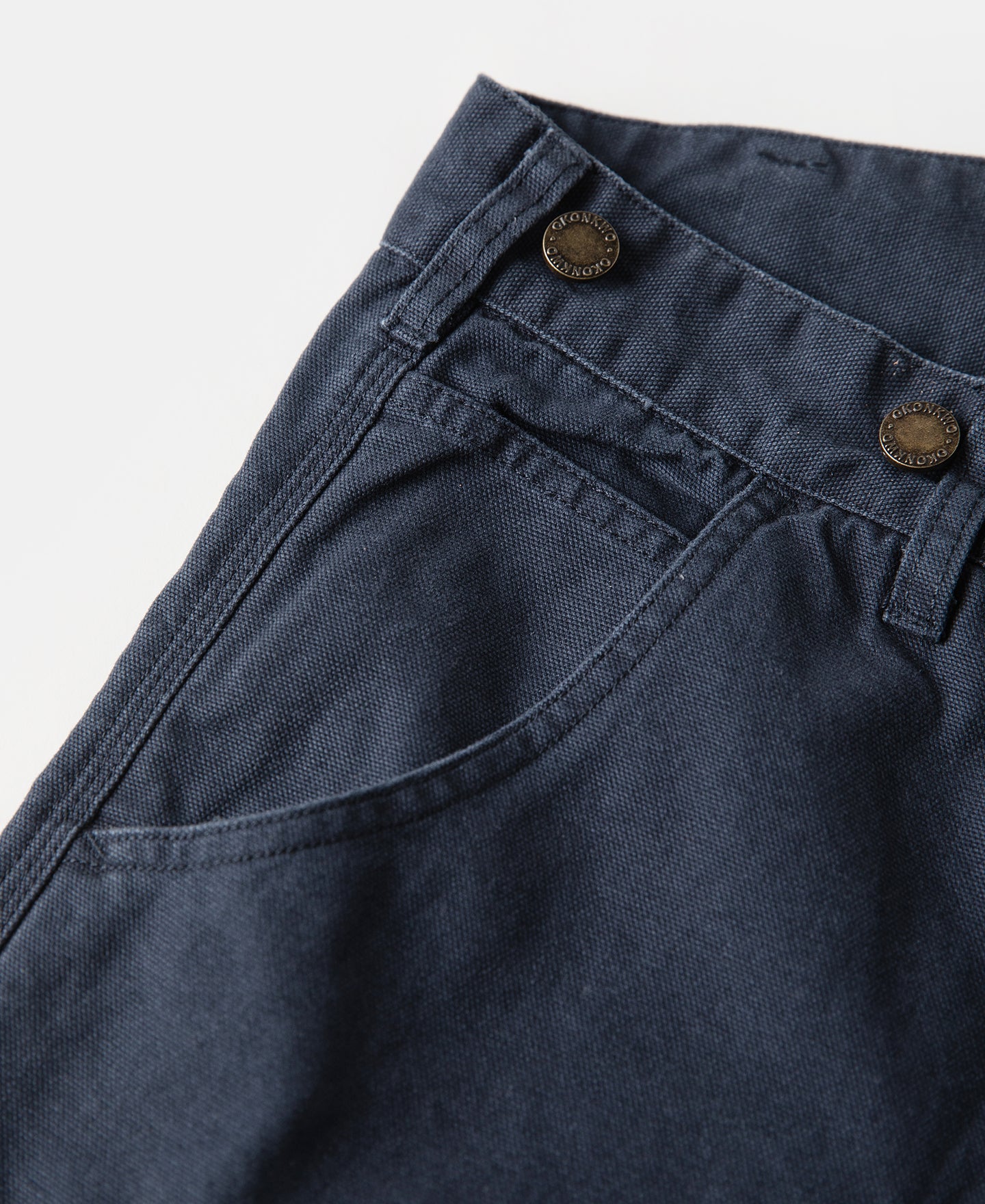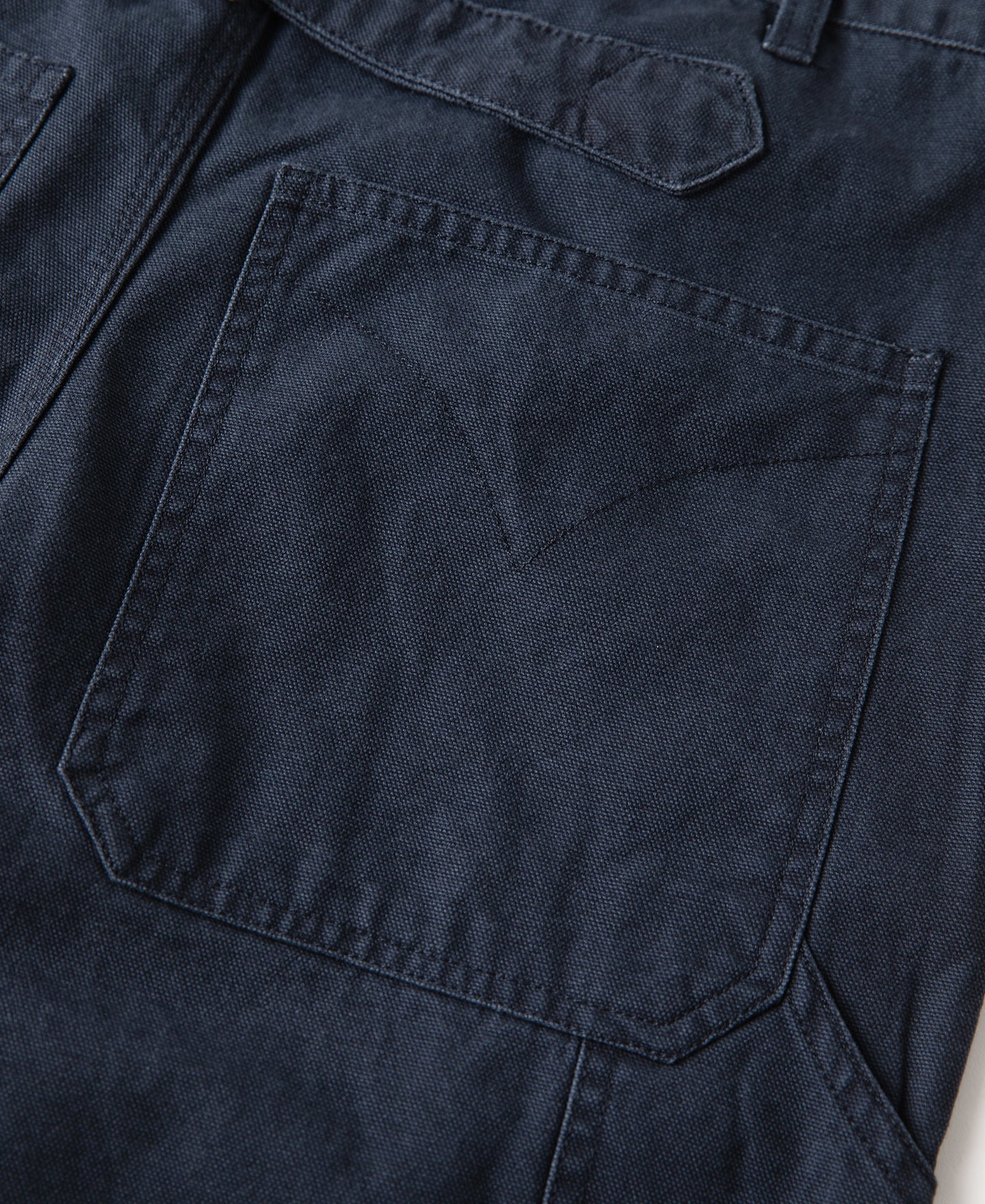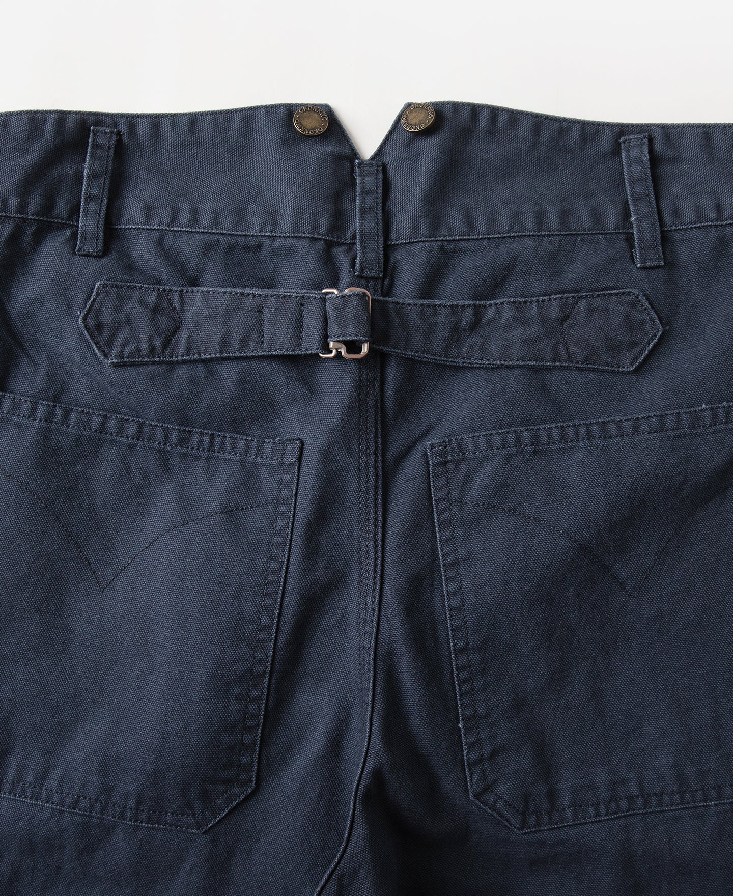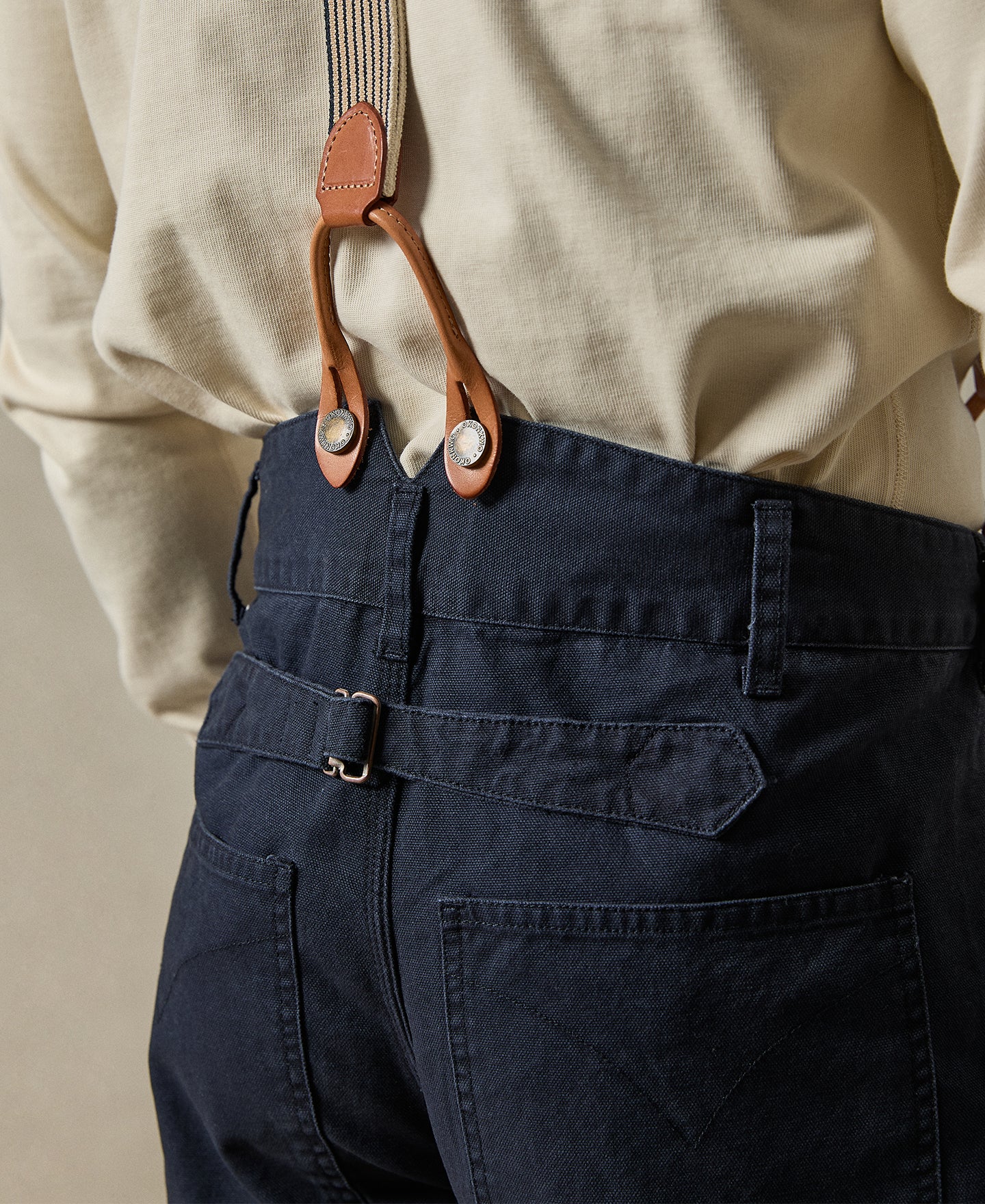 We have kept the classic elements of work overalls: the straight leg, uses a YKK zipper, the side has tool pocket, 7 aluminum alloy logo buttons at the waist, and the back waist has a copper adjustable buckle.