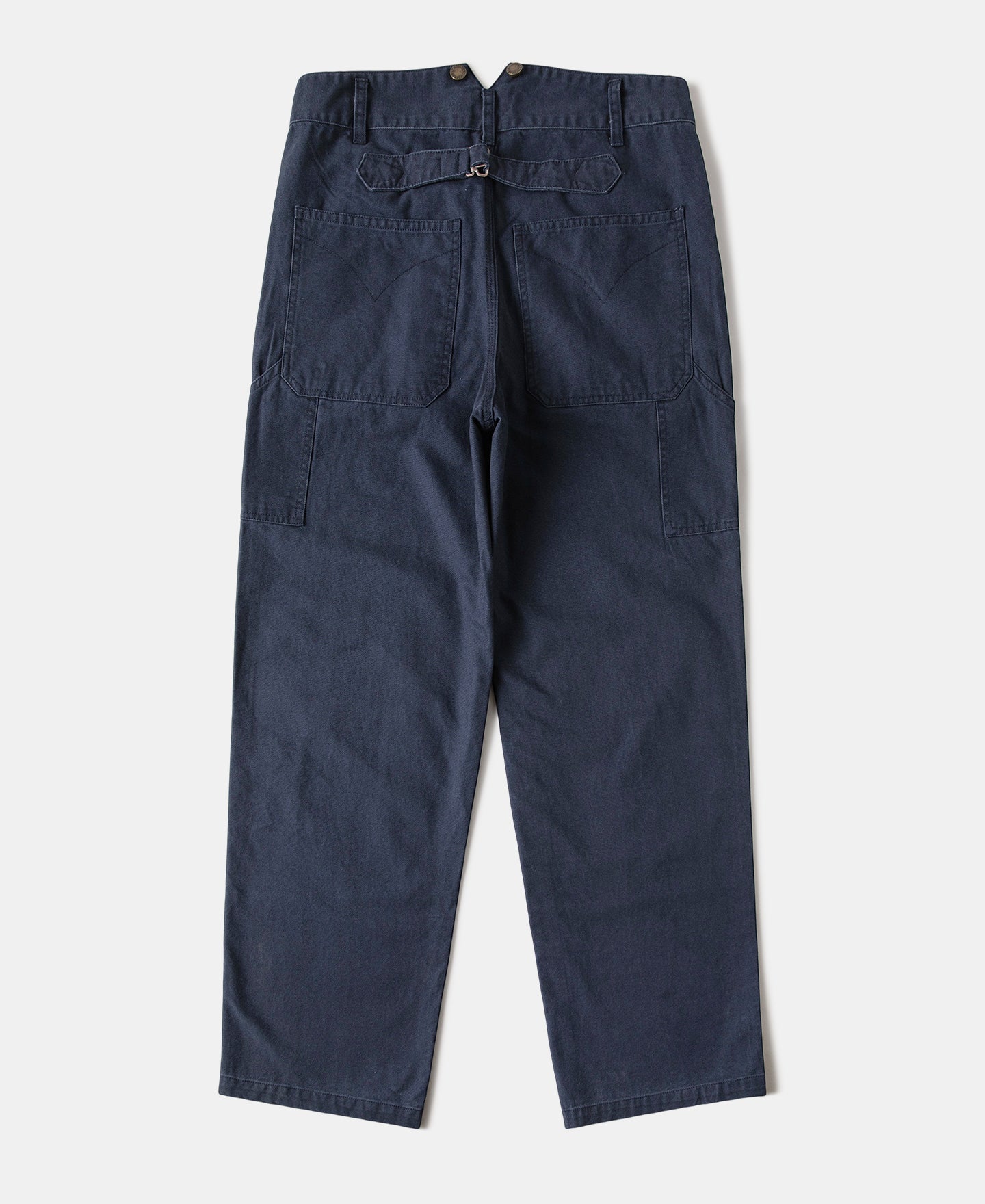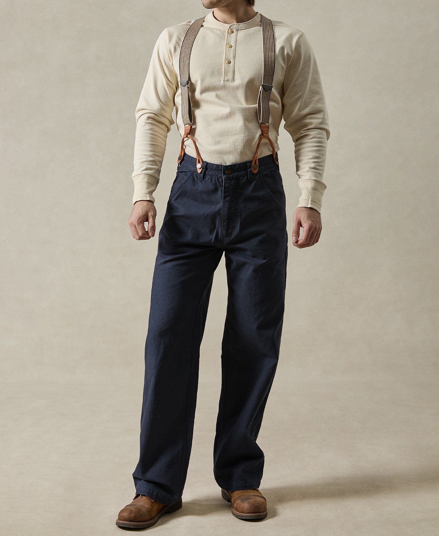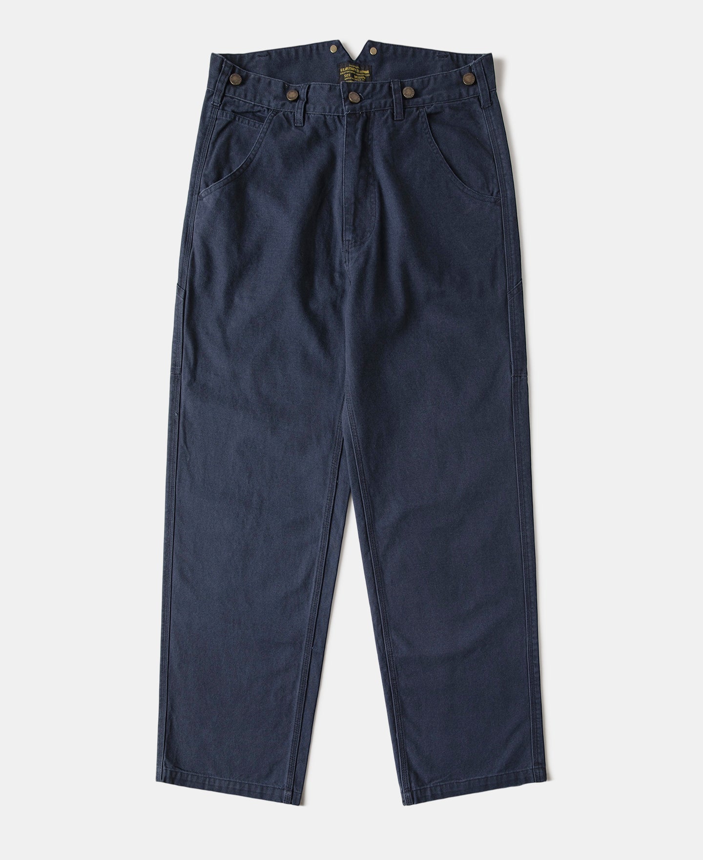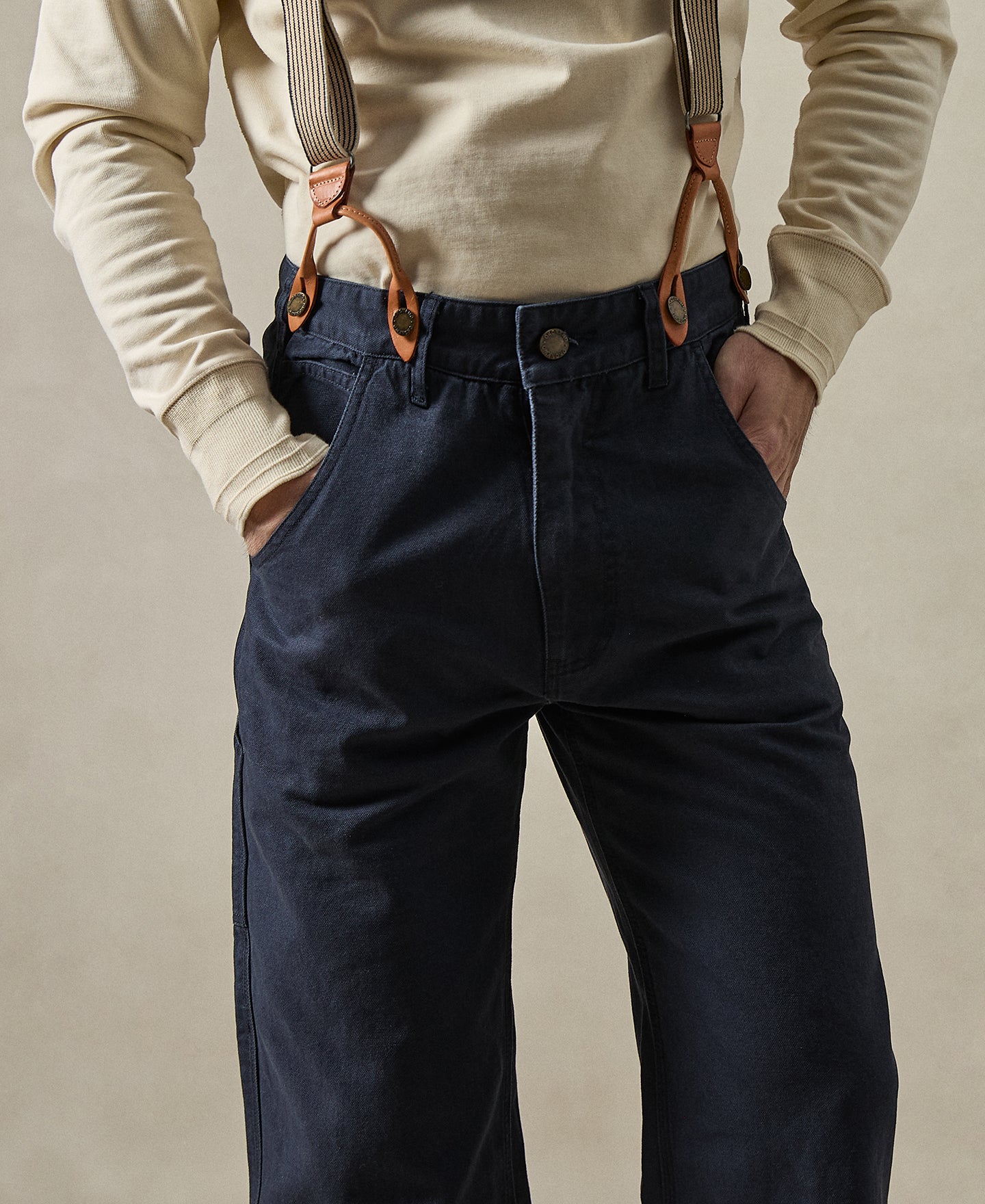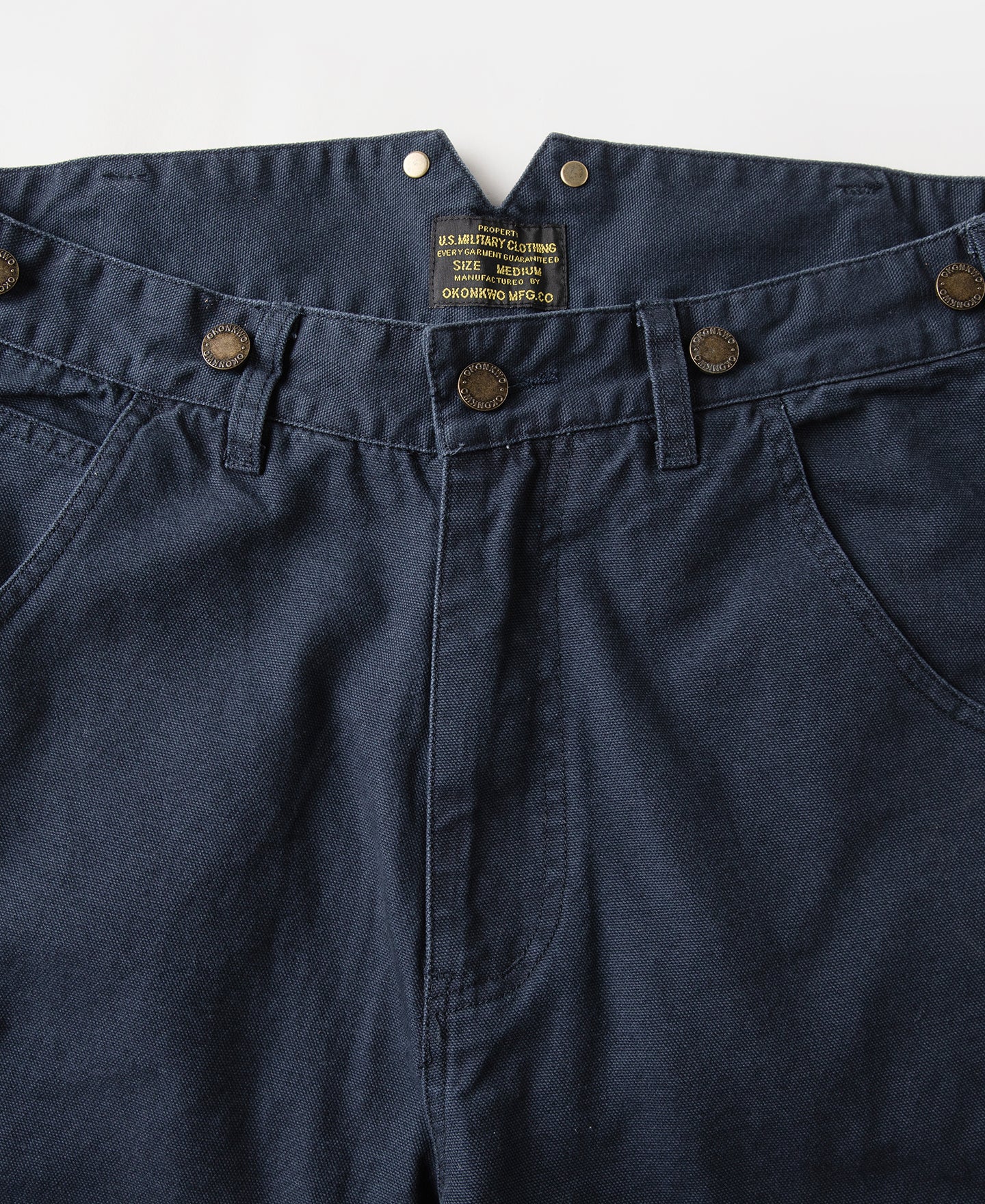 We have kept the classic elements of work overalls: the straight leg, uses a YKK zipper, the side has tool pocket, 7 aluminum alloy logo buttons at the waist, and the back waist has a copper adjustable buckle.