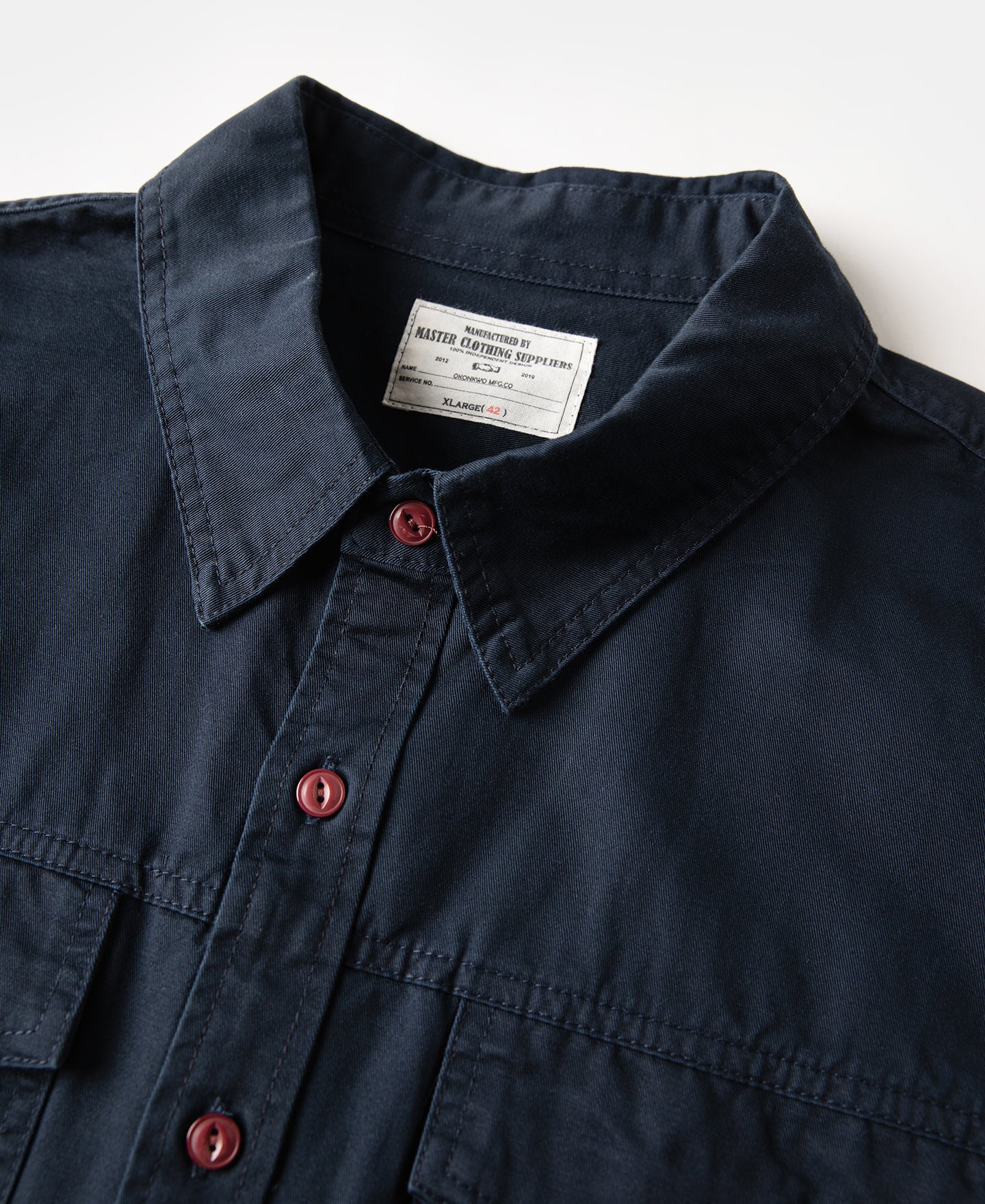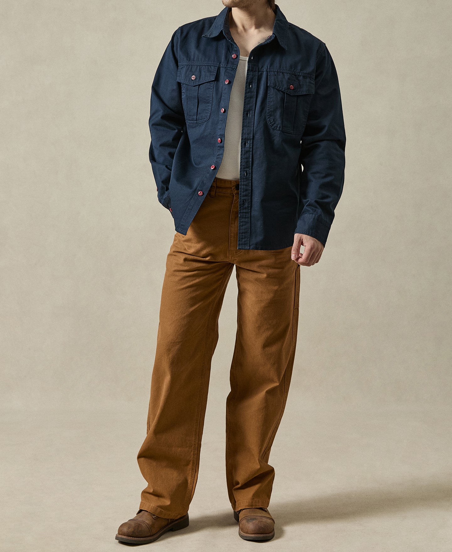 A faithful reproduction of the classic engineer work shirt. This piece carries the spirit of old-school utility garments, with a silhouette that echoes painter’s smocks.