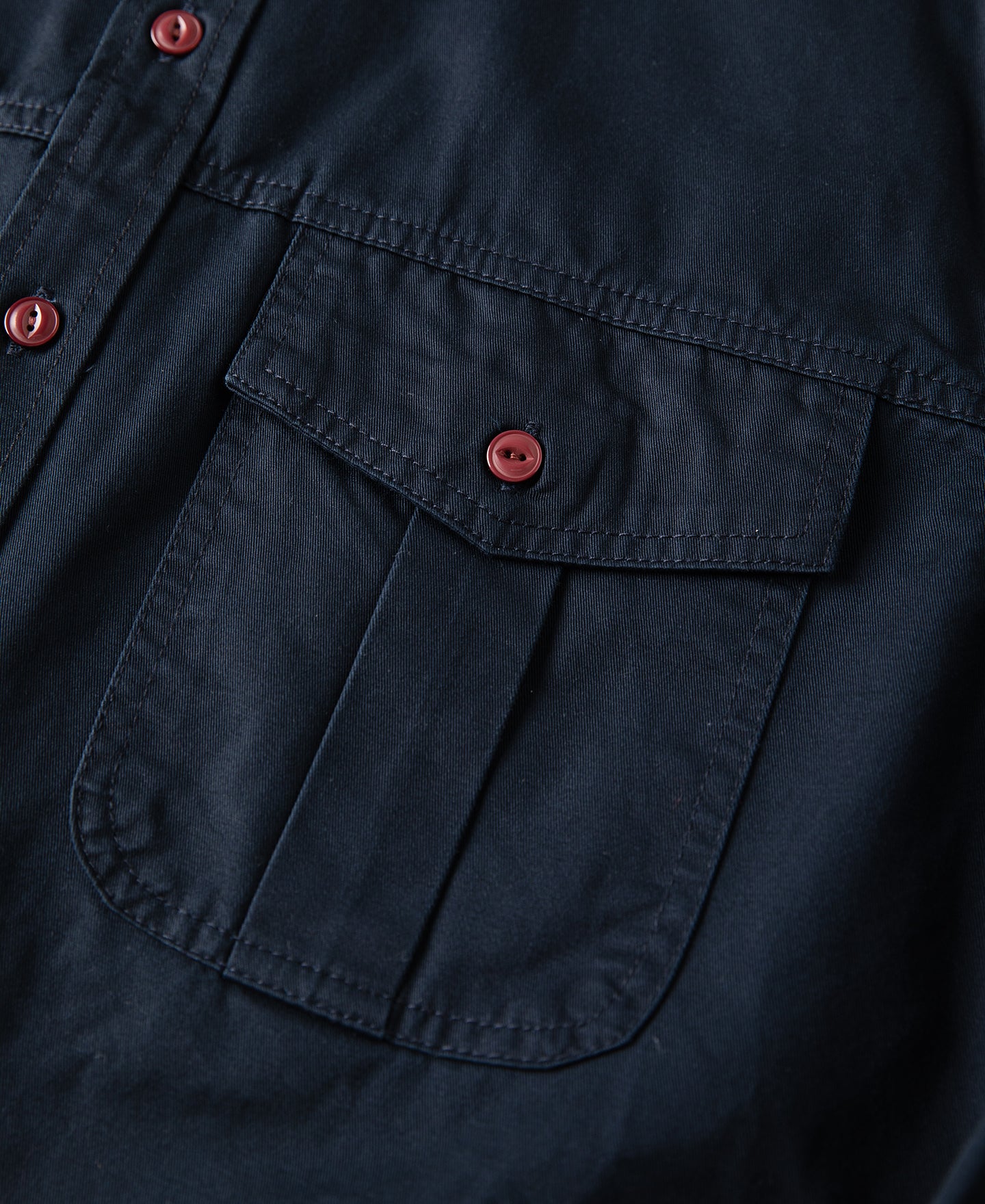 Made from 100% plain weave cotton for a crisp hand feel. It features twin pleated chest pockets and contrast buttons for a subtle visual pop. Designed in a classic straight cut with a curved hem—versatile enough to wear as an overshirt or light shirt jacket. Just pair it with work trousers to complete a timeless look.