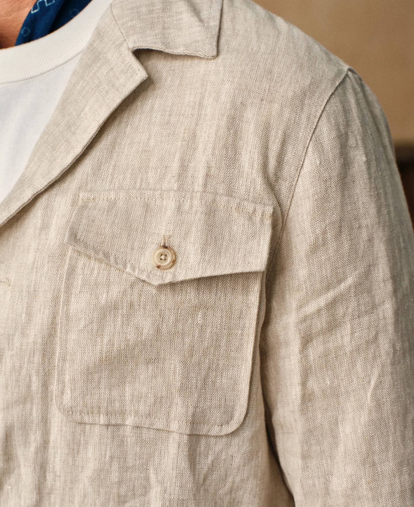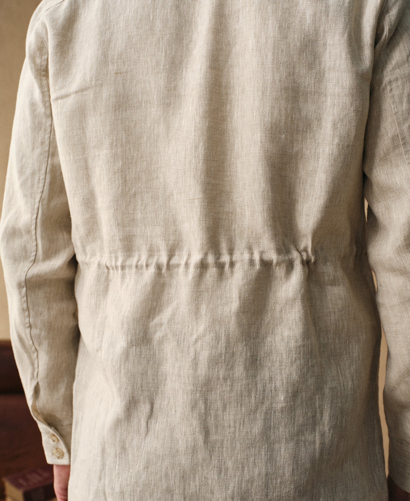 Crafted from 240 GSM pure linen in a natural tone, this jacket features a classic safari silhouette with a point collar and button-front closure. Lightweight yet structured, it offers a timeless, rugged character.