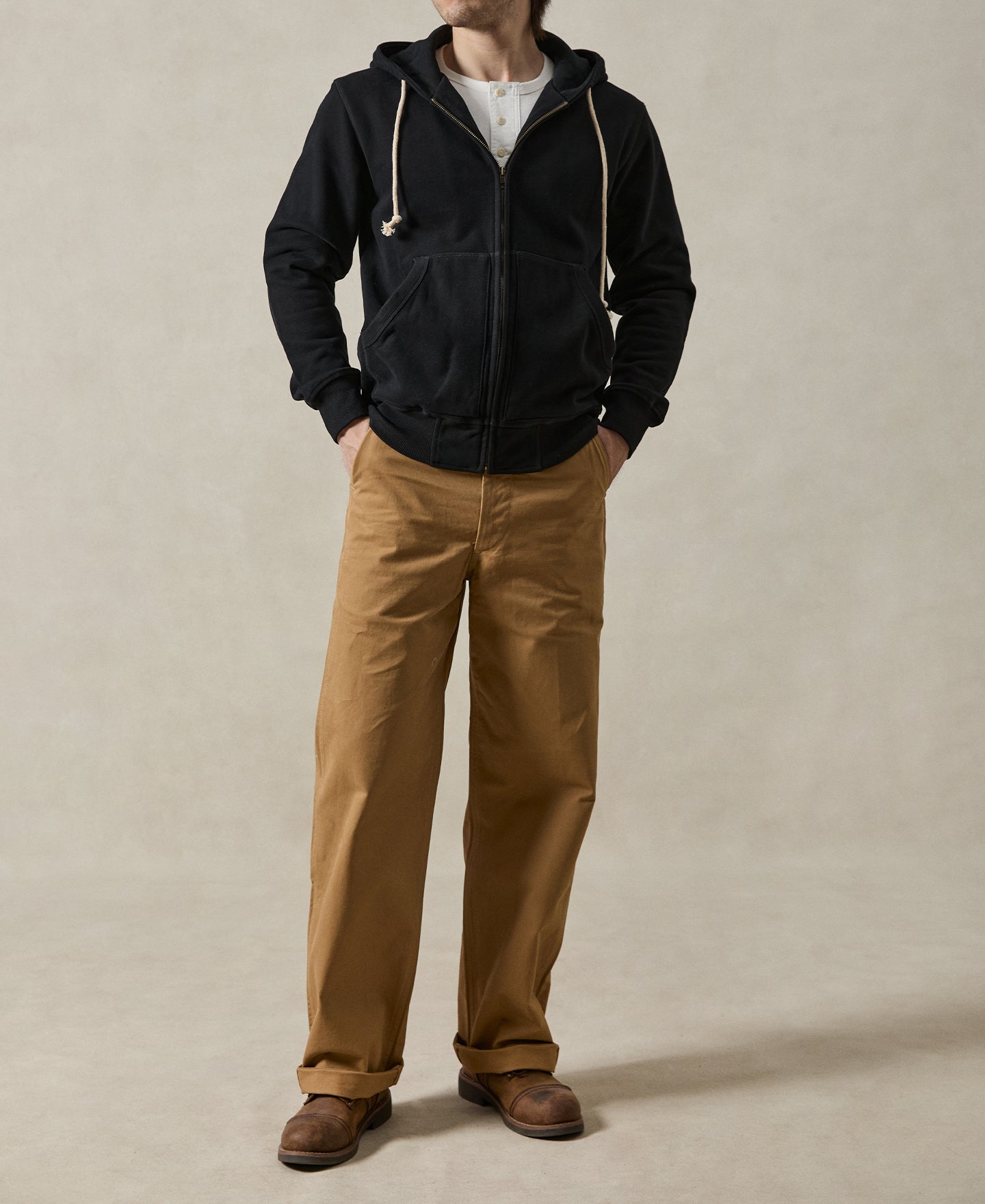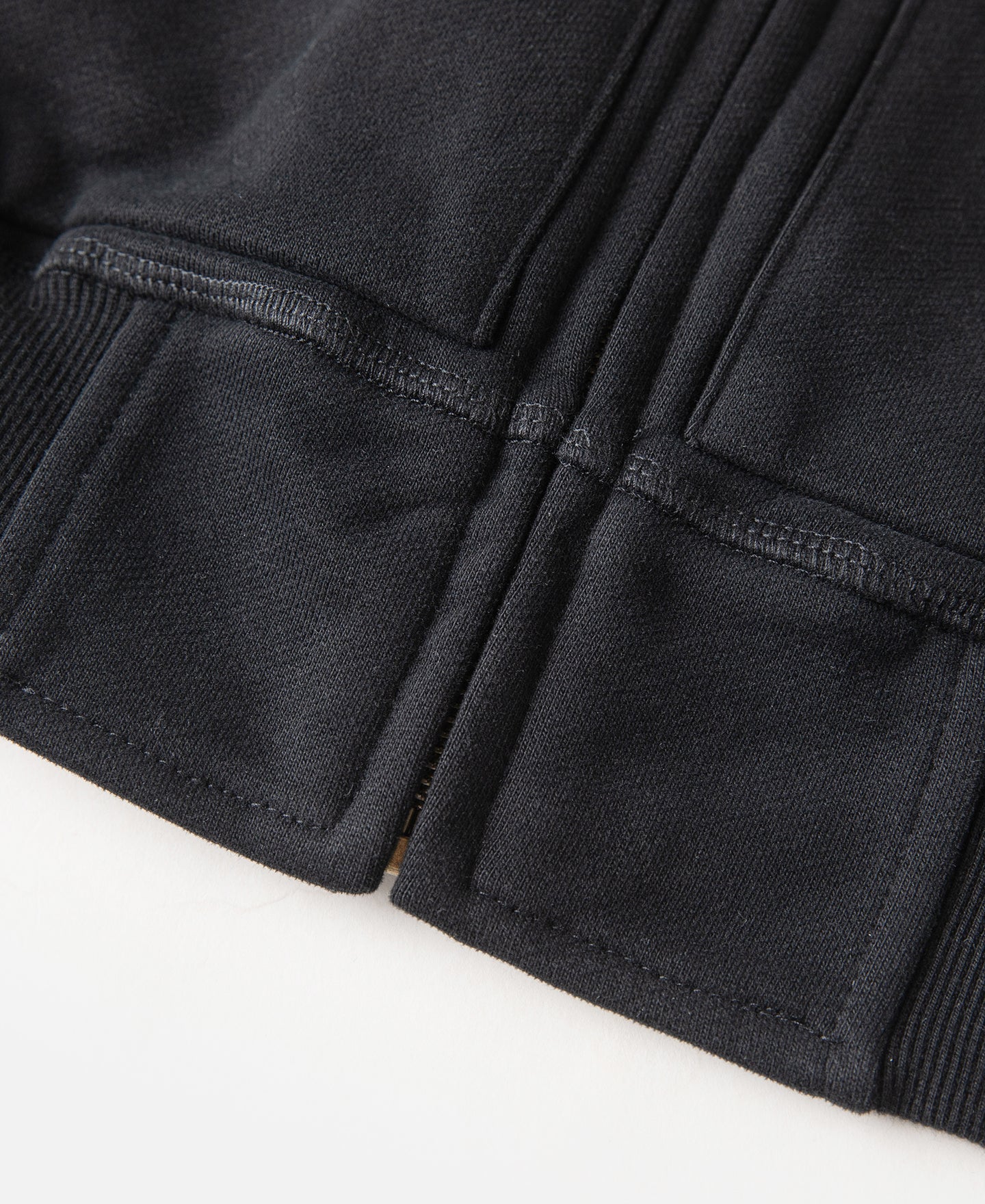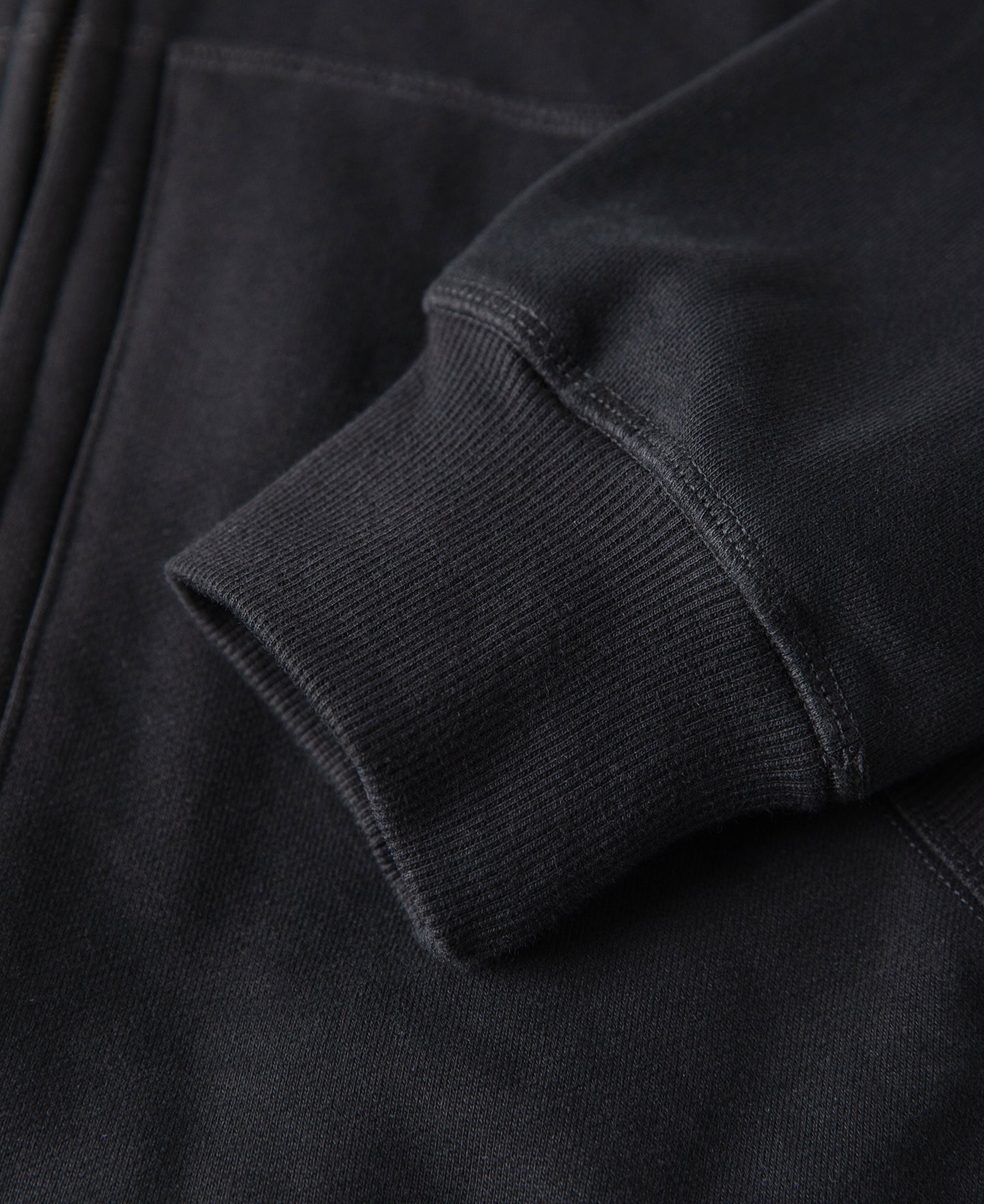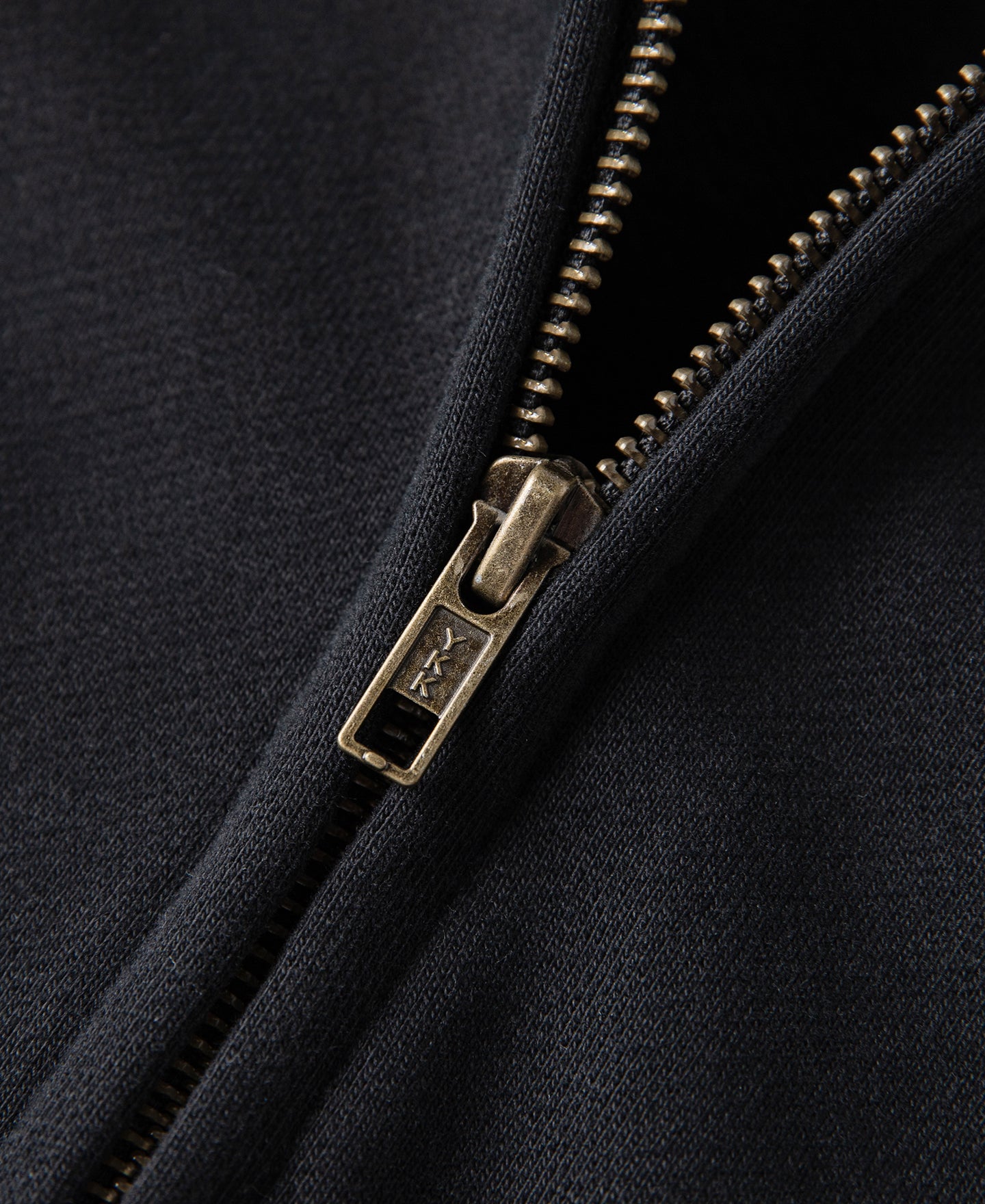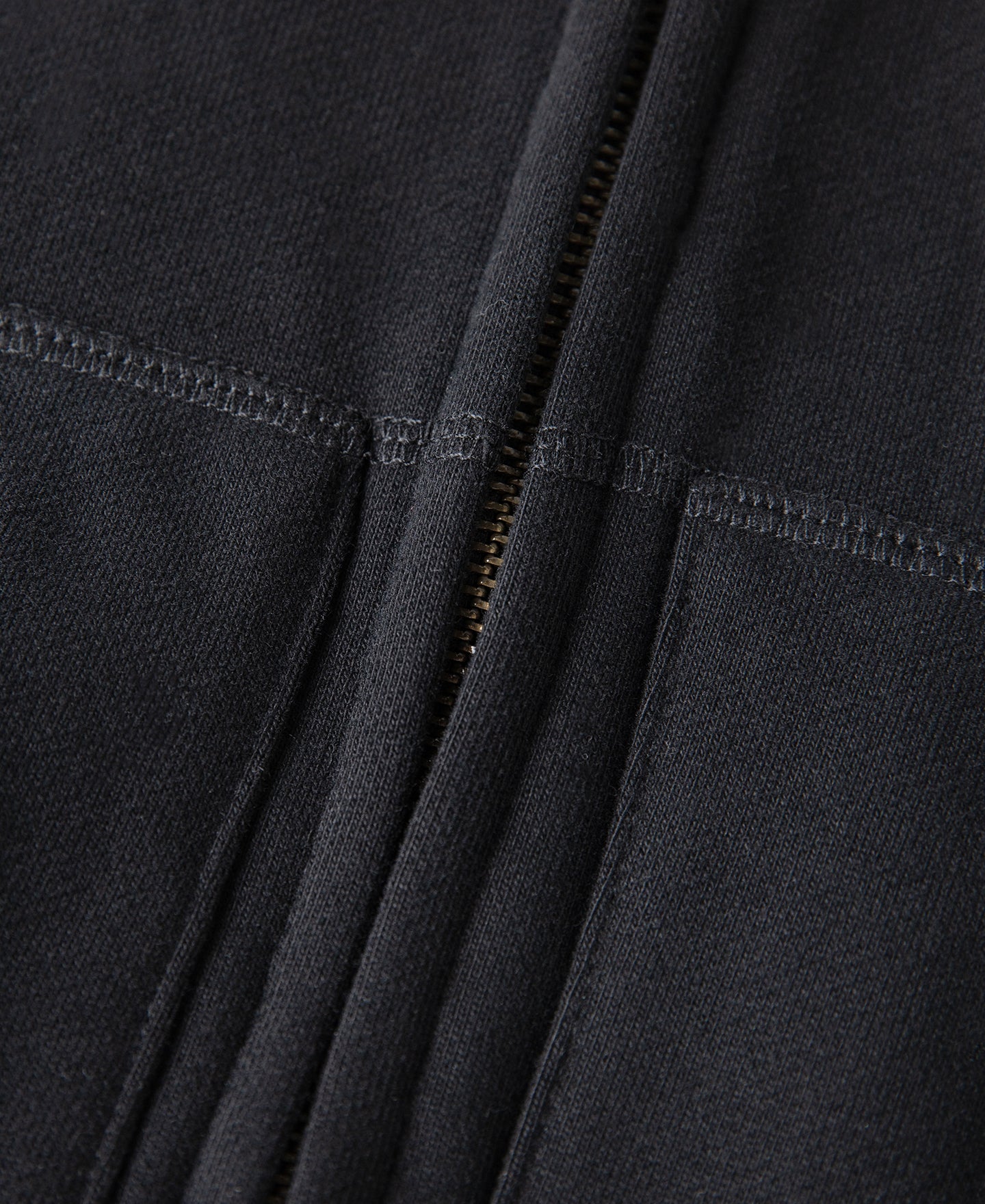 This 500g heavyweight terry zip-up hoodie is built for durability and structure. The dense fabric feels substantial yet breathable with its loopback interior, avoiding the shedding common in fleece. The hood is reinforced with a double-layer build for shape and coverage. Exposed stitching throughout gives it a sturdy, utilitarian character, while the rib-trimmed pockets add both function and detail.