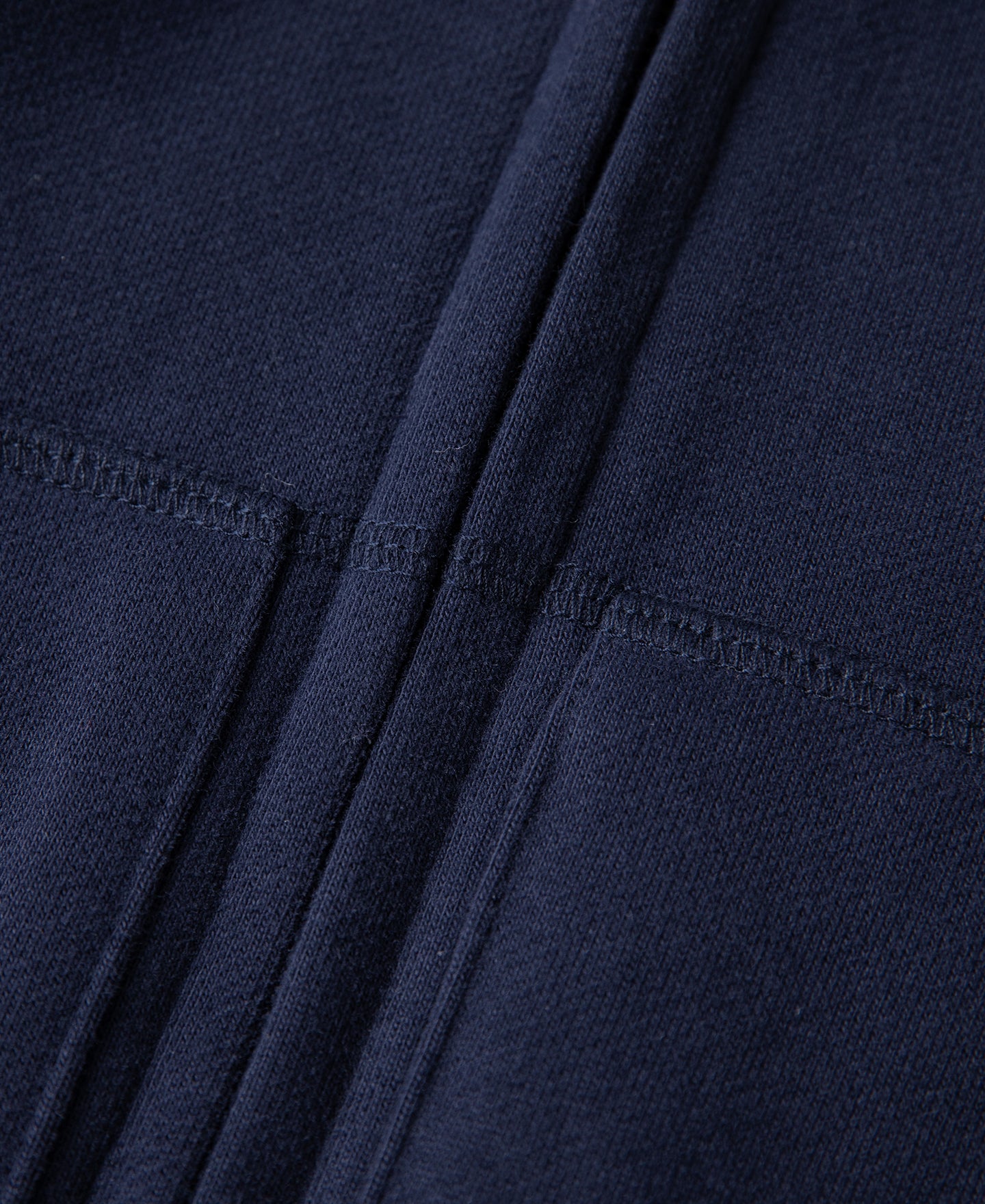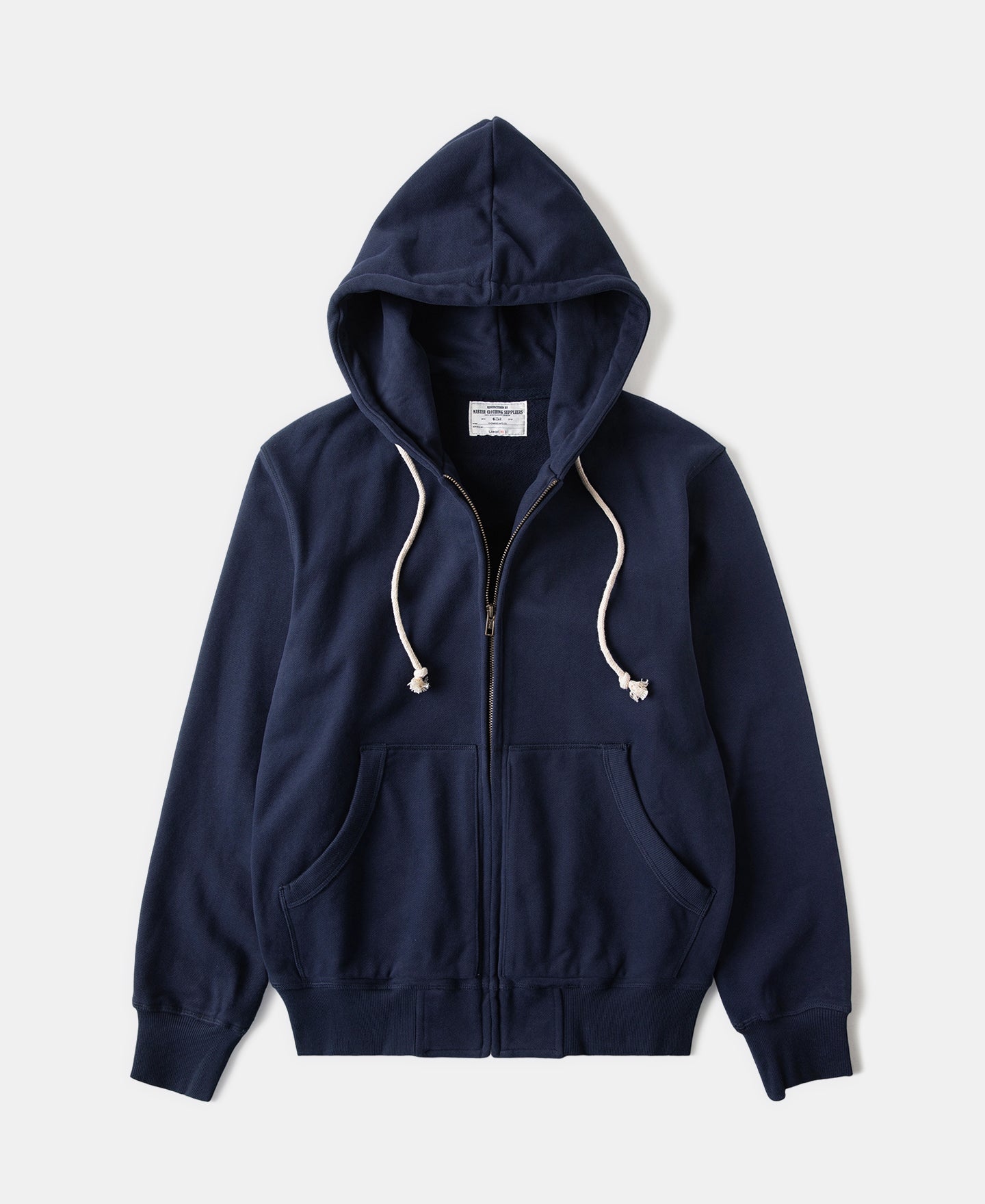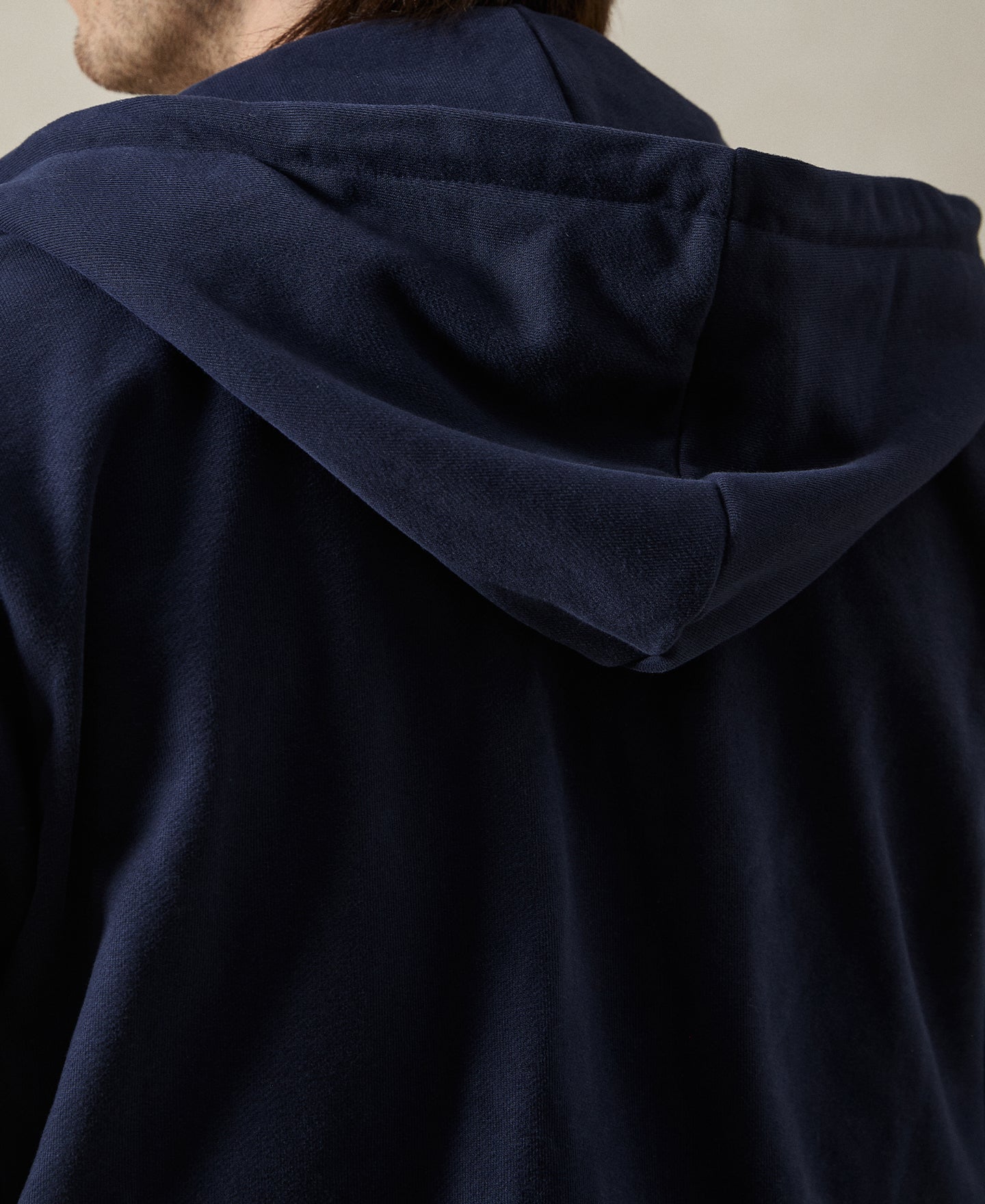This 500g heavyweight terry zip-up hoodie is built for durability and structure. The dense fabric feels substantial yet breathable with its loopback interior, avoiding the shedding common in fleece. The hood is reinforced with a double-layer build for shape and coverage. Exposed stitching throughout gives it a sturdy, utilitarian character, while the rib-trimmed pockets add both function and detail.