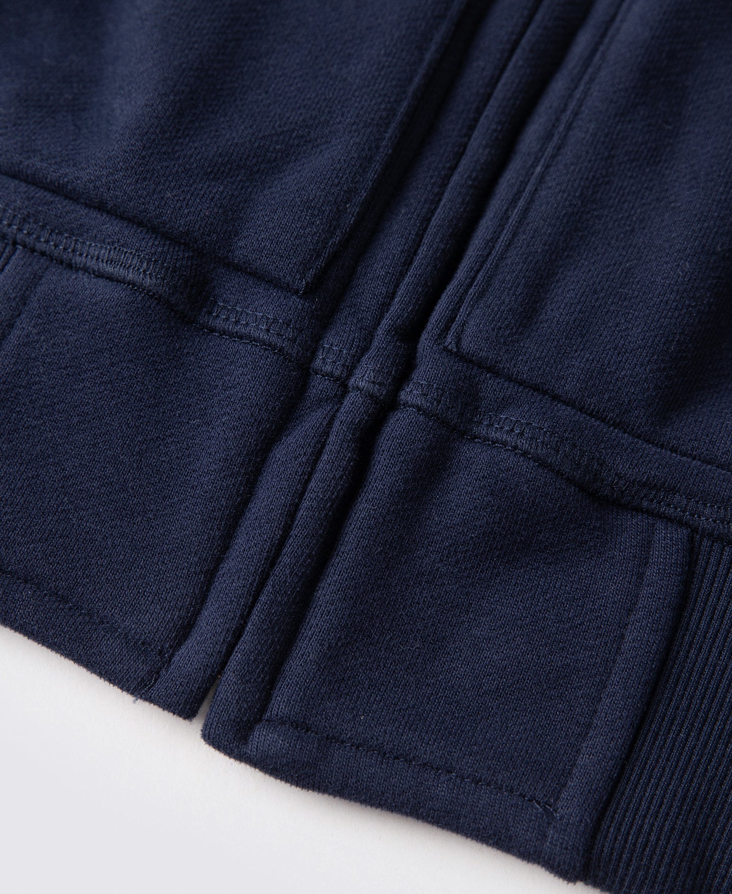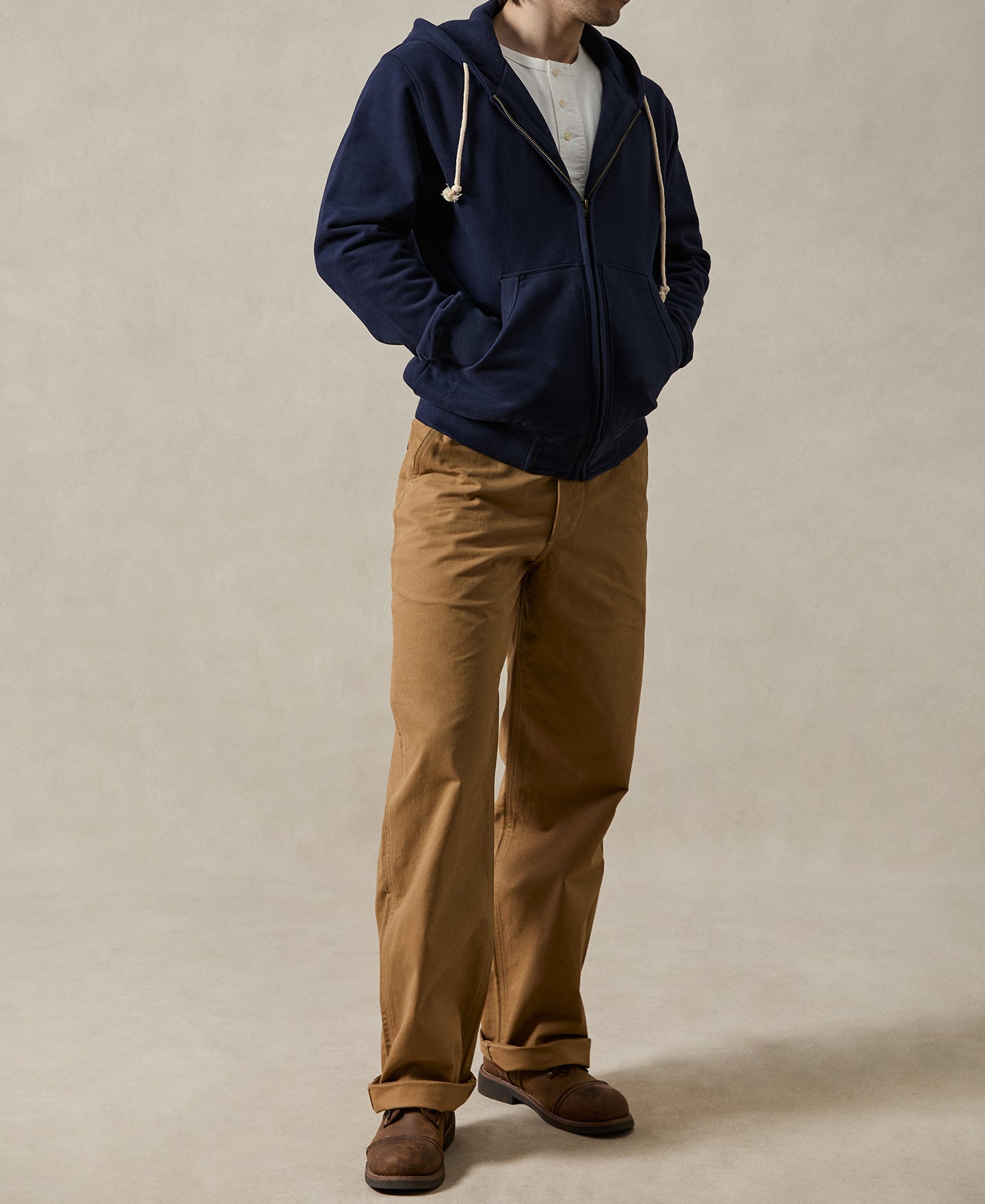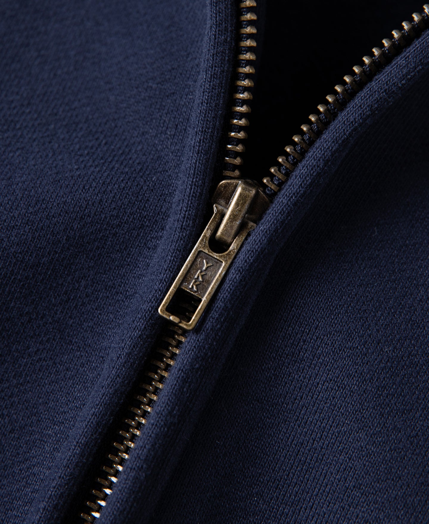 This 500g heavyweight terry zip-up hoodie is built for durability and structure. The dense fabric feels substantial yet breathable with its loopback interior, avoiding the shedding common in fleece. The hood is reinforced with a double-layer build for shape and coverage. Exposed stitching throughout gives it a sturdy, utilitarian character, while the rib-trimmed pockets add both function and detail.