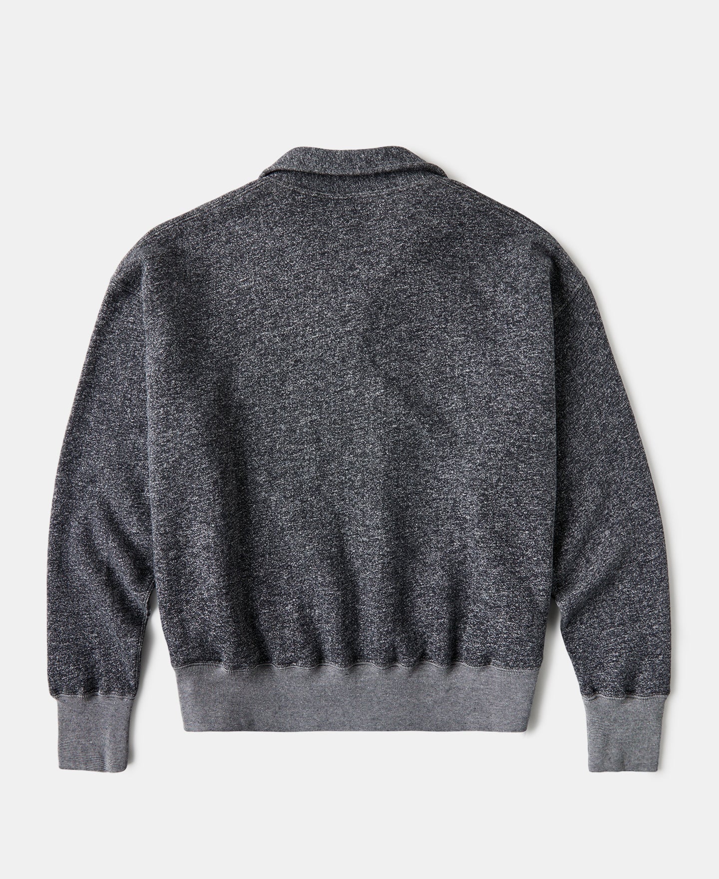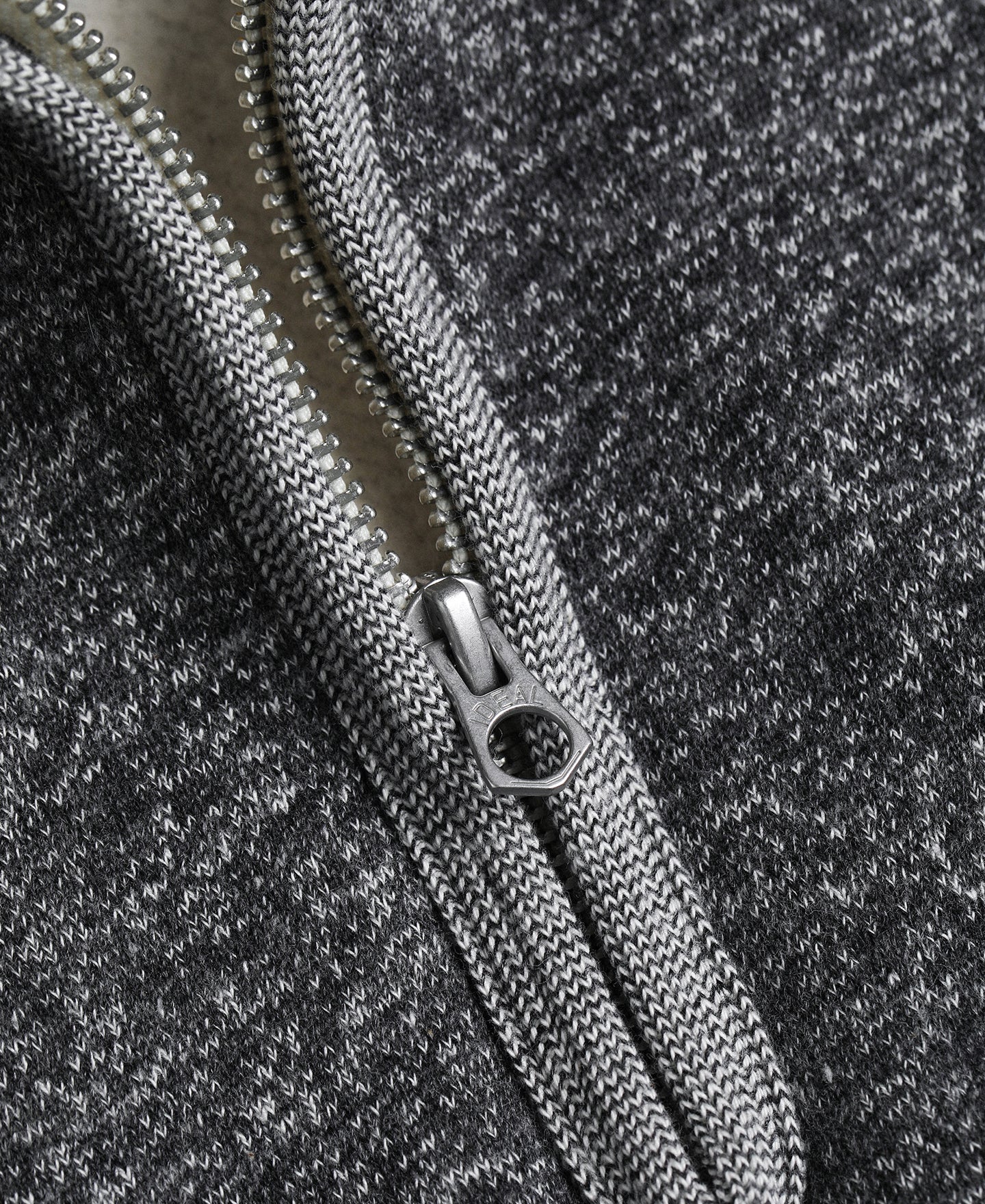 Crafted from 400g deep heather gray cotton fleece with a soft, brushed interior. It features a vintage metal IDEAL zipper and ribbed cuffs and hem.