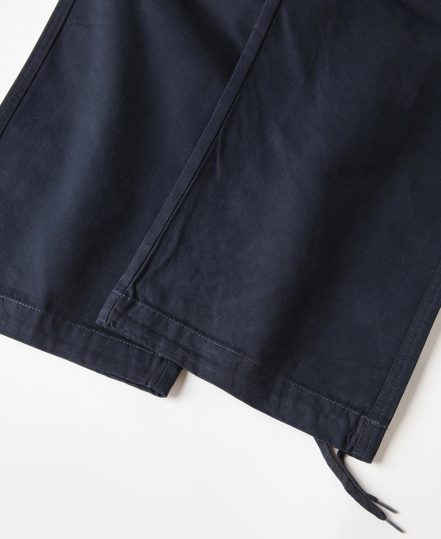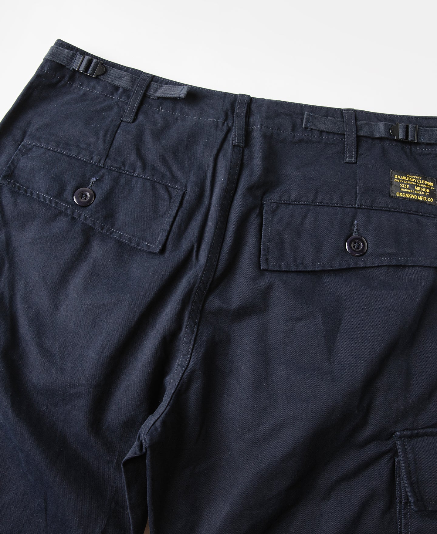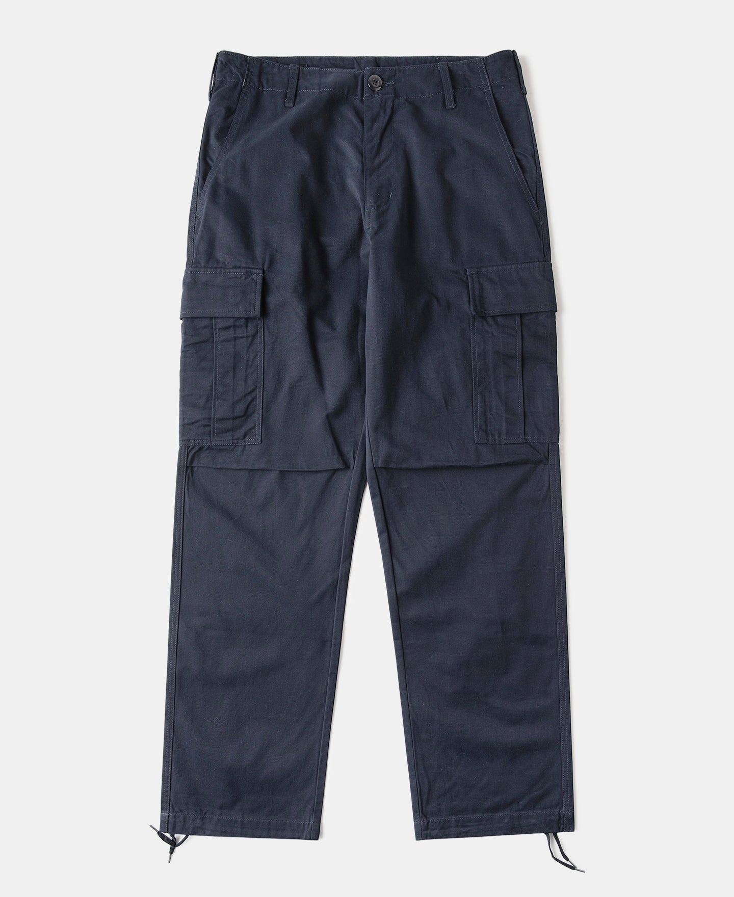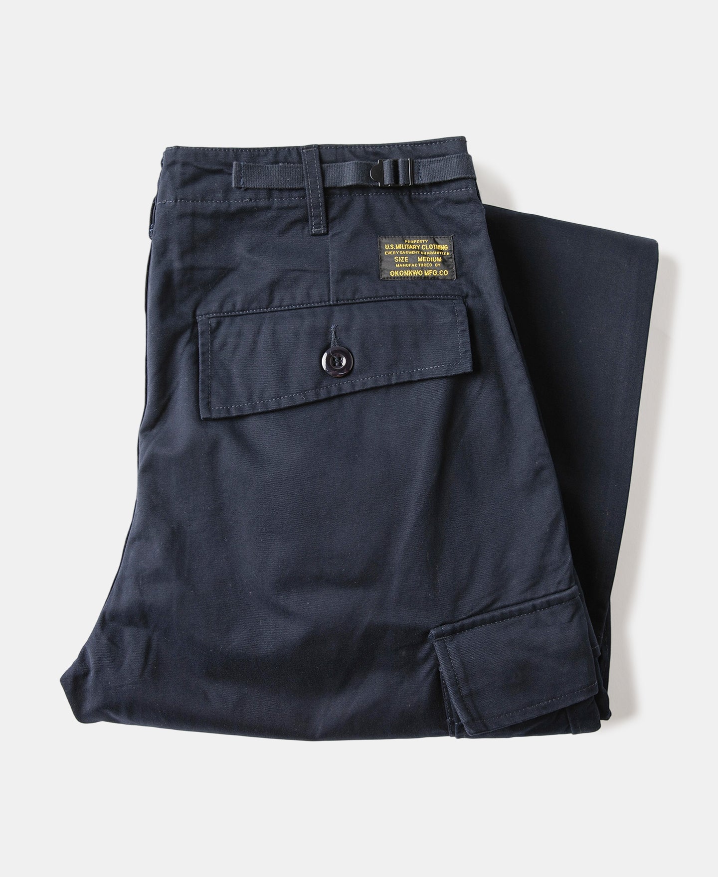The Okonkwo Modified M-65 Cargo Pants reimagine the classic US Army M-65 field trousers with a modern fit. The silhouette has been slimmed down from the original oversized cut, making it more versatile for daily wear. Iconic details such as adjustable waist tabs and drawstring hems are retained, while the front pockets are streamlined without flaps. Rear pockets feature angled flaps for added depth, and the side cargo pockets conceal an extra compartment for storing small essentials like a lighter.