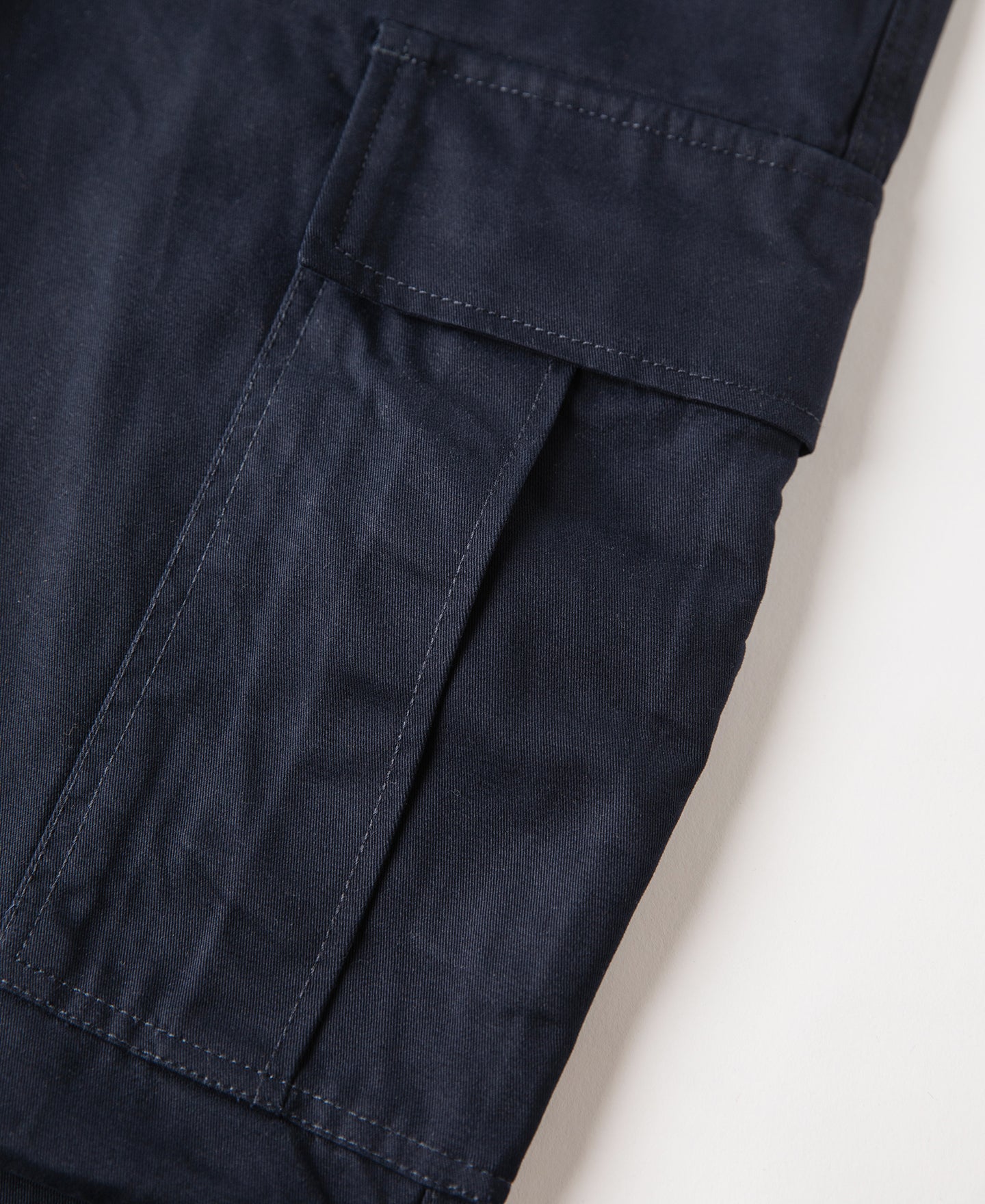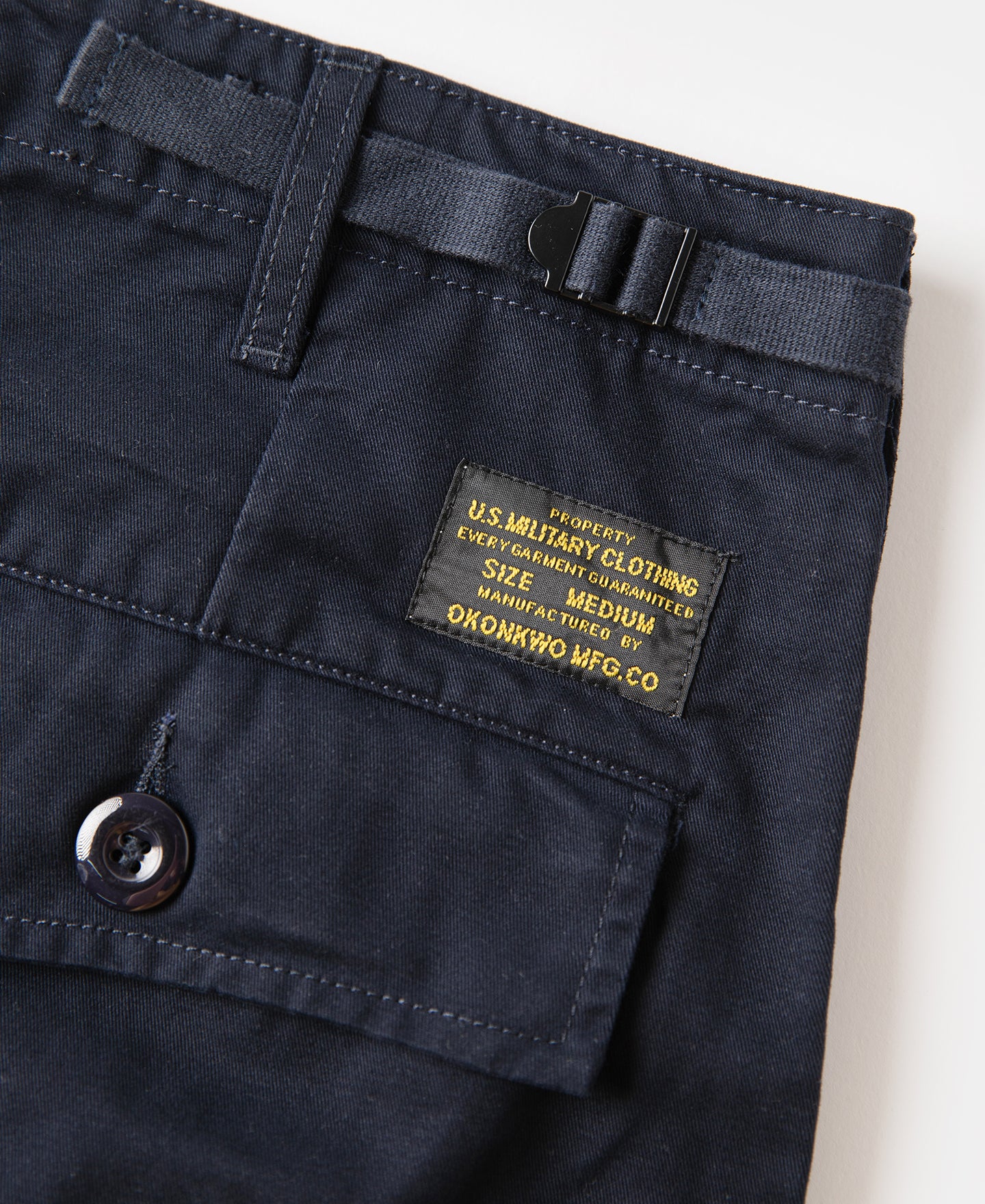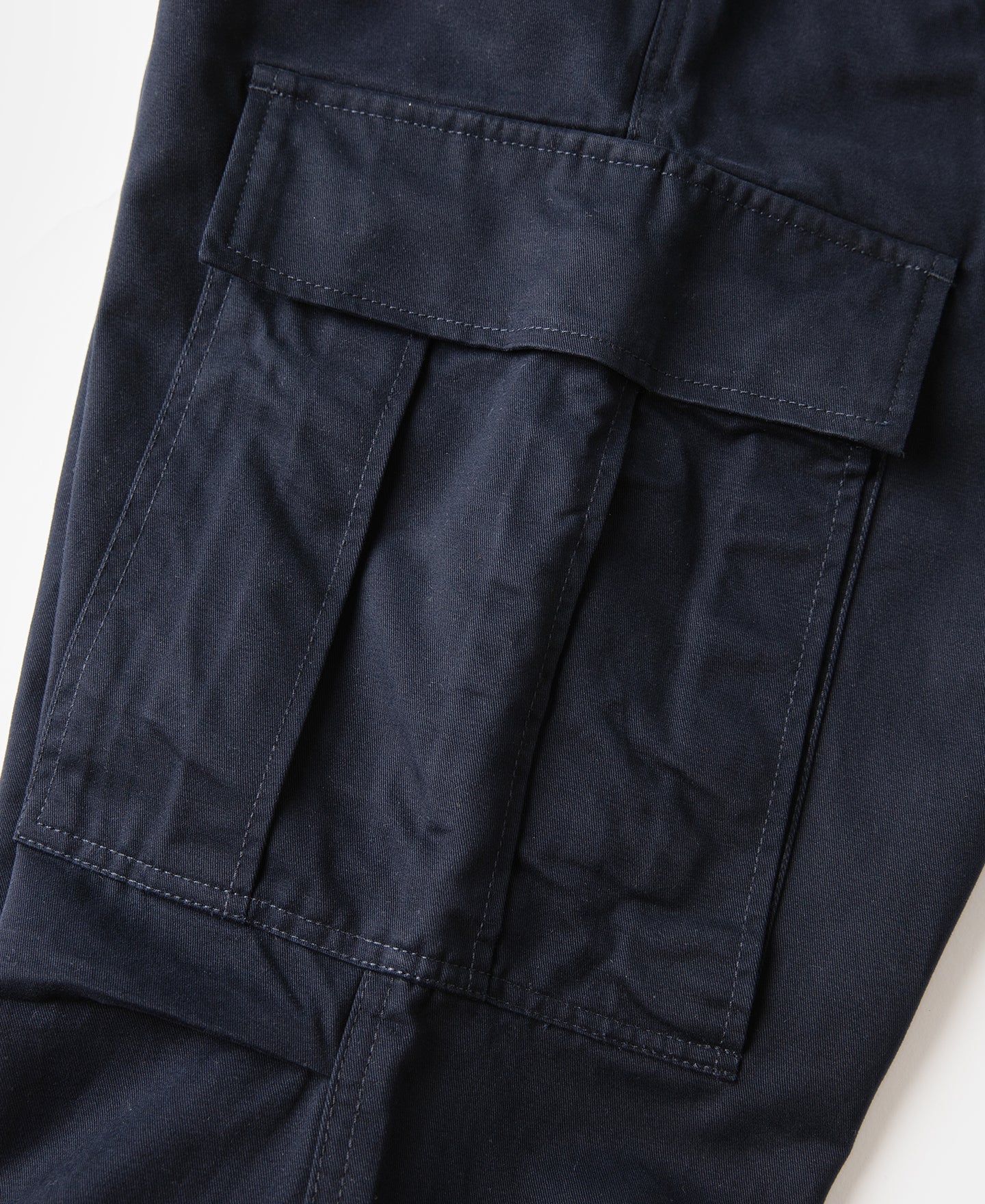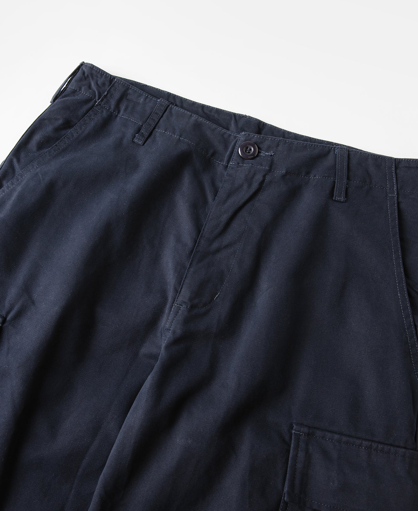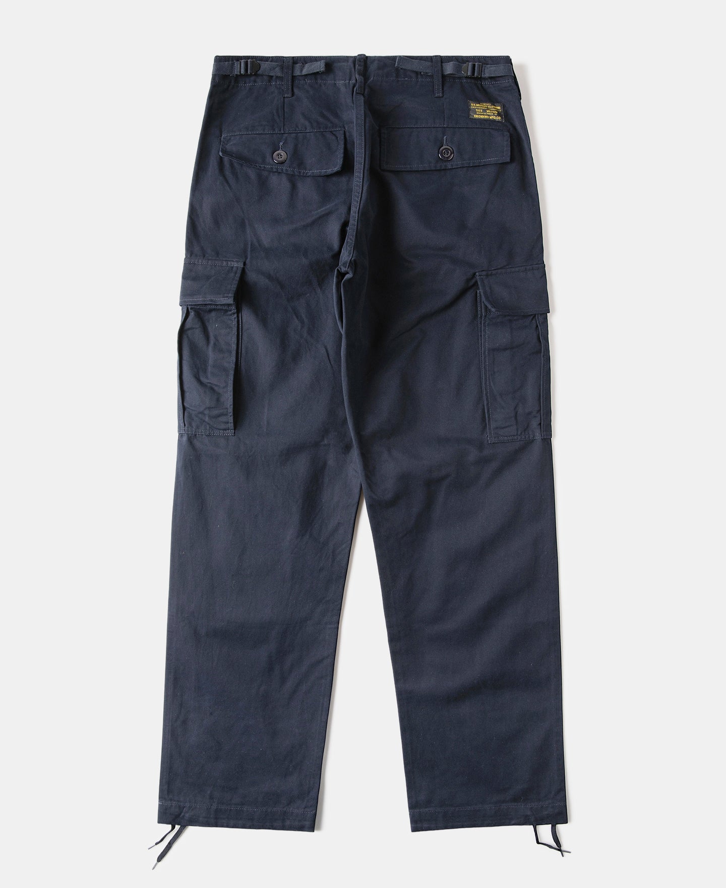 The Okonkwo Modified M-65 Cargo Pants reimagine the classic US Army M-65 field trousers with a modern fit. The silhouette has been slimmed down from the original oversized cut, making it more versatile for daily wear. Iconic details such as adjustable waist tabs and drawstring hems are retained, while the front pockets are streamlined without flaps. Rear pockets feature angled flaps for added depth, and the side cargo pockets conceal an extra compartment for storing small essentials like a lighter.
